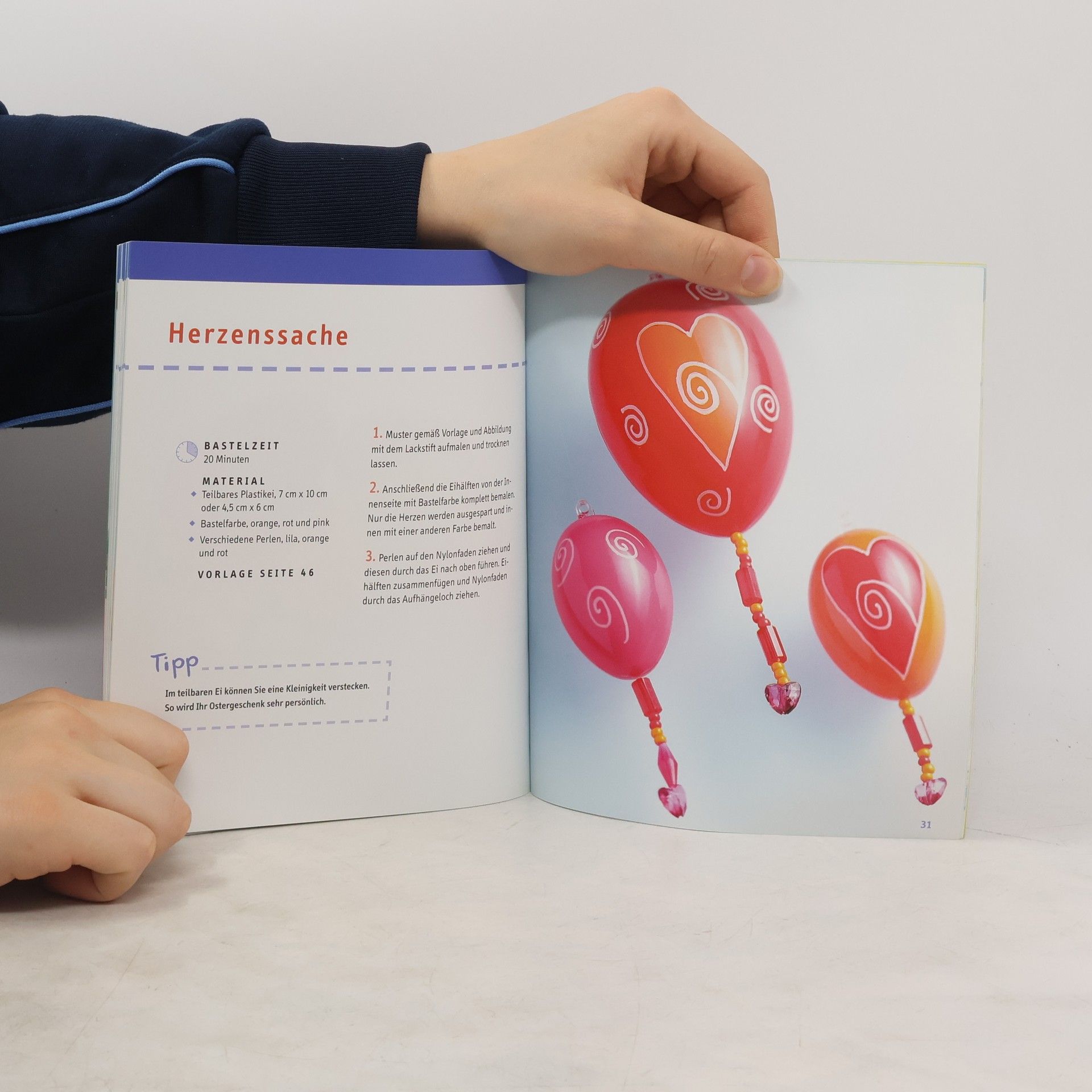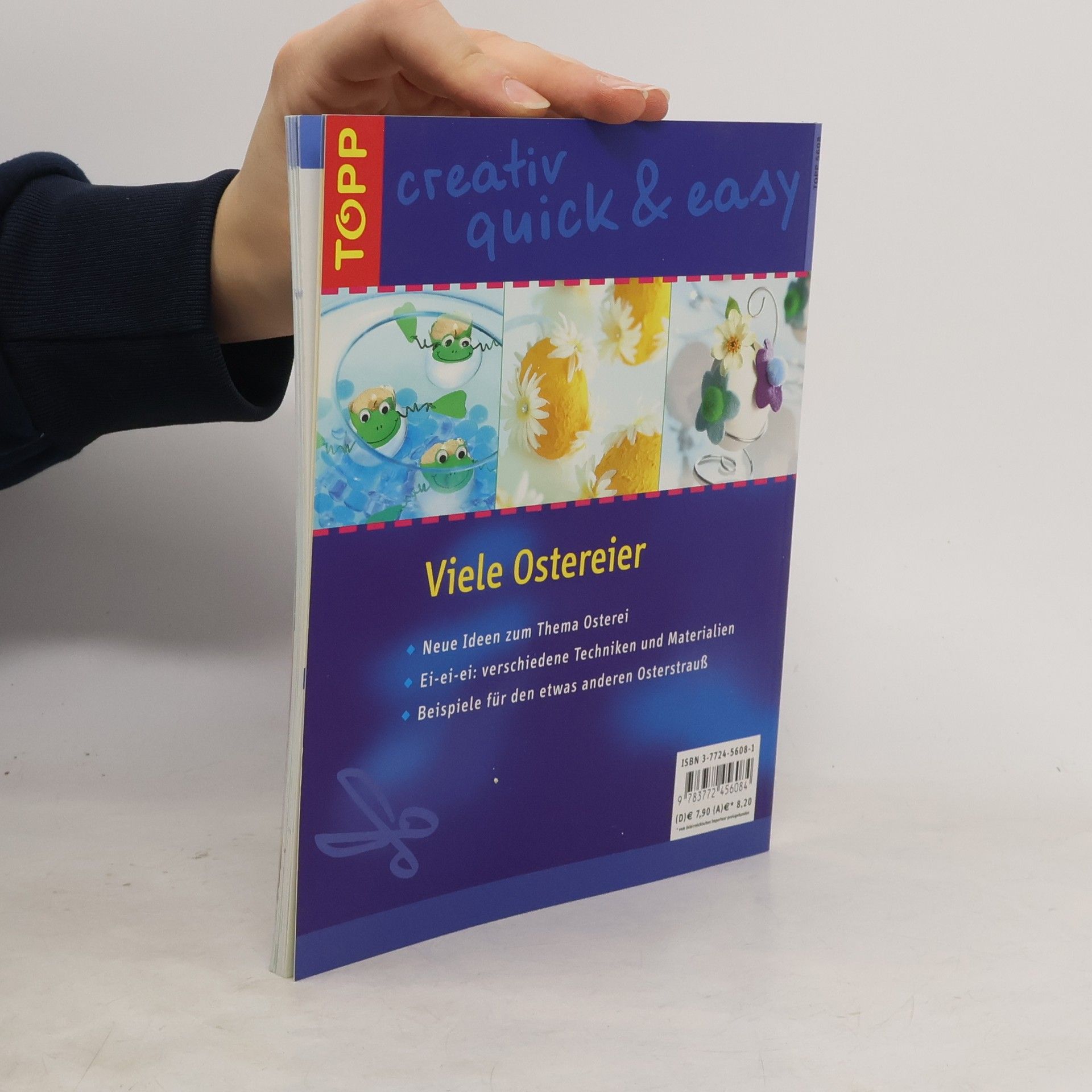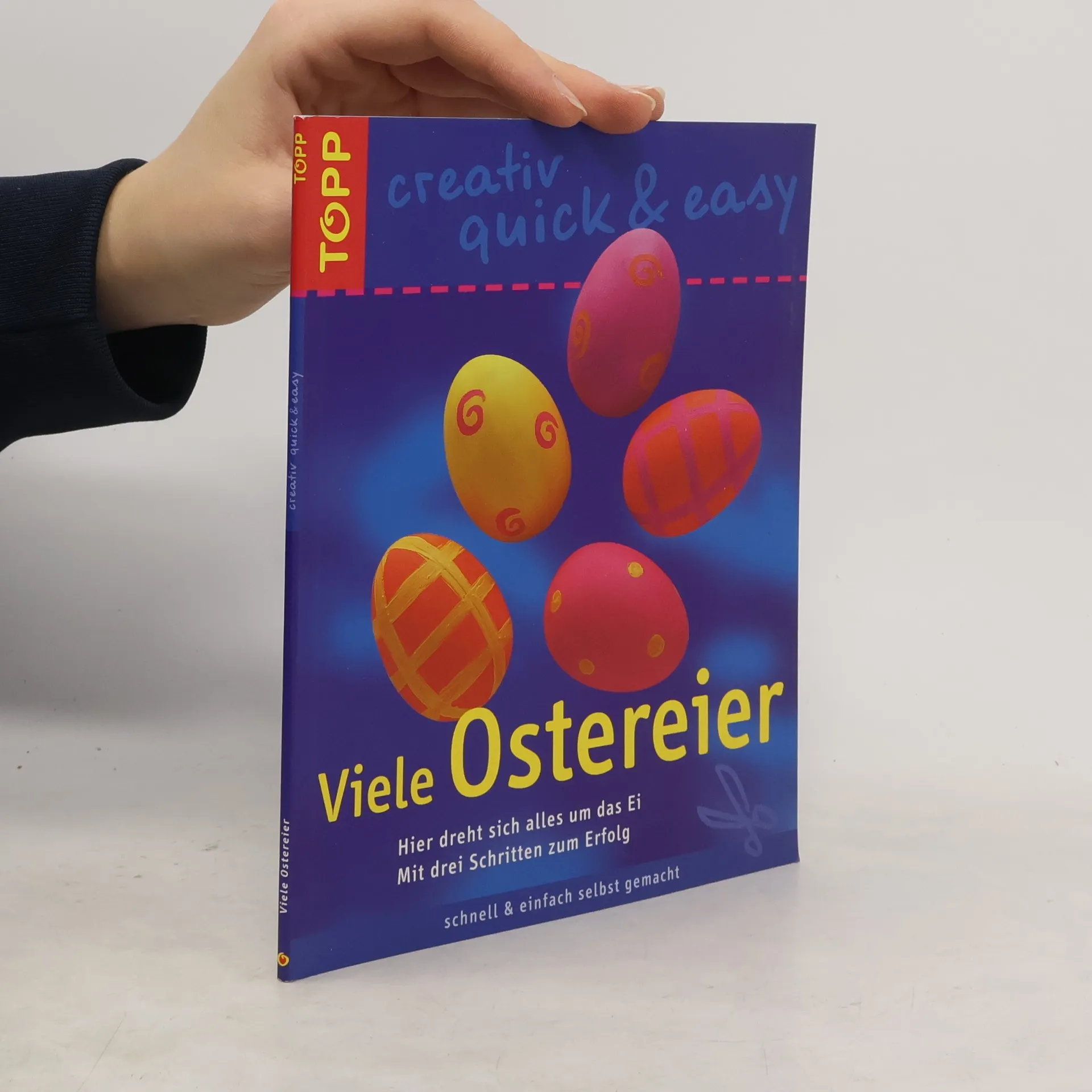 Eingeführte Reihe. Vorgestellt werden Ostereier in allen Variationen, bearbeitet mit unterschiedlichen Techniken und Materialien: Eivasen, Eierkerzen, Eierkränze, bemalte Eier (Batik, Windowcolor), beklebte Eier (Faserseide, Jute) ... In dieser Reihe s. auch: "Geschenke schnell verpackt", "Ideen fürs Kinderzimmer" (in dieser Nr.). (2