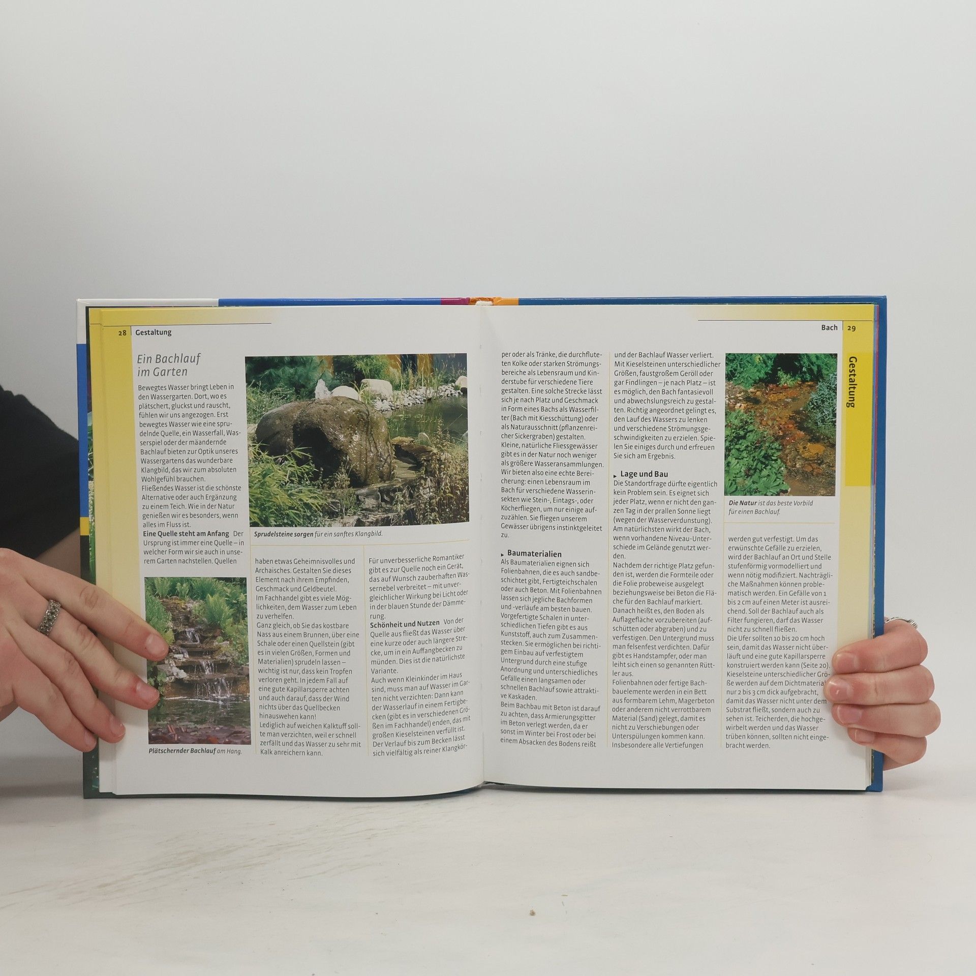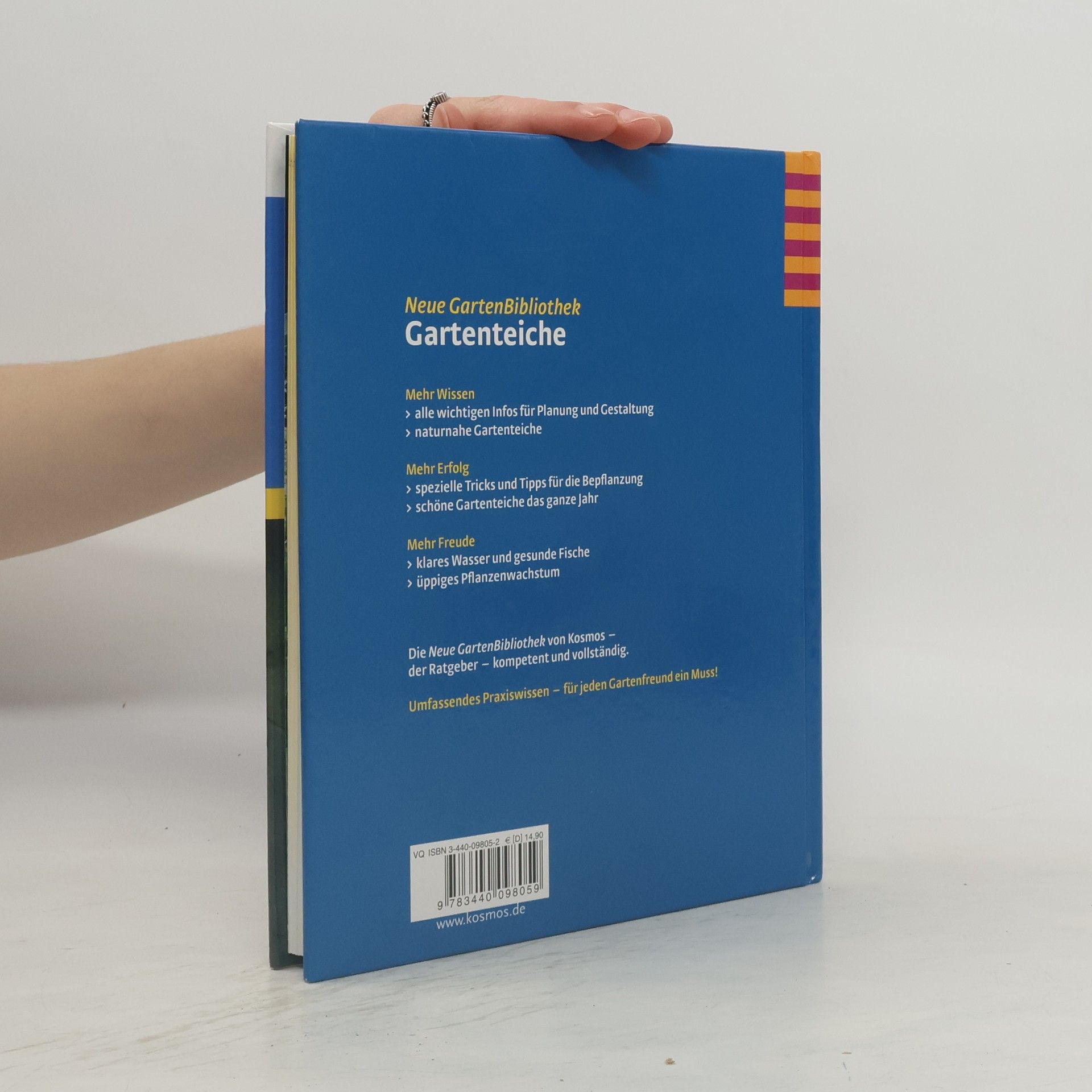 Vorgestellt werden naturnahe Teichvarianten (Eigenbau, Folien-, Fertig- und Moorteich, Teiche im Hochbau und am Hang, Miniwassergärten etc.), deren Technik, Bepflanzung, Pflege, Standort u.a.; reich illustriert.