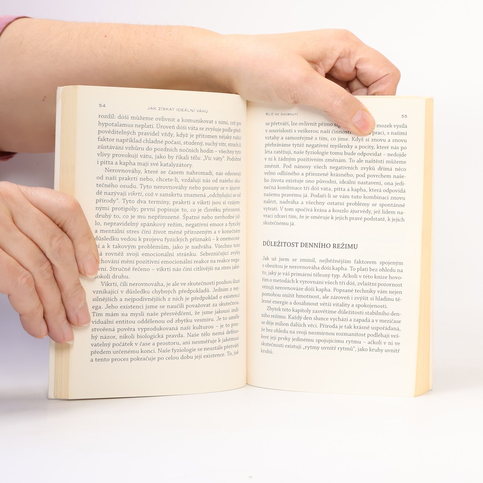 Deepak Chopra, M.D., nám tentokrát ve svojí knize nabízí podrobný program sestávající z jednoduchých a přirozených postupů založených na vyváženém propojení mysli a těla, jejichž prostřednictvím můžeme dosáhnout svojí ideální tělesné hmotnosti. Kniha obsahuje dotazník k určení tělesné konstituce vycházející z tradiční indické lékařské vědy známe jako ájurvéda. Ájurvédské chápání lidského organismu je nesmírně hluboké. Seznámení se s tímto pojetím a vyplnění zmíněného dotazníku nám okamžitě otevírá přístup k pět tisíc let staré nauce o lidském zdraví. Na základě získaných vědomostí si čtenář, možná poprvé v životě, bude schopen stanovit, jaké jsou jeho skutečné tělesné potřeby a rytmy. Naučí se rozpoznávat, v čem tyto rytmy narušuje a jak je obnovit. A konečně získá prostředky k dosažení své ideální tělesné hmotnosti, aniž by musel procházet jakýmkoli fyzickým utrpením či stresem.