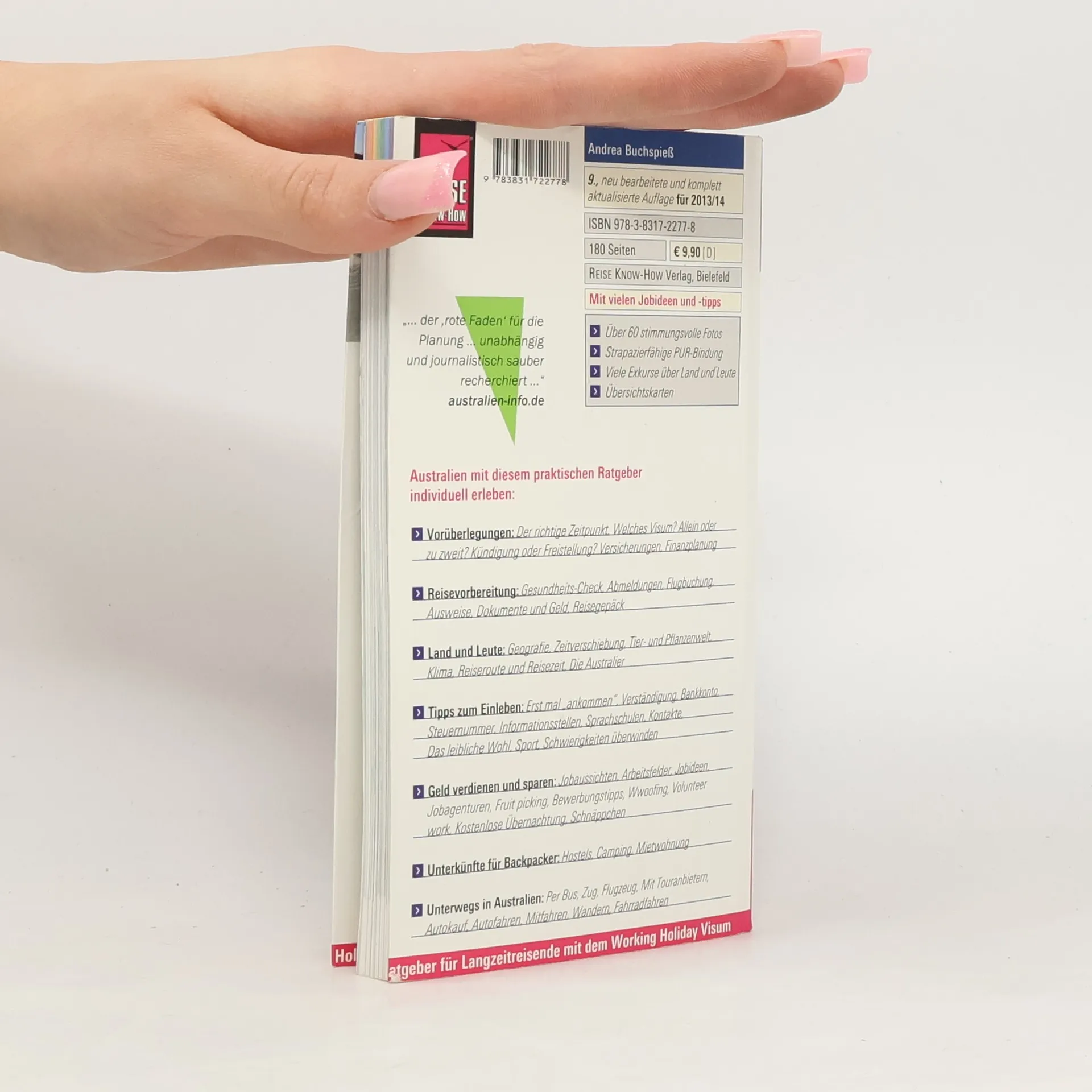 Der Traum von Australien kann auch mit kleiner Reisekasse wahr werden. Wie man einen längeren Aufenthalt auf dem fünften Kontinent gut vorbereiten, finanzieren und intensiv erleben kann, steht in diesem aktuellen und umfassenden Handbuch. Es unterstützt bei der Reiseplanung und den Ausreiseformalitäten, gibt Tipps zum Einleben und zur Jobsuche und hilft, den Reisealltag zu bewältigen. +++ Aus dem Inhalt: - Vorüberlegungen: Der richtige Zeitpunkt, Welches Visum? Allein oder zu zweit? Kündigung oder Freistellung? Versicherungen, Finanzplanung. - Reisevorbereitung: Gesundheits-Check, Abmeldungen, Flugbuchung, Ausweise, Dokumente und Geld, Reisegepäck. - Land und Leute: Geografie, Zeitverschiebung, Tier- und Pflanzenwelt, Klima, Reiseroute und Reisezeit, Die Australier. - Tipps zum Einleben: Erst mal „ankommen“, Verständigung, Bankkonto, Steuernummer, Informationsstellen, Sprachschulen, Kontakte, Das leibliche Wohl, Ausgehen, Schwierigkeiten überwinden. - Geld verdienen und sparen: Jobaussichten, Arbeitsfelder, Jobideen, Jobagenturen, Fruit picking, Bewerbungstipps, Wwoofing, Volunteer work, Kostenlose Übernachtung, Schnäppchen. - Unterkünfte für Backpacker: Hostels, Camping, Mietwohnung, ... - Unterwegs in Australien: Per Bus, Zug und Flugzeug, Mit Touranbietern, Autofahren, Wandern, Fahrradfahren. +++ REISE KNOW-HOW - Reiseführer für individuelle Reisen