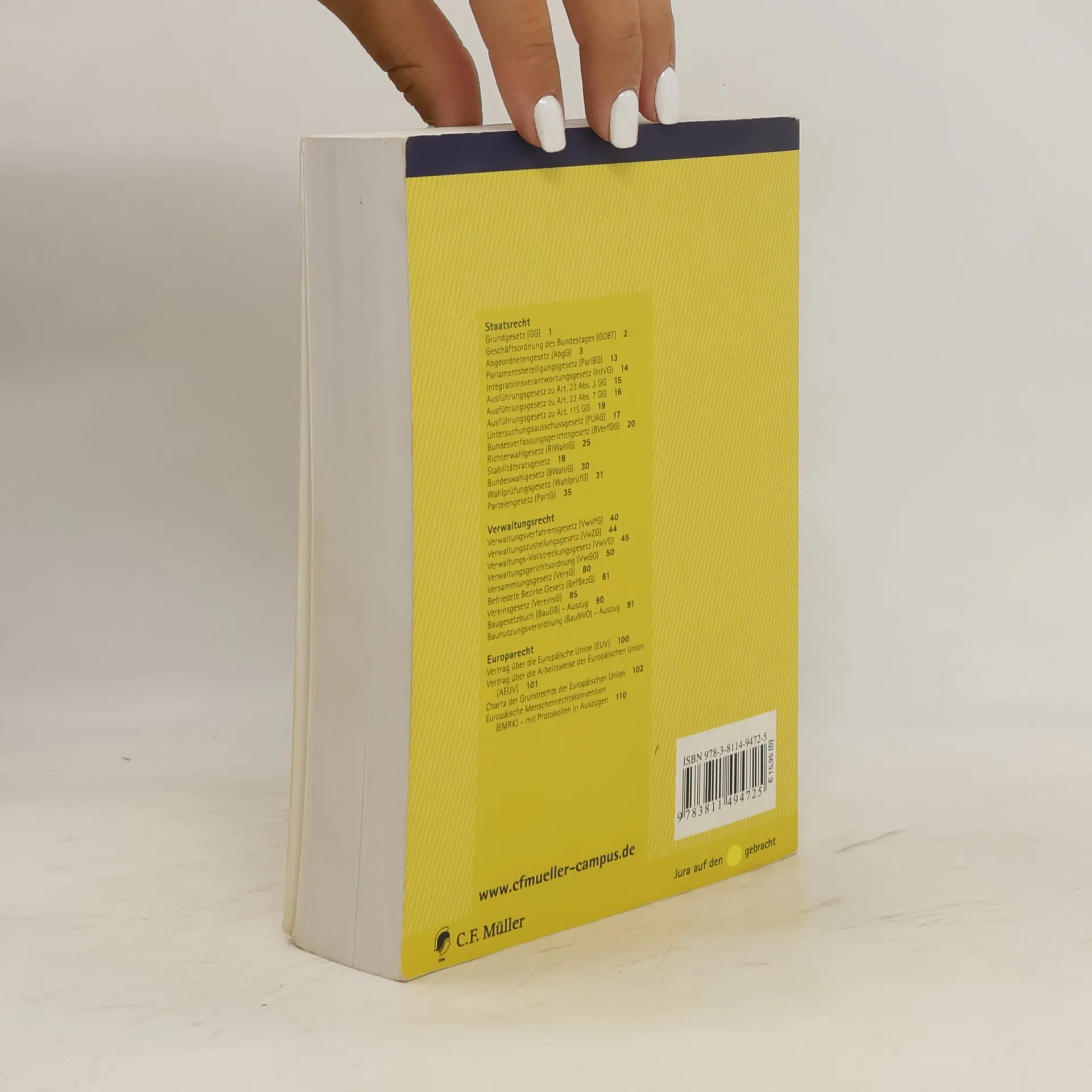 Aus dem Inhalt: Staatsrecht - Grundgesetz (GG); - Geschäftsordnung des Bundestages (GOBT); - Abgeordnetengesetz (AbgG); - Parlamentsbeteiligungsgesetz (ParlBG); - Integrationsverantwortungsgesetz (IntVG); - Ausführungsgesetz zu Art. 23 Abs. 3 GG; - Ausführungsgesetz zu Art. 23 Abs. 7 GG; - Untersuchungsausschussgesetz (PUAG); - Stabilitätsratsgesetz (StabiRatG); - Ausführungsgesetz zu Art. 115 GG (Art. 115-G) - Bundesverfassungsgerichtsgesetz (BVerfGG); - Richterwahlgesetz (RiWahlG); - Bundeswahlgesetz (BWahlG); - Wahlprüfungsgesetz (WahlprüfG); - Parteiengesetz (PartG); Verwaltungsrecht - Verwaltungsverfahrensgesetz (VwVfG); - Verwaltungszustellungsgesetz (VwZG); - Verwaltungs-Vollstreckungsgesetz (VwVG); - Verwaltungsgerichtsordnung (VwGO); - Versammlungsgesetz (VersG); - Befriedete Bezirke Gesetz (BefBezG); - Vereinsgesetz (VereinsG); - Baugesetzbuch (BauGB) - Auszug; - Baunutzungsverordnung (BauNVO) - Auszug; Europarecht - Vertrag über die Europäische Union (EUV); - Vertrag über die Arbeitsweise der Europäischen Union (AEUV); - Charta der Grundrechte der Europäischen Union; - Europäische Menschenrechtskonvention (EMRK mit Protokollen in Auszügen).