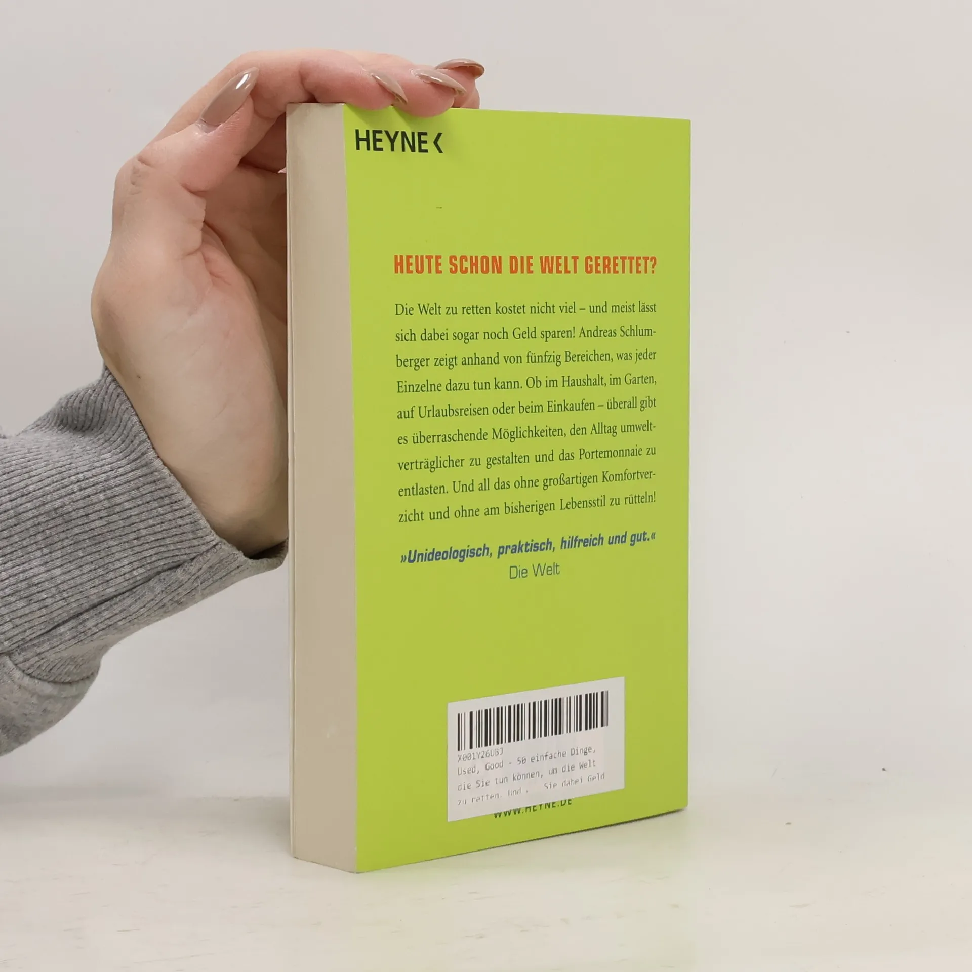 Heute schon die Welt gerettet? Manchmal ist es gar nicht schwer, etwas Gutes zu tun und dabei sogar noch Geld zu sparen. Andreas Schlumberger zeigt anhand von fünfzig Bereichen, was jeder Einzelne für die Umwelt tun kann. Ob im Haushalt, im Garten, auf Reisen oder beim Einkaufen – überall gibt es überraschende Möglichkeiten, den Alltag umweltverträglicher zu gestalten und das Portemonnaie zu entlasten. All das funktioniert ohne großartigen Komfortverzicht und ohne am bisherigen Lebensstil zu rütteln!