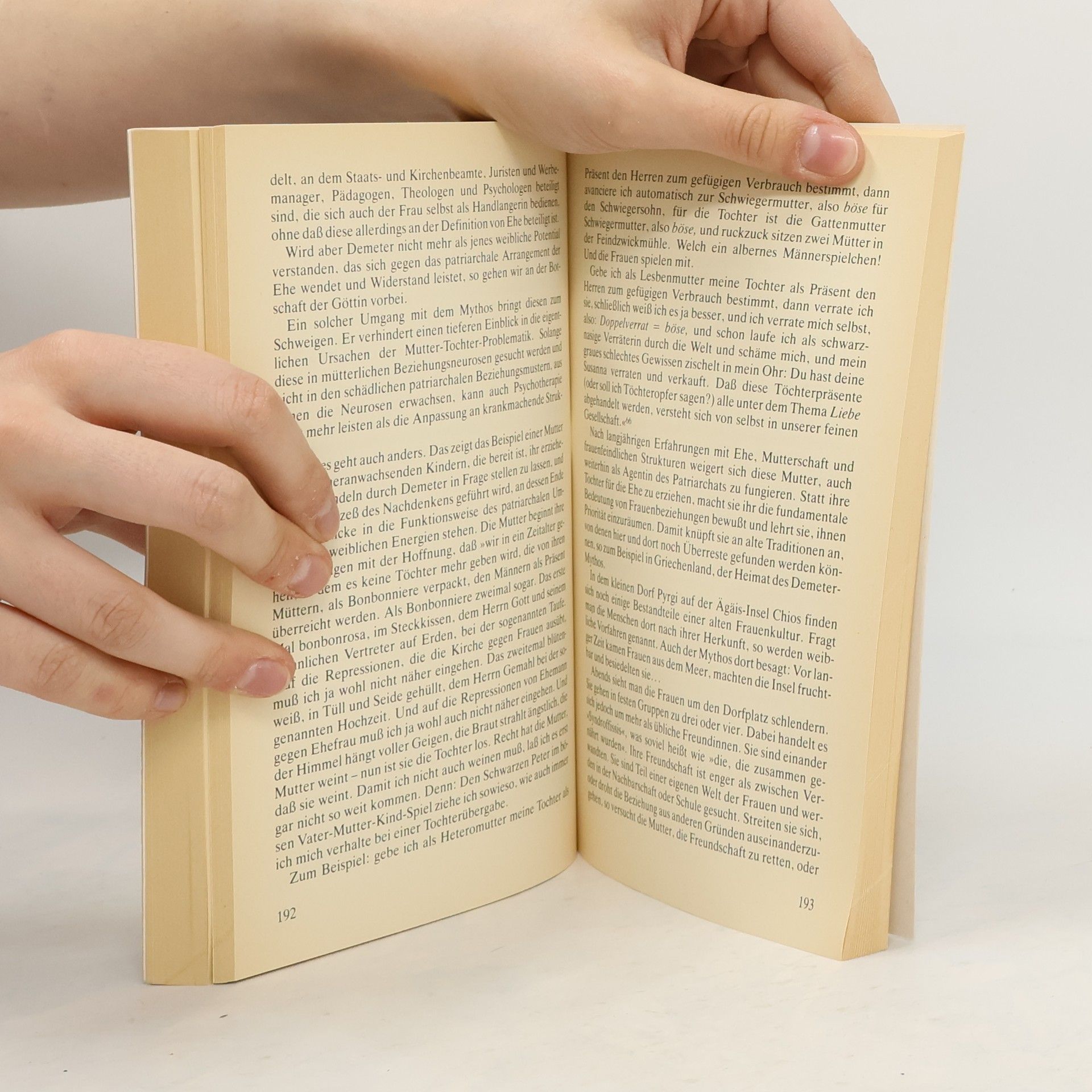 Das Konzept der Gleichberechtigung hat vielen Frauen zwar eine gewisse individuelle Freiheit gebracht, aber nur im Rahmen patriarchaler Strukturen. So regt Christa Mulack eine innerfeministische Diskussion über die Begriffe „Gleichberechtigung“ und „Gleichwertigkeit“ an, weil sie die tatsächlichen Verhältnisse eher verschleiern als verändern. Das Leugnen der biologisch begründeten Geschlechterdifferenz führt heute zu einer Selbstentfremdung der Frau, zumal die jüngste Forschung beweist, dass die Frau von der Natur eindeutig bevorzugt wird und die Frau lebenstüchtiger ist als der Mann. Ein Hindernis für die Frauenbewegung ist die latente Frauenfeindlichkeit selbst bei Frauen. Die Autorin zeigt drei Felder auf, wo deshalb Frauensolidarität besonders nötig ist: im Verhältnis der Mütter und Töchter, zwischen Lehrerinnen und Schülerinnen und in der erotischen Orientierung der Frau.