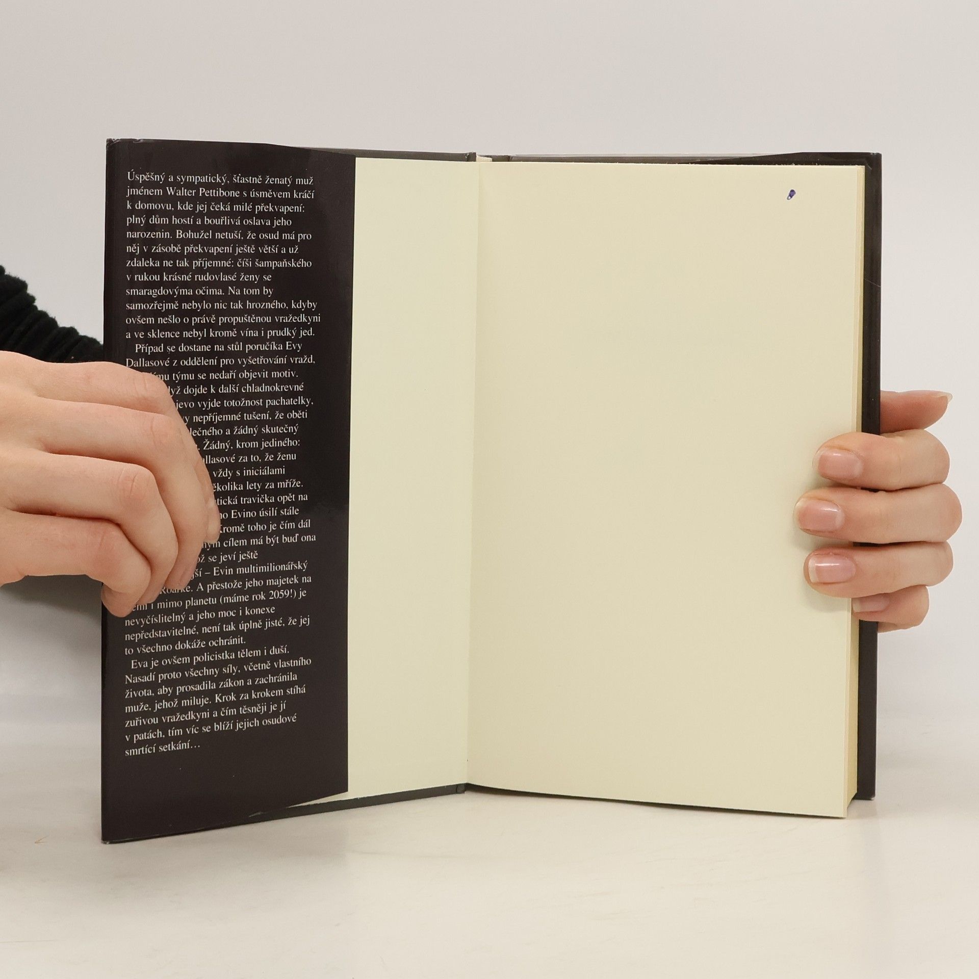 Úspěšný a šťastně ženatý muž jménem Walter Pettibone skončí otráven na oslavě svých vlastních narozenin. Případ dostane na stůl poručík Eva Dallasová, ale teprve když dojde k další chladnokrevné vraždě a najevo vyjde totožnost pachatelky, ukáže se, že skutečný motiv byl jen jeden: pomstít se Evě za to, že ženu mnoha jmen, avšak vždy s iniciálami J. D., poslala před několika lety za mříže. Nyní je ale psychopatická travička opět na svobodě a přes všechno Evino úsilí stále uniká spravedlnosti. Kromě toho je čím dál jasnější, že konečným cílem má být buď ona sama, anebo – což se jeví ještě pravděpodobnější – Evin multimilionářský manžel Roarke. A přestože jeho majetek na Zemi i mimo planetu (máme rok 2059!) je nevyčíslitelný a jeho moc i konexe nepředstavitelné, není tak úplně jisté, že jej to všechno dokáže ochránit. Eva však nasadí všechny síly, včetně vlastního života, aby zachránila muže, jejž miluje...