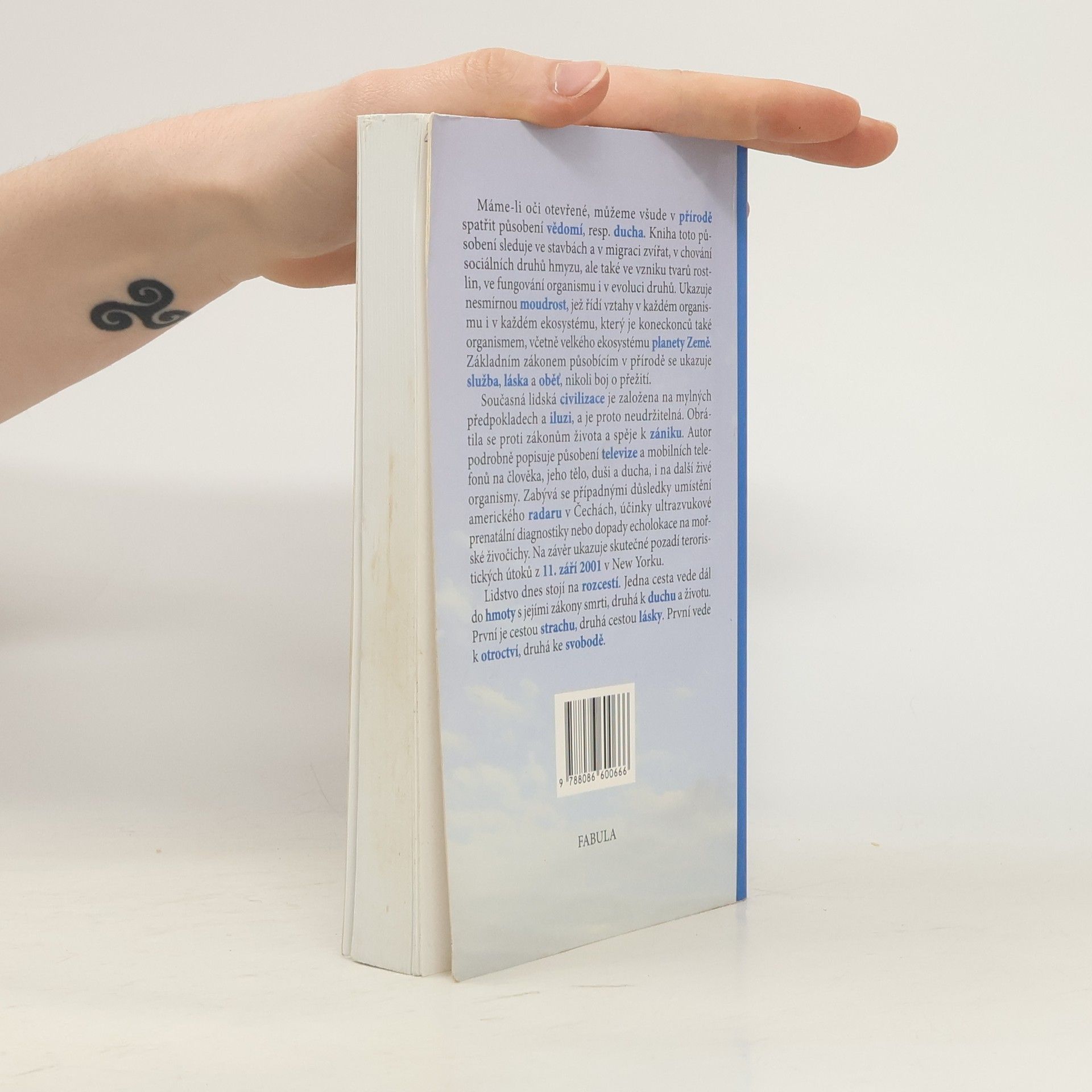 I v přírodě, nejen v lidské společnosti, působí velká inteligence a moudrost. Při pozornějším pohledu navíc zjistíme, že základním zákonem přírody není boj o přežití, nýbrž symbióza a vzájemná služba, láska a oběť. Lidská společnost však uvěřila, že konkurence a boj povedou k pokroku a obecnému blahu, postavila se proti zákonitosti řádu a spěje nutně ke svému zániku. Na příkladech televize, mobilních telefonů, instrumentalizovaného porodu nebo událostí z 11. září 2001 autor ukazuje rozcestí, na němž se dnes lidstvo jako celek i každý z nás nachází: jedna cesta, cesta strachu, vede k otroctví, druhá, cesta lásky, ke svobodě.
