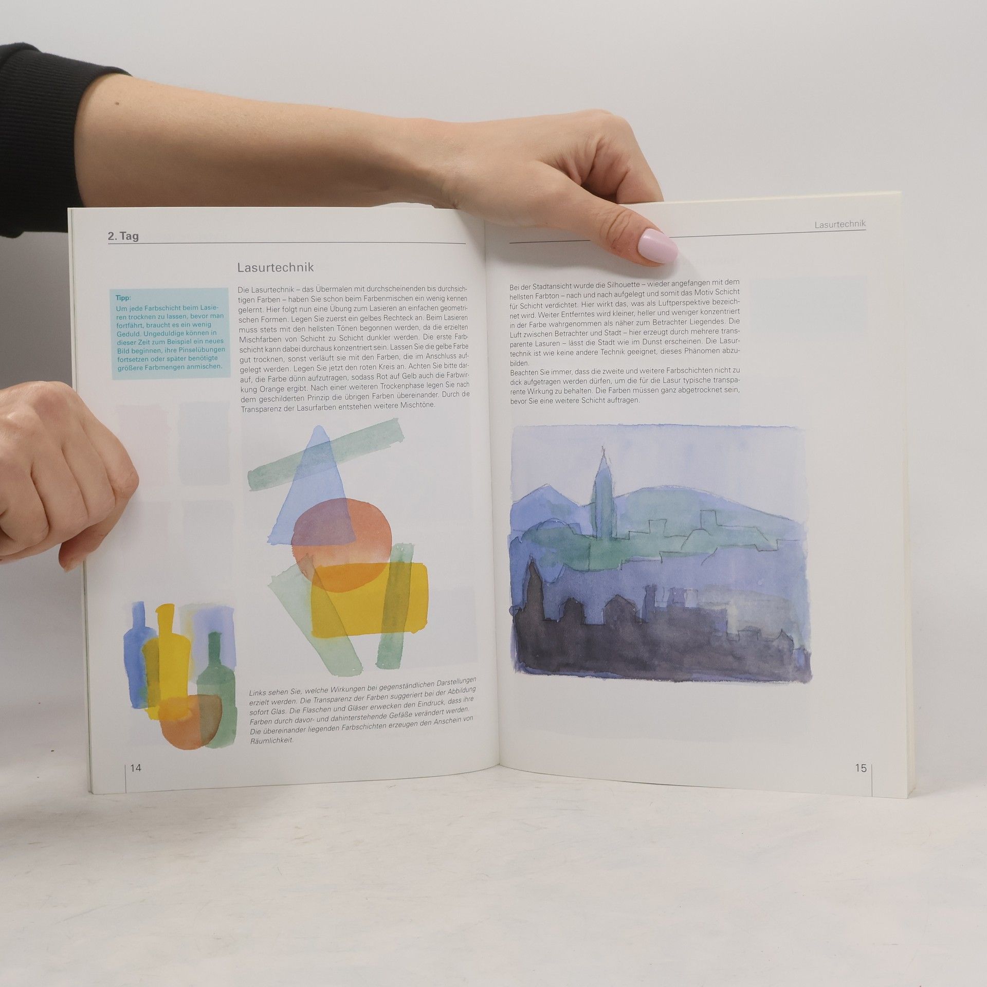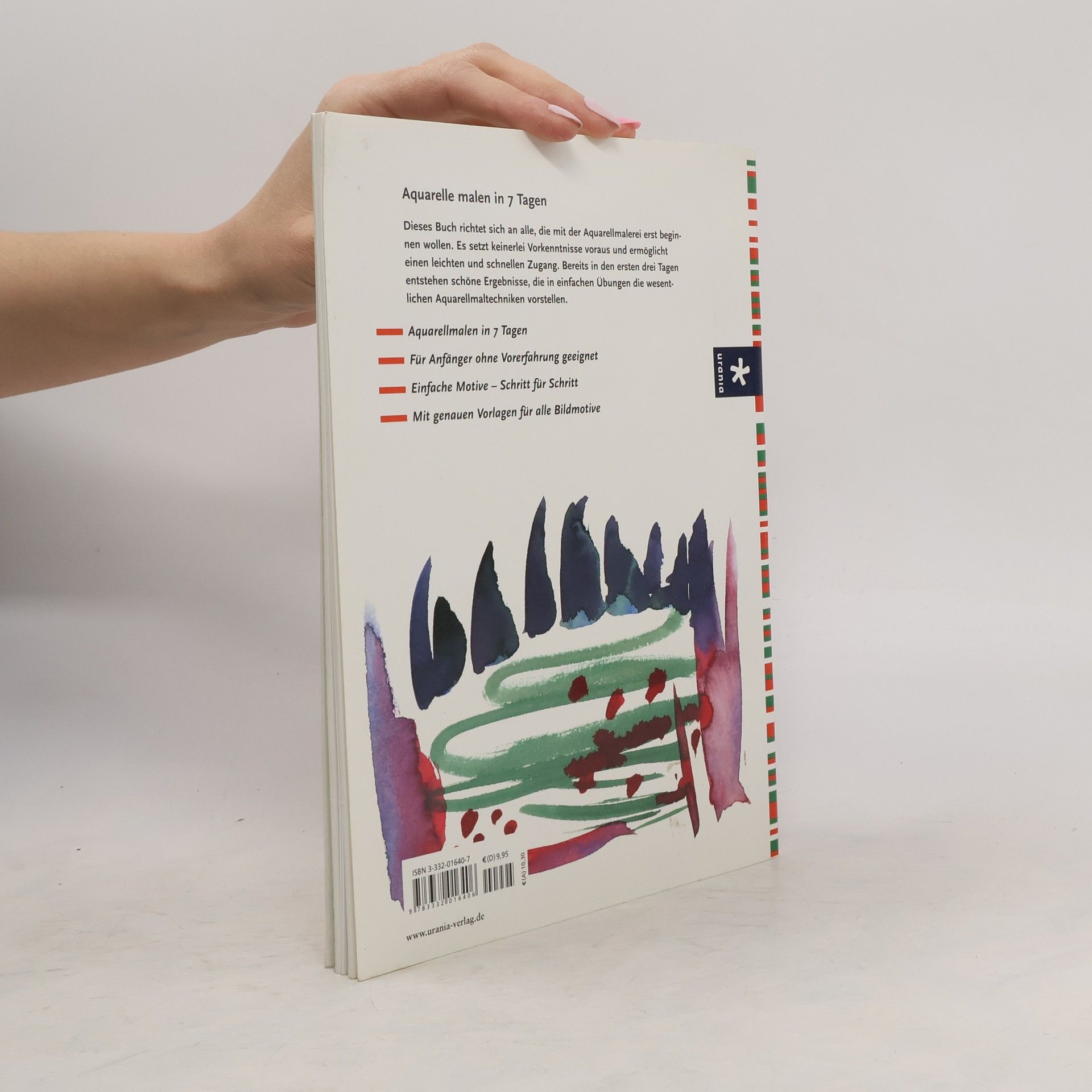 1. Tag: Kennenlernen der Farben, Papier und Pinsel und erstes Ausprobieren 2. Tag - 4. Tag: Farben mischen, Farbverläufe, Nass in Nass, … und erstes Motiv Bild à la Klee (Vorlagenskizzen eingeheftet). 5. – 7. Tag: 3 weitere Motive, die auf bereits Gelerntem aufbauen.
