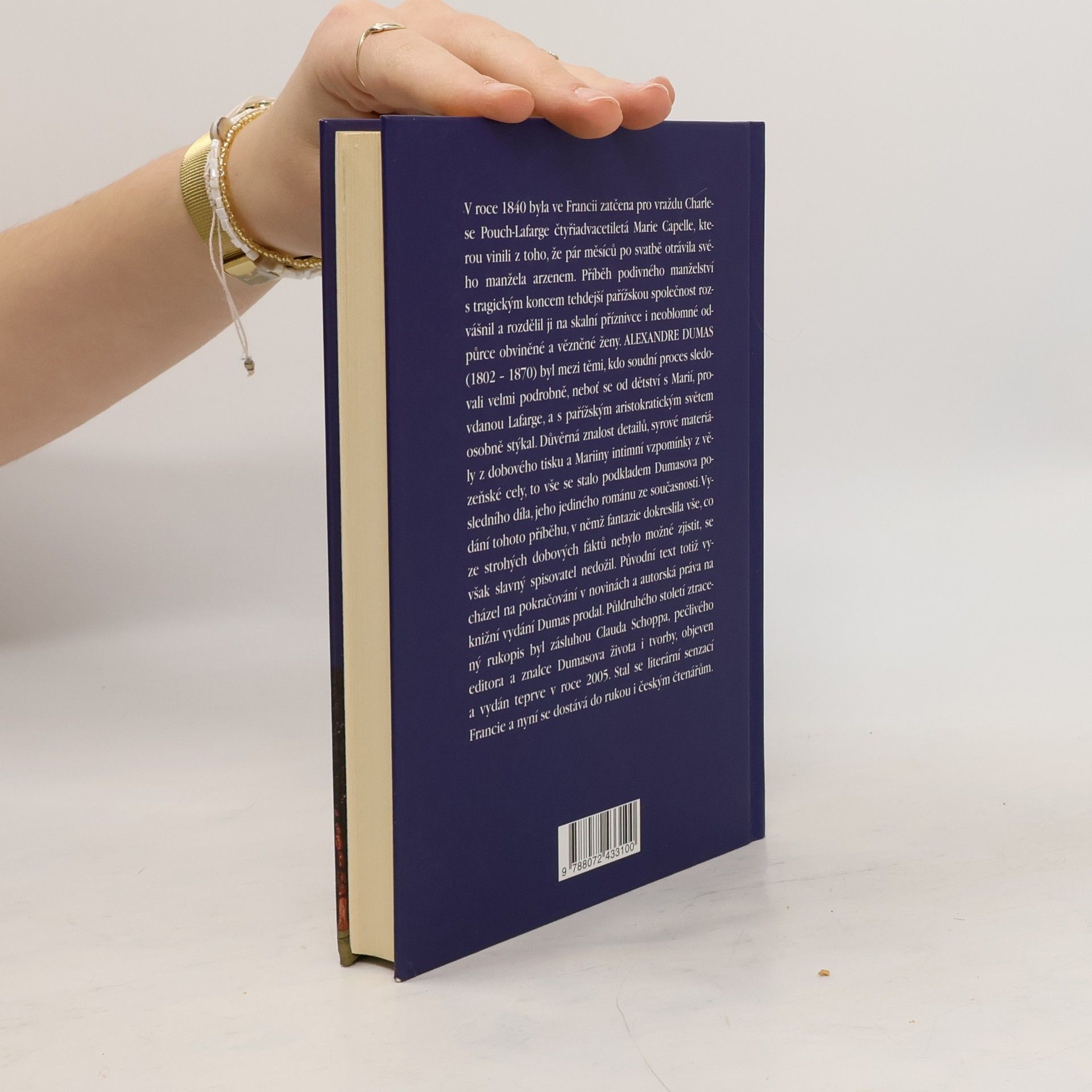 První české vydání Dumasova posledního románu. V roce 1840 byla ve Francii zatčena pro vraždu Charlese Pouch-Lafarge mladá krásná žena Marie Capelle, kterou vinili z toho, že pár měsíců po svatbě otrávila svého manžela arzenem. Její záhadný příběh tehdejší pařížskou společnost rozvášnil a rozdělil. Alexandre Dumas byl mezi těmi, kdo proces sledovali velmi podrobně, neboť se s paní Lafarge a celým aristokratickým světem osobně znal. Důvěrná znalost detailů, syrové materiály z dobového tisku a Mariiny intimní vzpomínky z vězeňské cely, to vše se stalo podkladem Dumasova posledního díla, jeho jediného románu ze současnosti, jehož vydání se však nedožil. Půldruhého století ztracený rukopis byl vydán teprve v roce 2005 a stal se literární senzací Francie.