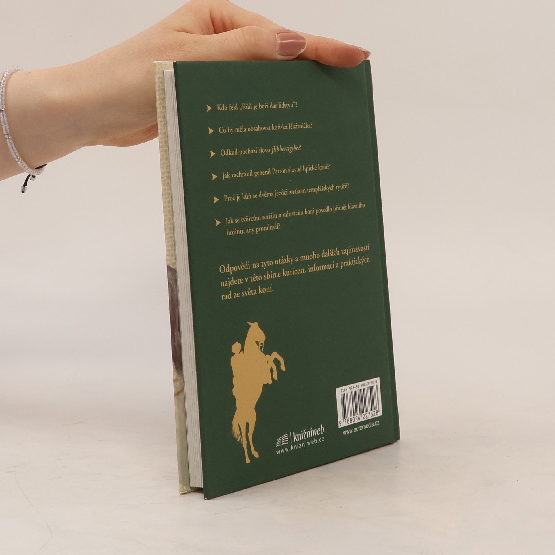 Dárková knížka, kterou ocení každý milovník koní. Hravou a zábavnou formou jsou v ní shrnuty vážné i nevážné informace snad o všem, co by někdo mohl chtít o těchto pozoruhodných zvířatech, která člověka provázejí odnepaměti, vůbec vědět. Kromě základních údajů o původu, anatomii, chovu koní, různých koňských plemenech, koňských sportech a podobně objevíte i zajímavé kuriozity, které jinde nenajdete. Věděli jste například, proč se hříbata rodí v noci? Co je to Galvaynova rýha? Umí kůň plavat? Nechybí informace o slavných osobností proslulých zálibou v koních, k nimž patřil například americký generál Grant, anglická královna Alžběta II. nebo Elvis Presley. V knize najde i výčet slavných knih a filmů, v nichž vystupují koně, od Rosinanty Dona Quijota po Vinnetouova Hatátitlu, seznam písní o koních, tabulky největších dostihových vítězů a podobně zvídavého čtenáře nepochybně zaujmou i přísloví, rčení či pranostiky o koních, posbírané po celém světě, a podivuhodné či neobvyklé skutečné příběhy, v nichž hrají koně hlavní roli. Půvabně zpracovaná publikace zaujme, pobaví i potěší.
