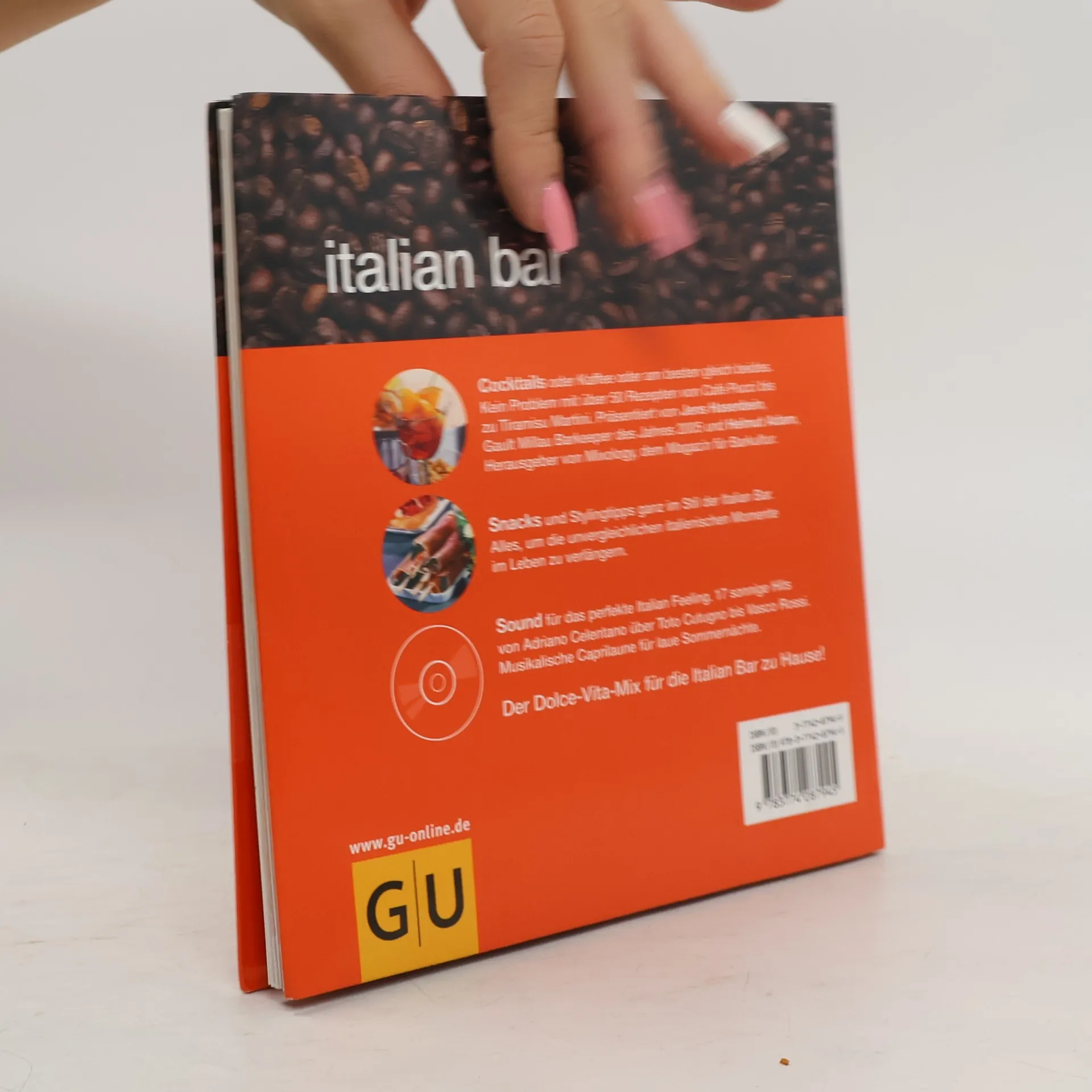 Morgens vor der Arbeit flink noch einen Espresso und ein Hörnchen, mittags dann ein Tramezzini mit einem Campari Soda und abends mit allen Amici und Ragazzi auf einen schicken Cocktail – Bienvenuto in der Italian Bar! In Italian Bar gibt es alles was für die italienischen Momente im Leben braucht und das rund im die Uhr: Rezepte für die beliebtesten Kaffeespezialitäte, leckere Snacks und für 50 Cocktails a l’italiana; von Klassikern wie Americano oder Bellini zu trendigen Drinks wie Hazelnut Martini oder Cosmopolitan a Fragola. Und fürs richtige Dol-ce-vita-Ambiente sorgen viele Inszenierungstipps und natür-lich die passende Musik: Gepflegter Italopop und gefühlvolle Balladen von Eros Ramazotti, Adriano Celentano, Gianna Nanini und Paolo Conte.