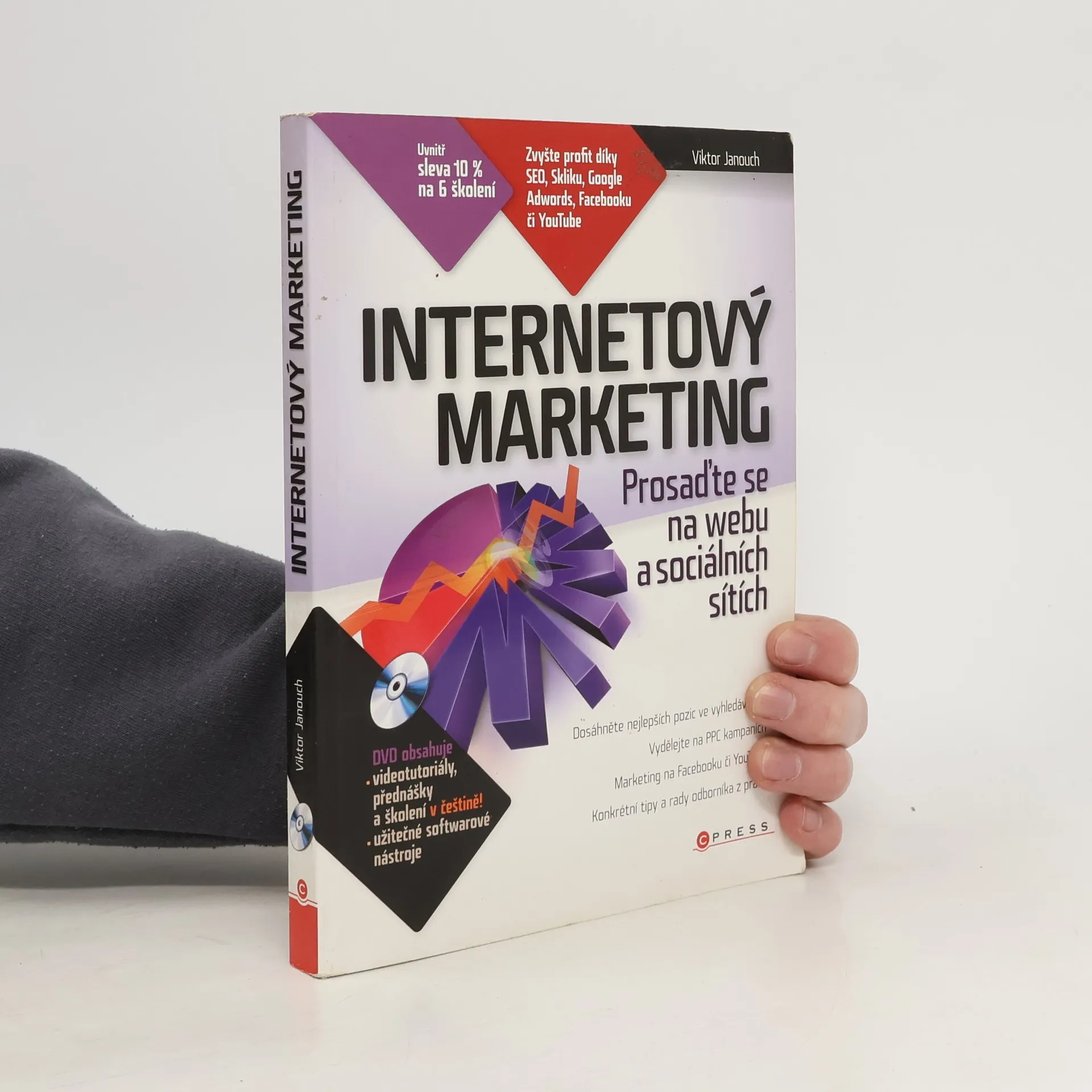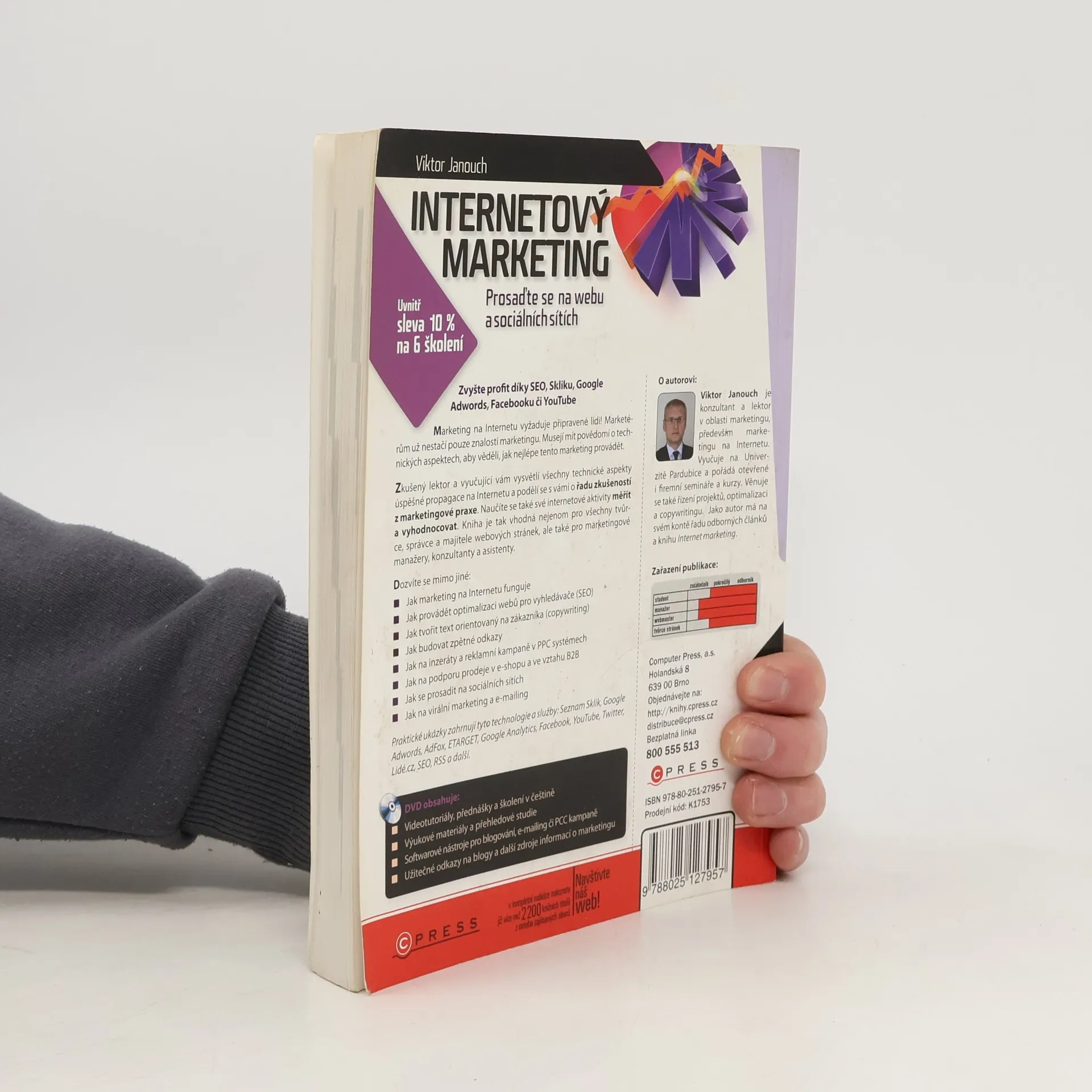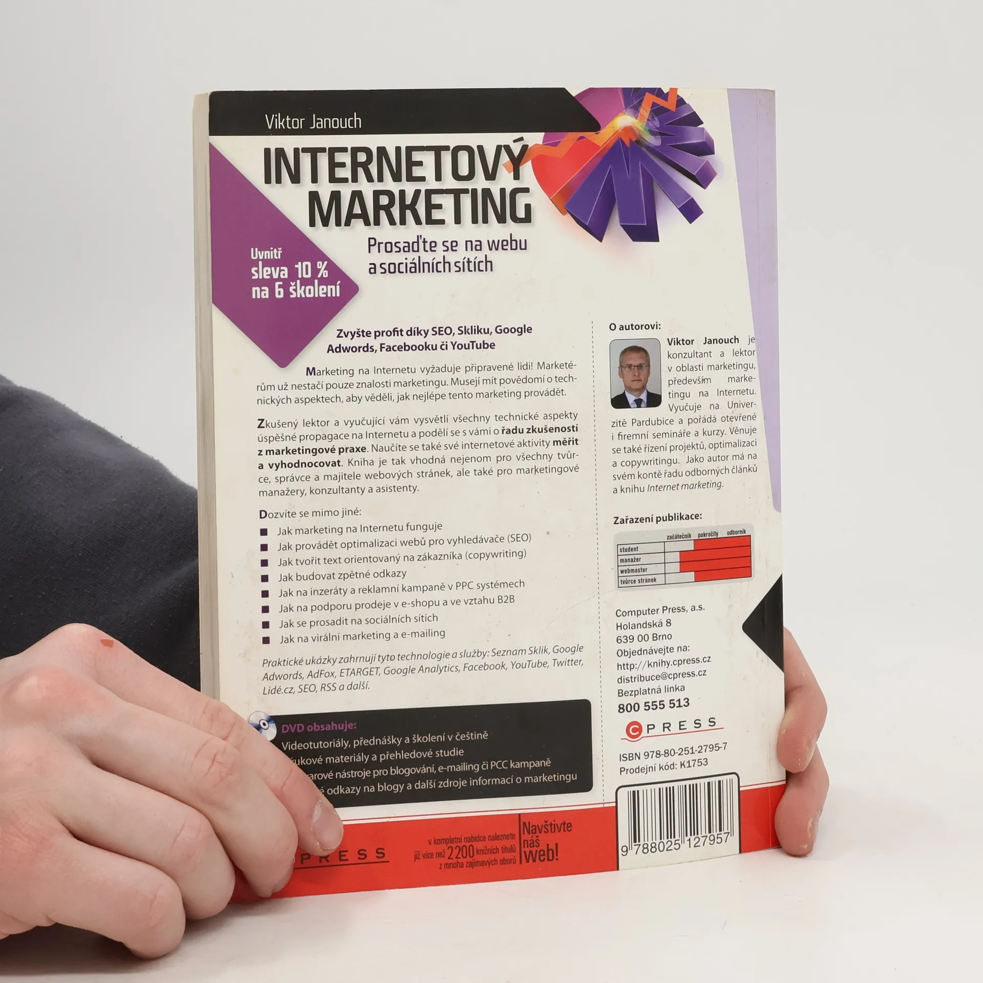 Zvyšte svůj profit díky SEO, Skliku, Google Adwords, Facebooku či YouTube! Marketing na Internetu vyžaduje připravené lidi, kteří mají nejen znalosti marketingu, ale také povědomí o technických aspektech. Zkušený lektor vám vysvětlí všechny technické aspekty úspěšné propagace a podělí se o cenné zkušenosti z praxe. Naučíte se měřit a vyhodnocovat své internetové aktivity. Kniha je určena tvůrcům, správcům a majitelům webových stránek, marketingovým manažerům, konzultantům a asistentům. Dozvíte se, jak marketing na Internetu funguje, jak provádět optimalizaci webů pro vyhledávače (SEO), jak tvořit texty orientované na zákazníka (copywriting), budovat zpětné odkazy, spravovat inzeráty a reklamní kampaně v PPC systémech, podporovat prodej v e-shopu a ve vztahu B2B, prosadit se na sociálních sítích, a jak na virální marketing a e-mailing. Praktické ukázky zahrnují technologie a služby jako Seznam Sklik, Google Adwords, Google Analytics, Facebook a další. DVD obsahuje videotutoriály, školení, výukové materiály a užitečné odkazy na blogy a další zdroje informací o marketingu. Autor, Viktor Janouch, je konzultant a lektor v oblasti marketingu, vyučuje na Univerzitě Pardubice a má na svém kontě řadu odborných článků.