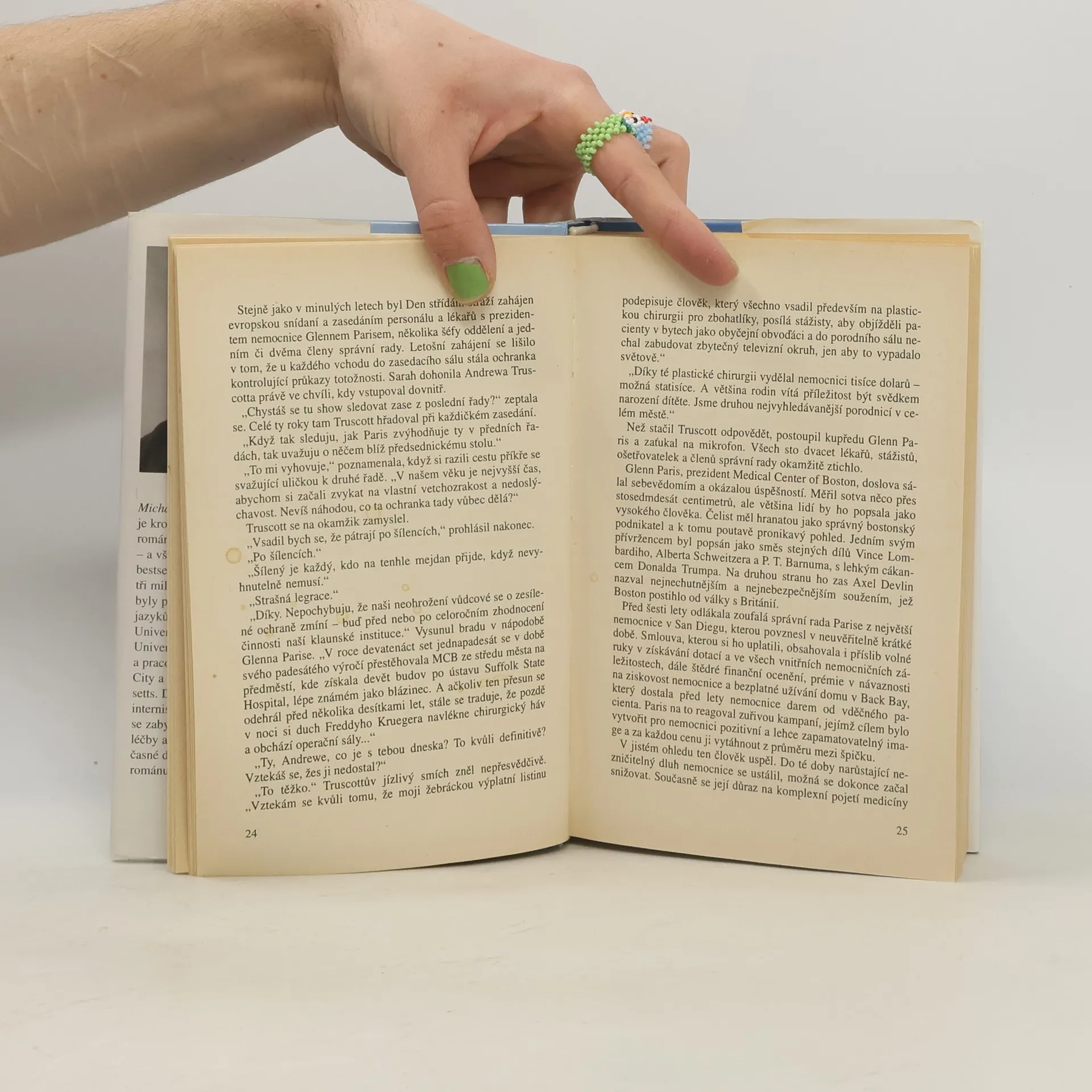 Hlavní hrdinka románu - mladá úspěšná doktorka, vyznávající kromě tradičních lékařských postupů i zajímavé prvky přírodní medicíny - se náhle ocitá ve víru událostí, hrozících zničit její slibnou kariéru. Má proti sobě mocné nepřátelé - tisk, ničeho neštítící kolegy a sílu peněz. Krůček po krůčku pak autor rozmotává změt intrik, zakrývající mnohamiliónové obchody s lidským zdravím i životy. Odhaluje pravou tvář herců tohoto dramatu, vodí nás nemocničními sály, advokátními poradnami i čínskou čtvrtí, plnou drog a násilí.
