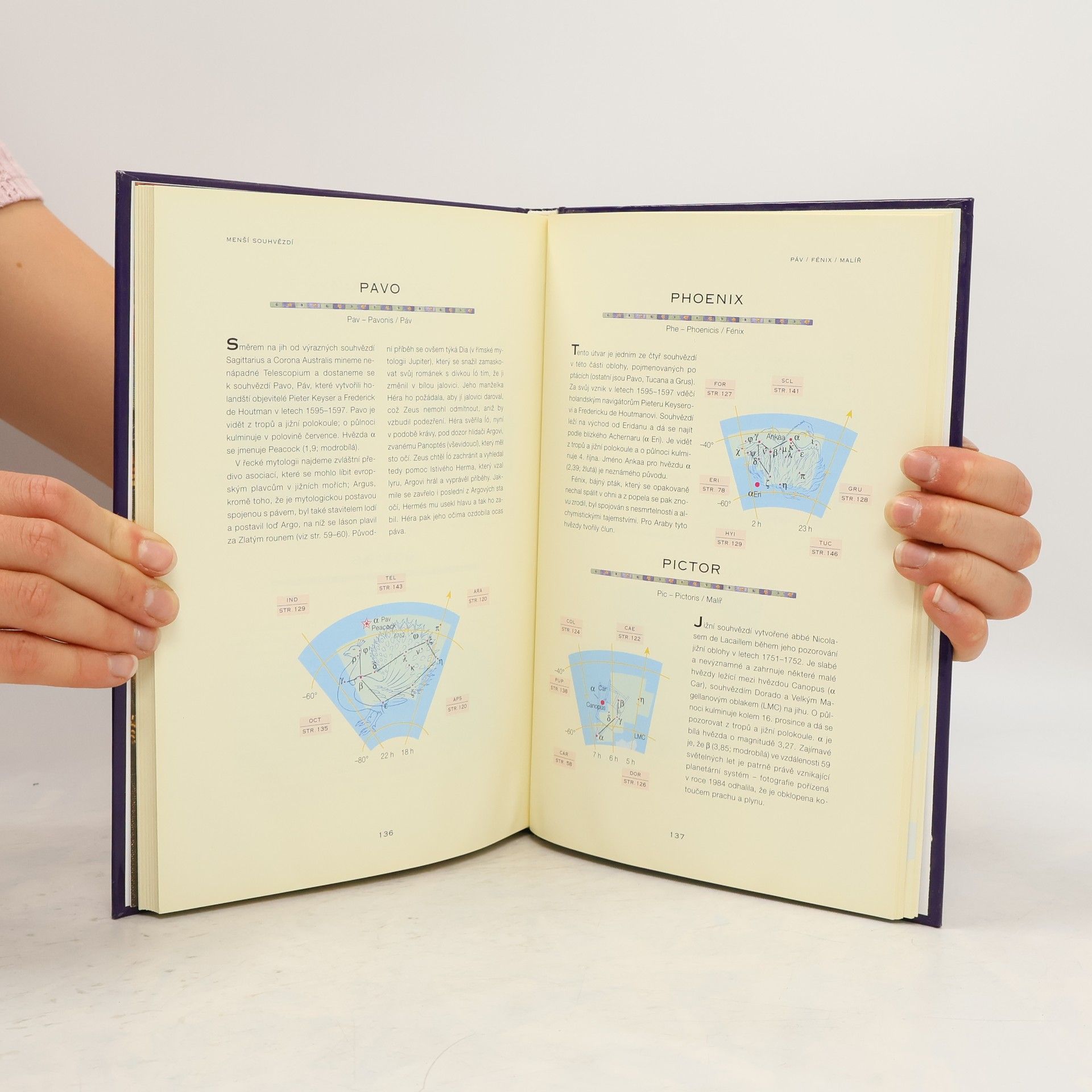 Ilustrovaný průvodce noční oblohou. Vyhledávání souhvězdí a hvězd podle snadno rozeznatelných bodů. Kniha je rozdělena na tyto části: Noční obloha (základní principy pozorování oblohy), Mapy noční oblohy (mapy noční oblohy severní a jižní polokoule), Hlavní souhvězdí (40 nejdůležitějších souhvězdí pozorovatelných pouhým okem s ilustracemi), Menší souhvězdí (48 souhvězdí), Putující hvězdy (původ jmen a mýty spojené se Sluncem, Měsícem a planetami sluneční soustavy), Dodatky (jak najít hvězdy a planey, nejvhodnější data pozorování Merkuru, hvězdné tabulky), slovníček, rejstřík, bibliografie.