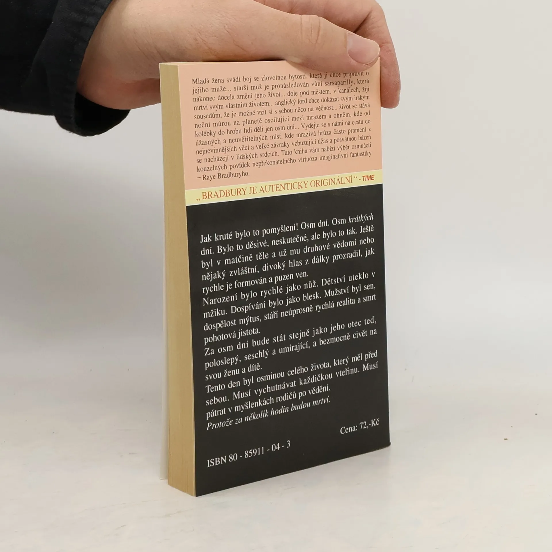 Mladá žena svádí boj se zlovolnou bytostí, která ji chce připravit o jejího muže… starší muž je pronásledován vůní sarsaparilly, která nakonec docela změní jeho život… dole pod městem, v kanálech, žijí mrtví svým vlastní životem… anglický lord chce dokázat svým irským sousedům, že je možné vzít si s sebou něco na věčnost… život se stává noční můrou na planetě oscilující mezi mrazem a ohněm, kde od kolébky do hrobu lidi dělí jen osm dní… Vydejte se s námi na cestu do úžasných a neuvěřitelných míst, kde mrazivá hrůza často pramení z nejnevinnějších věcí a velké zázraky vzbuzující úžas a posvátnou bázeň se nacházejí v lidských srdcích. Tato kniha vám nabízí výběr osmnácti kouzelných povídek nepřekonatelného virtuoza imaginativní fantastiky – Raye Bradburyho. Vybrali a sestavili Miroslav Kocián a Bohuslav Svoboda.