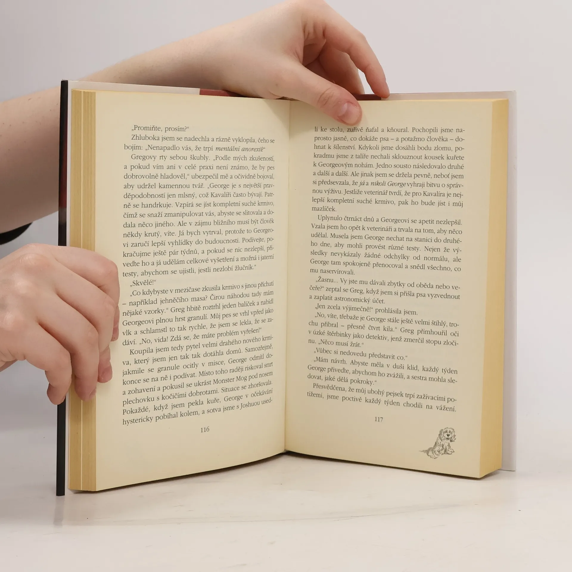 Seznamte se: George, Kavalír King Charles španěl s kouzelnou povahou, vzhledem filmové hvězdy a vášnivou zálibou žvýkat papír. V létě 1998 v rozmezí dvou týdnů ztratila autorka manžela i otce a jí i jejímu osmiletému synkovi Joshuovi připadal svět náhle bezútěšný a pustý. A právě tehdy do jejich života přiskotačil George. Roztomilý přítulný pejsek s heboučkou srstí a legračním výrazem neprodleně vzal věci do svých tlapek a Judith brzy poznala, že získat ztracené postavení vedoucího smečky je někdy opravdu obtížné, ne-li zhola nemožné. George má totiž jako pravý aristokrat své zásady, kterých se nemíní vzdát. Odmítá žrát cokoli jiného než pečené kuře, chodit pěšky, spát sám a vpustit do blízkosti své paničky jakéhokoli muže - ovšem kromě místního veterináře. Toho si naopak oblíbí tak nesmírně, až se účty za ošetření šplhají do závratných výšek. Humorné i dojímavé vyprávění o nemožném, avšak zbožňováníhodném Georgeovi, nákladnějším než ferrari, o jeho dobrodružstvích a přečinech a také o zázračném způsobu, jímž pomohl vyplnit velkou trhlinu v Juditině a Joshuově životě.