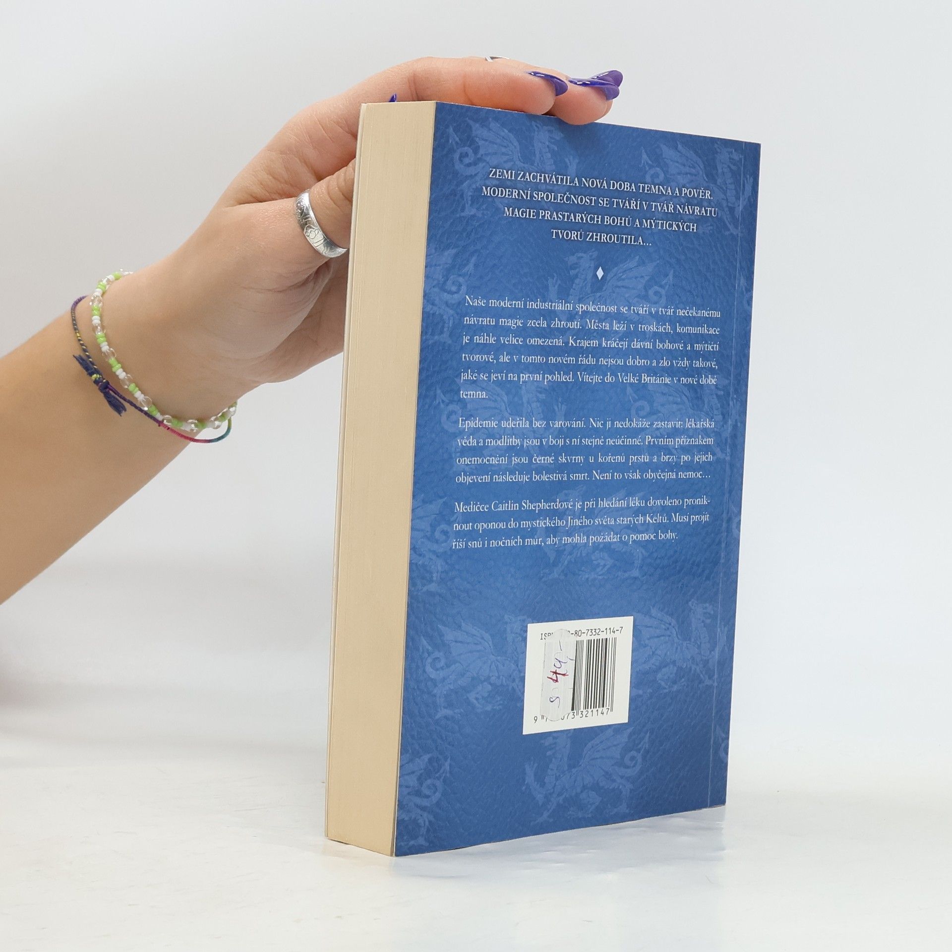 Zemi zachvátila nová doba temna a pověr. Moderní společnost se tváří v tvář návratu magie prastarých bohů a mýtických tvorů zhroutila... Města leží v troskách, komunikace je náhle velice omezená. Krajem kráčejí dávní bohové a mýtičtí tvorové, ale v tomto novém řádu nejsou dobro a zlo vždy takové, jaké se jeví na první pohled. Vítejte do Velké Británie v nové době temna. Epidemie udeřila bez varování. Nic ji nedokáže zastavit: lékařská věda a modlitby jsou v boji s ní stejně neúčinné. Prvním příznakem onemocnění jsou černé skvrny u kořenů prstů a brzy po jejich objevení následuje bolestivá smrt. Není to však obyčejná nemoc... Medičce Caitlin Shepherdové je při hledání léku dovoleno proniknout oponou do mystického Jiného světa starých Keltů. Musí projít říši snů i nočních můr, aby mohla požádat o pomoc bohy. 2. kniha série Doba temna, přeložil Josef Hořejší.