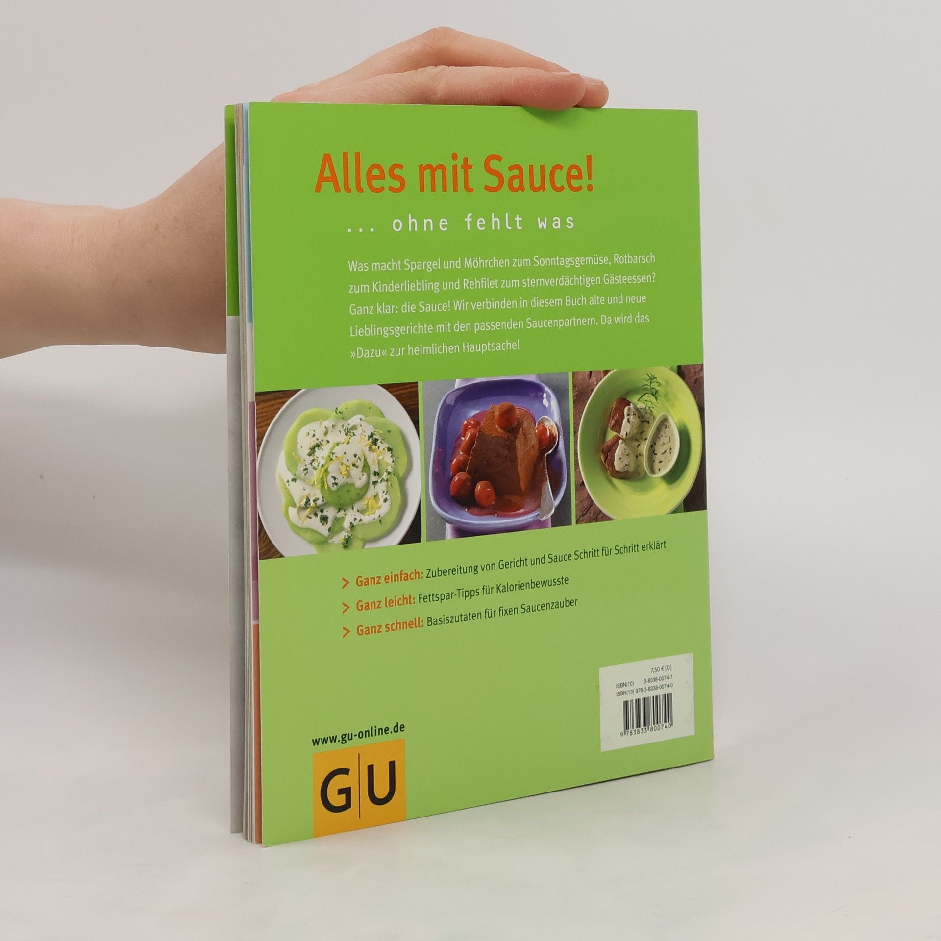 „Das ist so trocken!“ - ein oft gehörter Satz, wo Kinder mit am Tisch sitzen. Ganz klar: eine Sauce muß her, und die ist schließlich auch für Erwachsene die heimliche Hauptsache. Aber welche passt wozu? Wie jongliere ich in der Küche die Zubereitung des Hauptgerichts und die der Sauce? Und brauche ich dazu zwei verschiedene Kochbücher - eins für das Gericht, eins für die Sauce? Klar kann man für die Sauce zum Kurzgebratenen auch einfach zum Fertigpäckchen greifen. Aber was da wieder drin ist... Jetzt wird alles einfacher, denn hier kommen Gericht-mit-Sauce-Dreamteams. Von Majoran-Kartoffeln mit Speckstippe über Grillfisch mit Mango-Kokos-Sauce und Kalbsspießchen mit Weißwein-Zitronen-Sauce bis hin zu Schoko-Chili-Parfait mit Kirschsauce werden in diesem Buch lauter Traumhochzeiten gefeiert: ohne viel Aufwand und garantiert lecker! Und wer das Schnitzel schon in der Pfanne hat und nur noch die Sauce dazu sucht, der sieht in der großen Übersichtstabelle am Schluss auf einen Blick, welche am besten passt. Denn natürlich lassen sich alle Saucen bei Bedarf auch unabhängig von „ihrem“ Partnergericht nachkochen. Damit nie wieder der Ruf nach der Ketchupflasche laut wird!