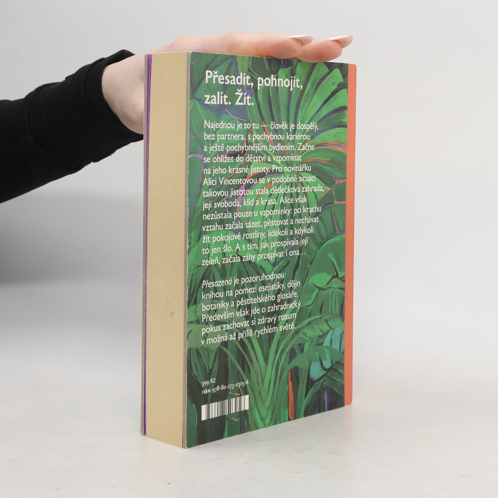 Zalít, pohnojit, přesadit. Žít. Najednou je to tu — člověk je dospělý, bez partnera, s pochybnou kariérou a ještě pochybnějším bydlením. Začne se ohlížet do dětství a vzpomínat na jeho krásné jistoty. Pro novinářku Alici Vincentovou se v podobné situaci takovou jistotou stala dědečkova zahrada, její svoboda, klid a krása. Nezůstala však u vzpomínky: po krachu vztahu začala sázet, pěstovat a nechávat žít pokojové rostliny, kdekoli a kdykoli to jen šlo. A s tím, jak prospívaly její rostliny, záhy začala prospívat i ona… Přesazená je pozoruhodnou knihou na pomezí esejistiky, dějin botaniky a pěstitelského glosáře. Především však jde o zahradnický pokus zachovat si zdravý rozum v možná až příliš rychlém světě.