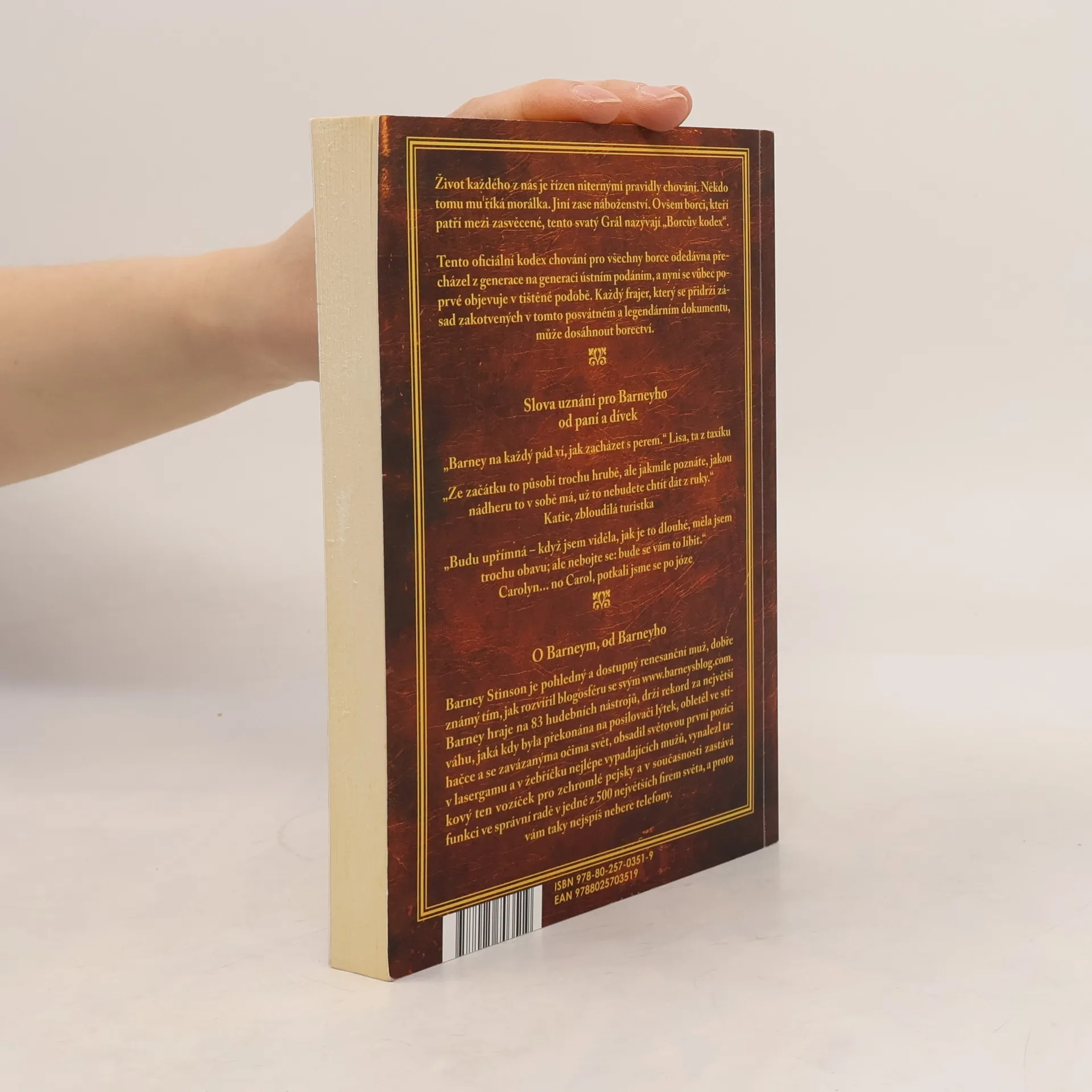 Barney Stinson je jednou z hlavních postav seriálu Jak jsem poznal vaši matku, a pro mnohé je nejdůležitější. Je renesanční osobností, mužem, který ví, jak užívat života, a chce ostatní naučit tomuto umění. K tomu slouží Borcův kodex, sto padesát stručných a jasných pouček, tabulky, grafy a rovnice, které popisují svět borců, kde na čelném místě stojí borec, za ním jeho parťáci a poté kočičky. Otázkou je, proč „borcův“? Překladatel se snaží co nejvíce přiblížit originálu a odchylky mají principiální důvody. Když Barney používá slova jako „bro“, „Nabroleon“ nebo „brofession“, české ekvivalenty jako „brácha“ nebo „parťák“ nefungují. Slovo borec nabízí lepší možnosti a vyjadřuje hodnocení a charakterizaci. Překladatel se také nesnaží napodobovat cizí překlad, ale vytváří vlastní verzi. Vít Penkala, překladatel, si skromně myslí, že je borec, a tím se snaží zachytit podstatu Barneyho osobnosti a jeho pohledu na svět.