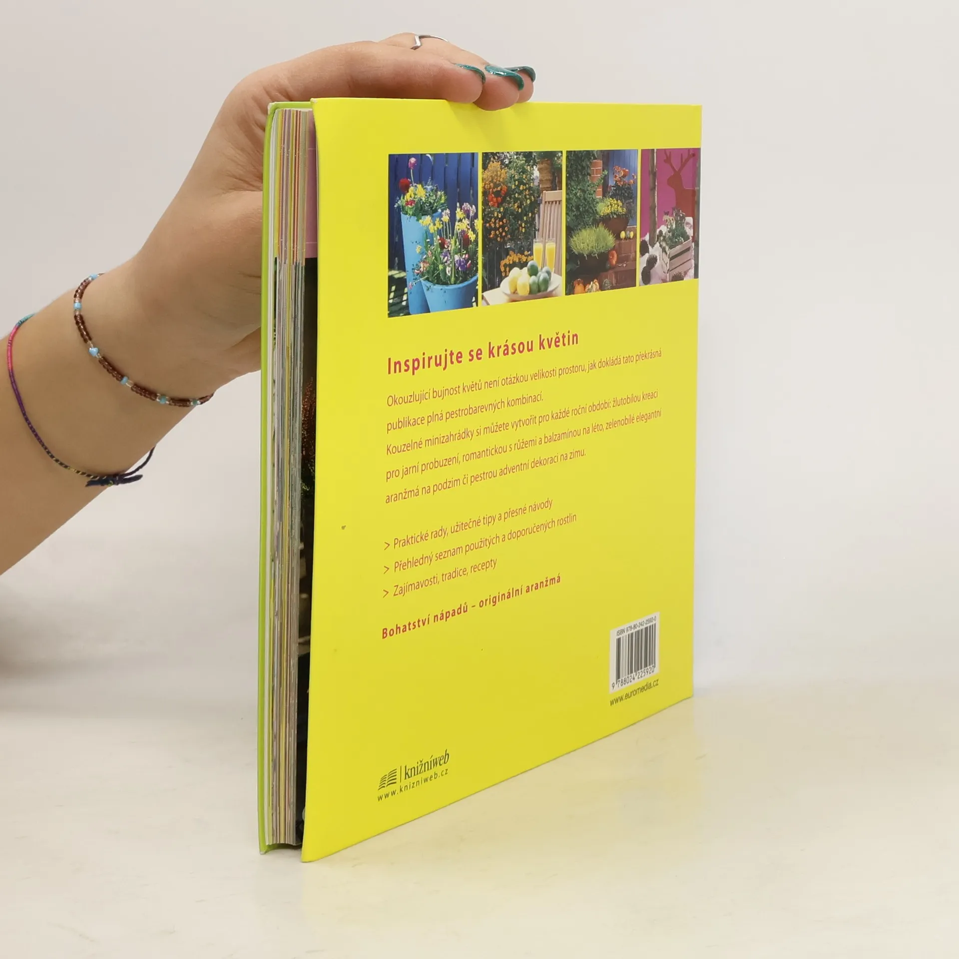 Inspirujte se krásou květin Okouzlující bujnost květů není otázkou velikosti prostoru, jak dokládá tato překrásná publikace plná pestrobarevných kombinací. Kouzelné minizahrádky si můžete vytvořit pro každé roční období: žlutobílou kreaci pro jarní probuzení, romantickou s růžemi a balzamínou na léto, zeleno-bílé elegantní aranžmá na podzim či pestrou adventní dekoraci na zimu. • Praktické rady, užitečné tipy a přesné návody • Přehledný seznam použitých a doporučených rostlin • Zajímavosti, tradice, recepty Bohatství nápadů – originální aranžmá