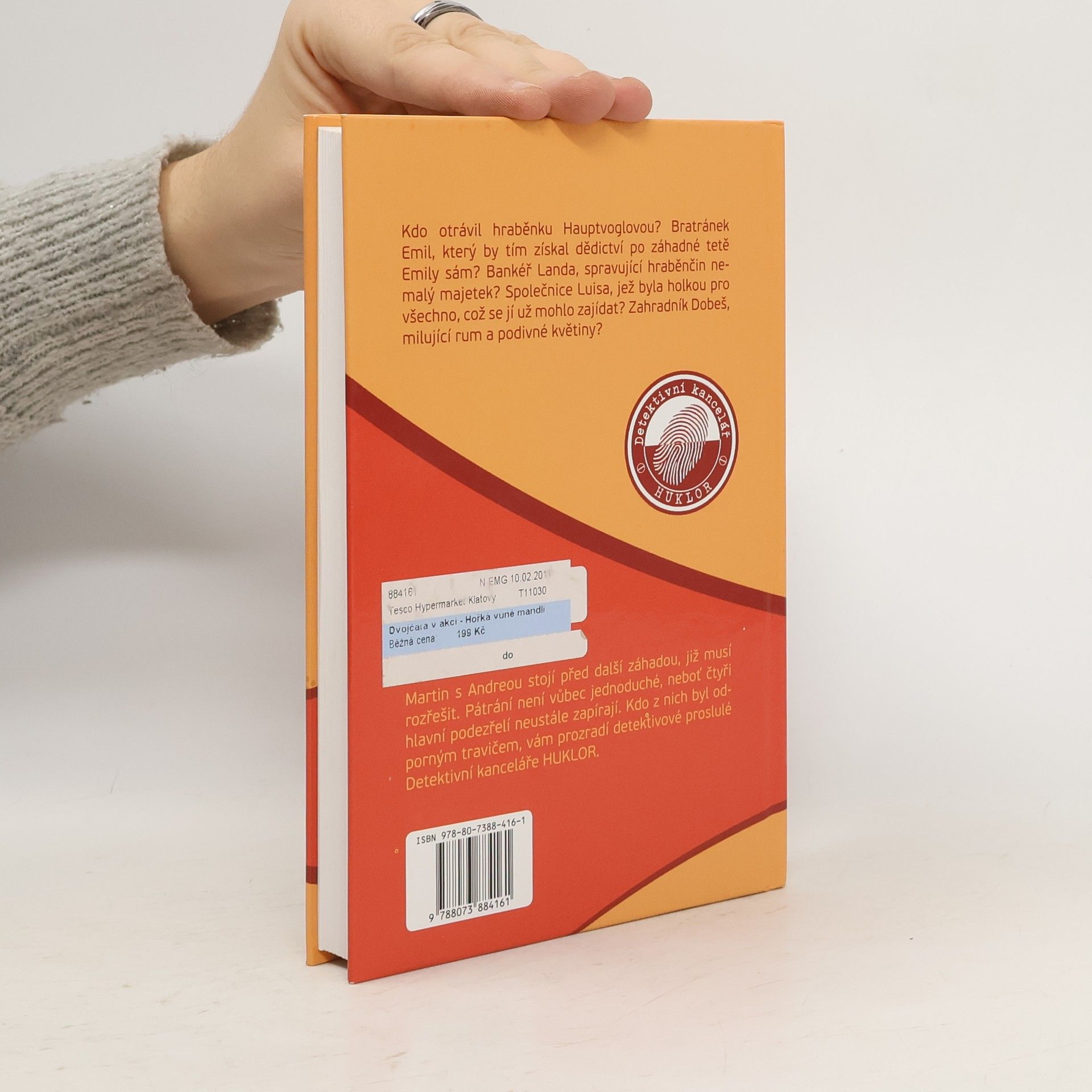 "Kdo otrávil hraběnku Haupvoglovou? Bratránek Emil, který by tím získal dědictví po záhadné společné tetě Emily sám? Bankéř Landa, spravující hraběnčin nemalý majetek? Společnice Luisa, jež byla holkou pro všechno, což se jí už mohlo zajídat? Zahradník Dobeš, milující rum a podivné květiny? Martin s Andreou stojí před další záhadou, jež musí rozřešit. Pátrání není vůbec jednoduché, neboť čtyři hlavní podezřelí neustále zapírají. Kdo z nich byl odporným travičem, či zda nepřibyl v rámci pátrání další podezřelý, se dozvíte v novém svazku detektivních případů Detektivní kanceláře HUKLOR. "