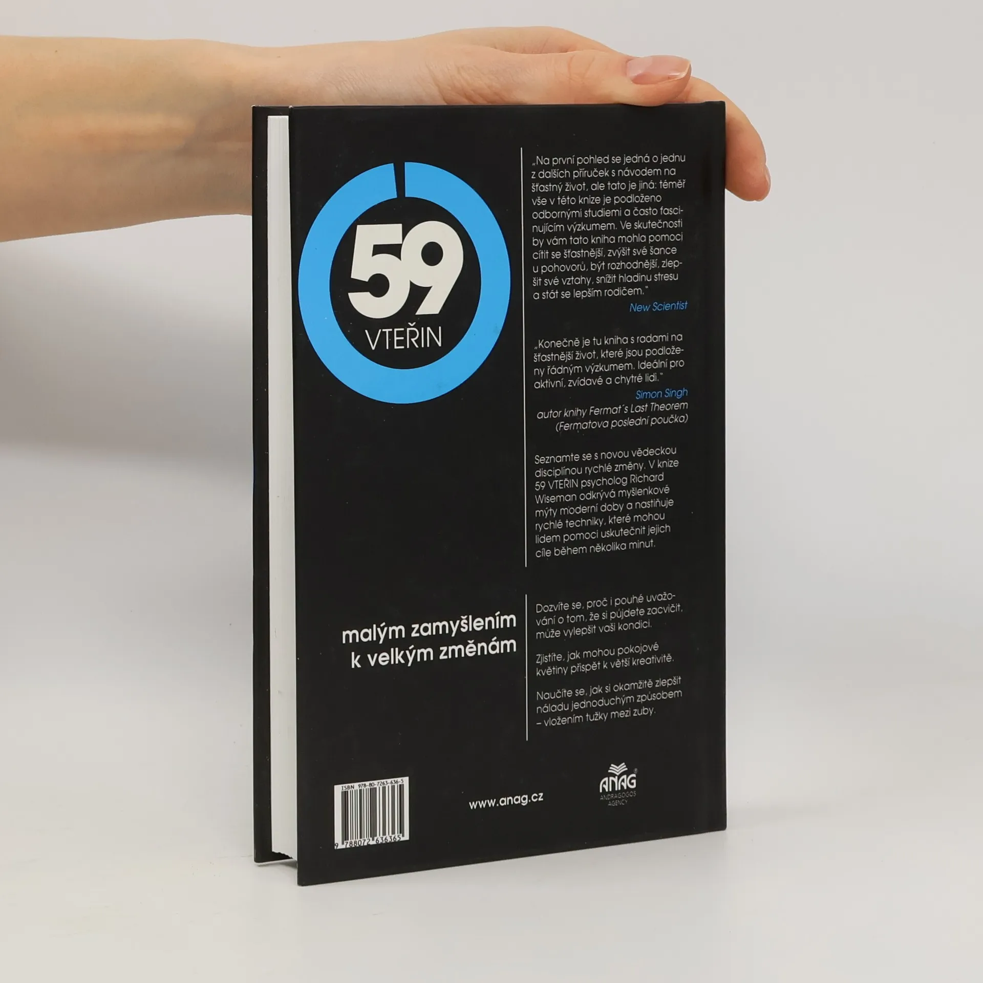 Chcete vylepšit některou z důležitých stránek vašeho života? Například shodit pár kilo, najít ideálního partnera, získat práci svých snů nebo být prostě šťastnější? Pak byste měli určitě sáhnout po knize 59 vteřin! Psycholog Richard Wiseman v této převratné knize předkládá nový způsob zkvalitnění lidského života podložený seriózními výzkumy. Autor ve své knize popisuje vědecké studie zabývající se životní spokojeností a přináší efektivní doporučení, jejichž realizace netrvá moc dlouho – zhruba minutu. Témata, kterými se Richard Wiseman v knize 59 vteřin zabývá, jsou: štěstí, přesvědčování, motivace, kreativita, přitažlivost, stres, vztahy, rozhodování, rodičovství a osobnost.
