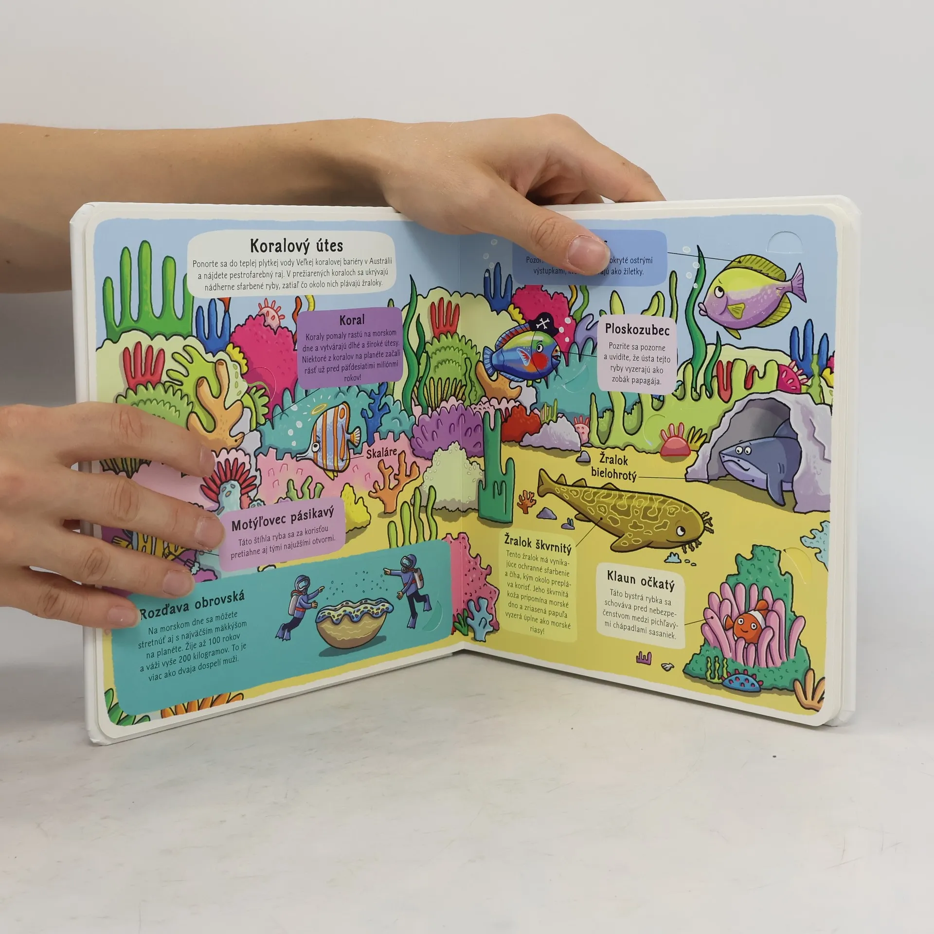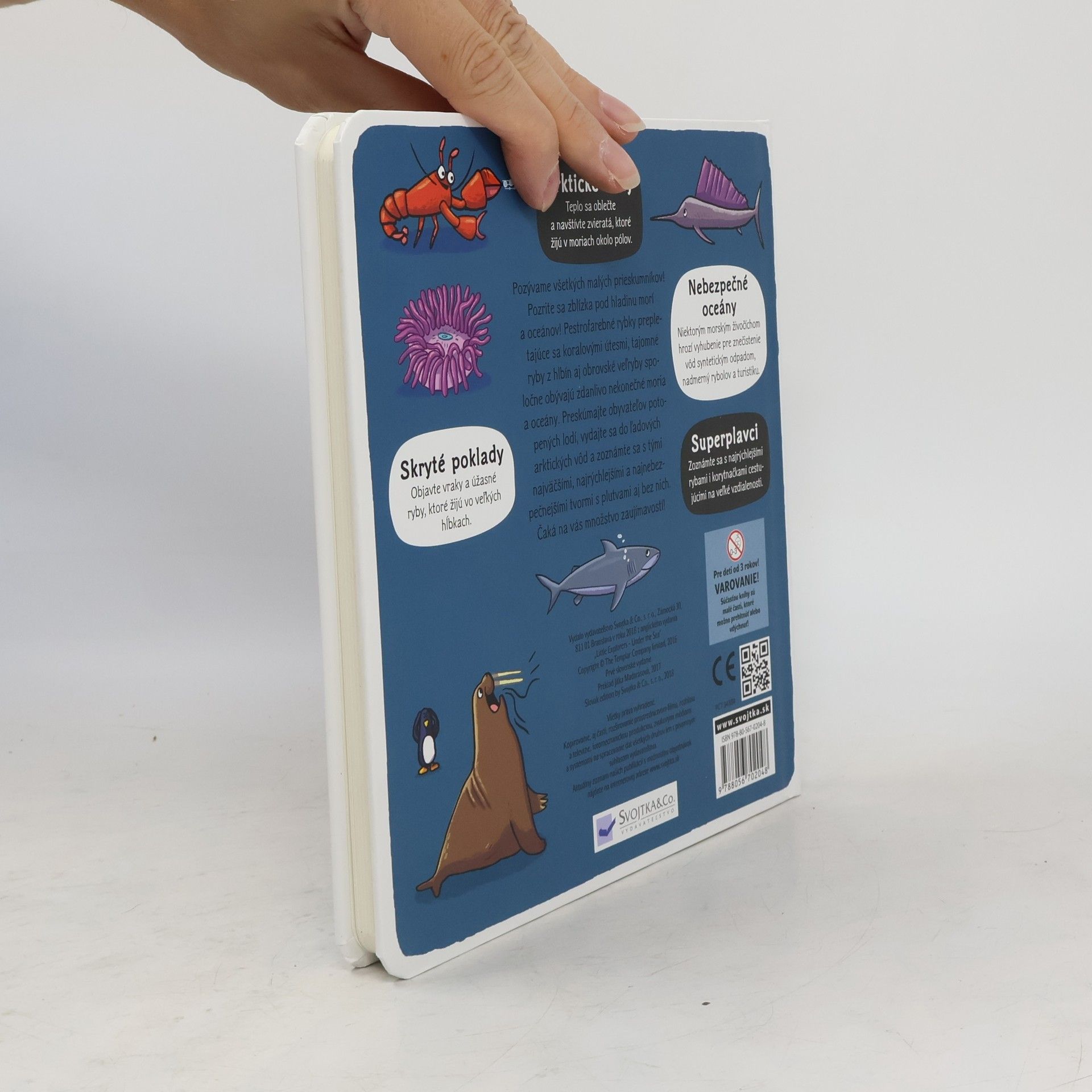 Pozrite sa zblízka pod hladinu morí a oceánov! Pestrofarebné rybky prepletajúce sa koralovými útesmi, tajomné ryby z hlbín aj obrovské veľryby, tie všetky spoločne obývajú zdanlivo nekonečné moria a oceány. Preskúmajte obyvateľov potopených lodí, vydajte sa do ľadových arktických vôd a zoznámte sa s tými najväčšími, najrýchlejšími a najnebezpečnejšími tvormi s plutvami aj bez nich. Pod vyše 50 odklápacími okienkami na vás čaká množstvo zaujímavostí!