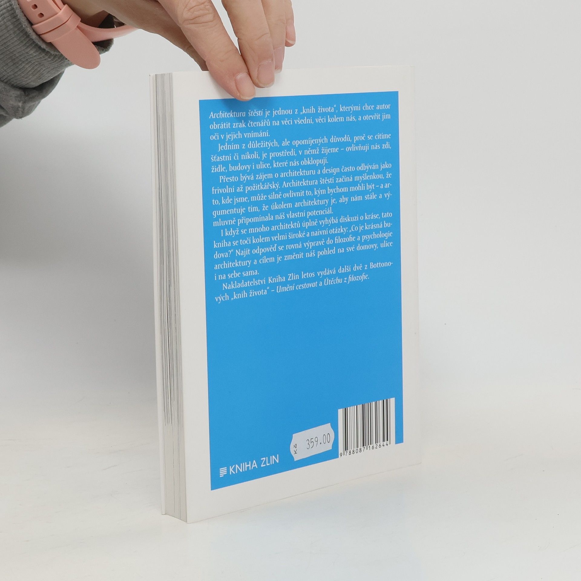 Architektura štěstí je jednou z „knih života“, kterými chce autor obrátit zrak čtenářů na věci všední, věci kolem nás a otevřít jim oči v jejich vnímání. Jedním z důležitých, ale opomíjených důvodů, proč se cítíme šťastní či nikoli, je prostředí, v němž žijeme – ovlivňují nás zdi, židle, budovy i ulice, které nás obklopují. Přesto bývá zájem o architekturu a design často odbýván jako frivolní až požitkářský. Architektura štěstí začíná od myšlenky, že to kde jsme, může silně ovlivnit to, kým bychom mohli být – a argumentuje tím, že je úkolem architektury je, aby nám stále a výmluvně připomínala náš vlastní potenciál. I když se mnoho architektů úplně vyhýbá diskuzi krásy, tato kniha se točí kolem velmi široké a naivní otázky „Co je krásná budova?“ Najít odpověď se rovná výpravě do filozofie a psychologie architektury a cílem je změnit náš pohled na naše domovy, ulice i na sebe sama. Ve vydavatelství Kniha Zlín vychází také další z „knih života“, Umění cestovat a Útěcha ve filozofii.