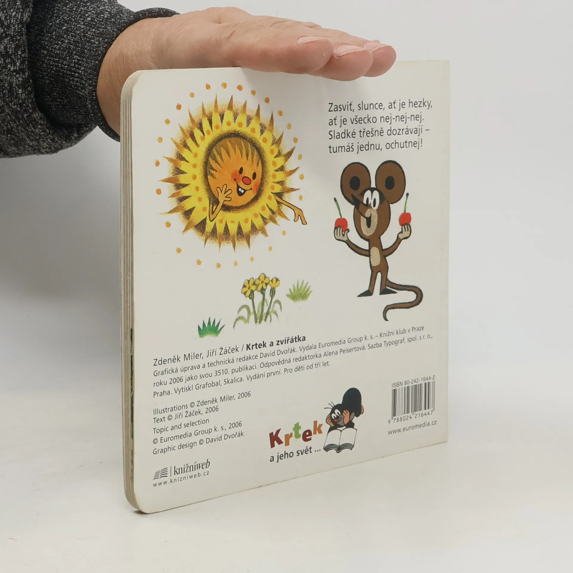 Leporelo pro děti od tří let. Novou řadu poznávacích leporel Krtek a jeho svět lze nazvat první "učebnicí" pro nejmenší čtenáře. První svazek je věnován zvířátkům. Děti se o nich díky veselým obrázkům Zdeňka Milera a vtipným veršům a zvídavým otázkám Jiřího Žáčka dozvědí mnoho zajímavostí.