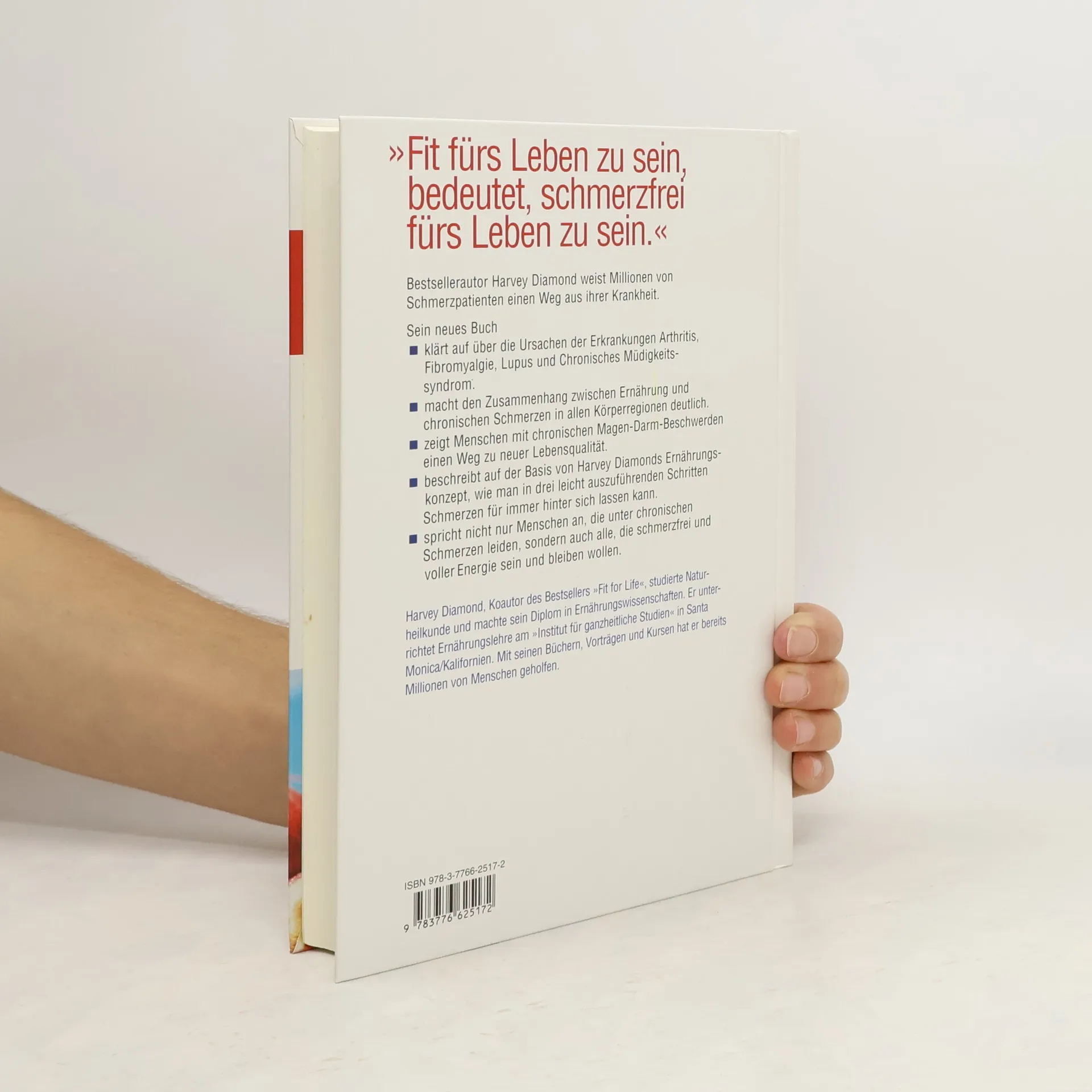 Effektiv Schmerzen lindern mit dem ganzheitlichen 3-Schritte-Programm des Bestsellerautors: richtige Ernährung, Körperübungen und eine positive innere Einstellung. Fit for life - Bestsellerautor Harvey Diamond weist Millionen von Schmerzpatienten einen Weg aus ihrer Krankheit. In seinem neuen Buch klärt er auf über die Ursachen und beschreibt auf der Basis seines Ernährungskonzeptes, wie man in drei leicht nachvollziehbaren Schritten Schmerzen für immer hinter sich lassen kann. Er zeigt, welche Bedeutung Bewegung und ausreichende Wasserzufuhr zur Vorbeugung haben. Ausgehend von eigenen Erfahrungen spricht er nicht nur Menschen an, die unter chronischen Schmerzen leiden, sondern auch alle, die schmerzfrei und voller Energie sein und bleiben wollen.