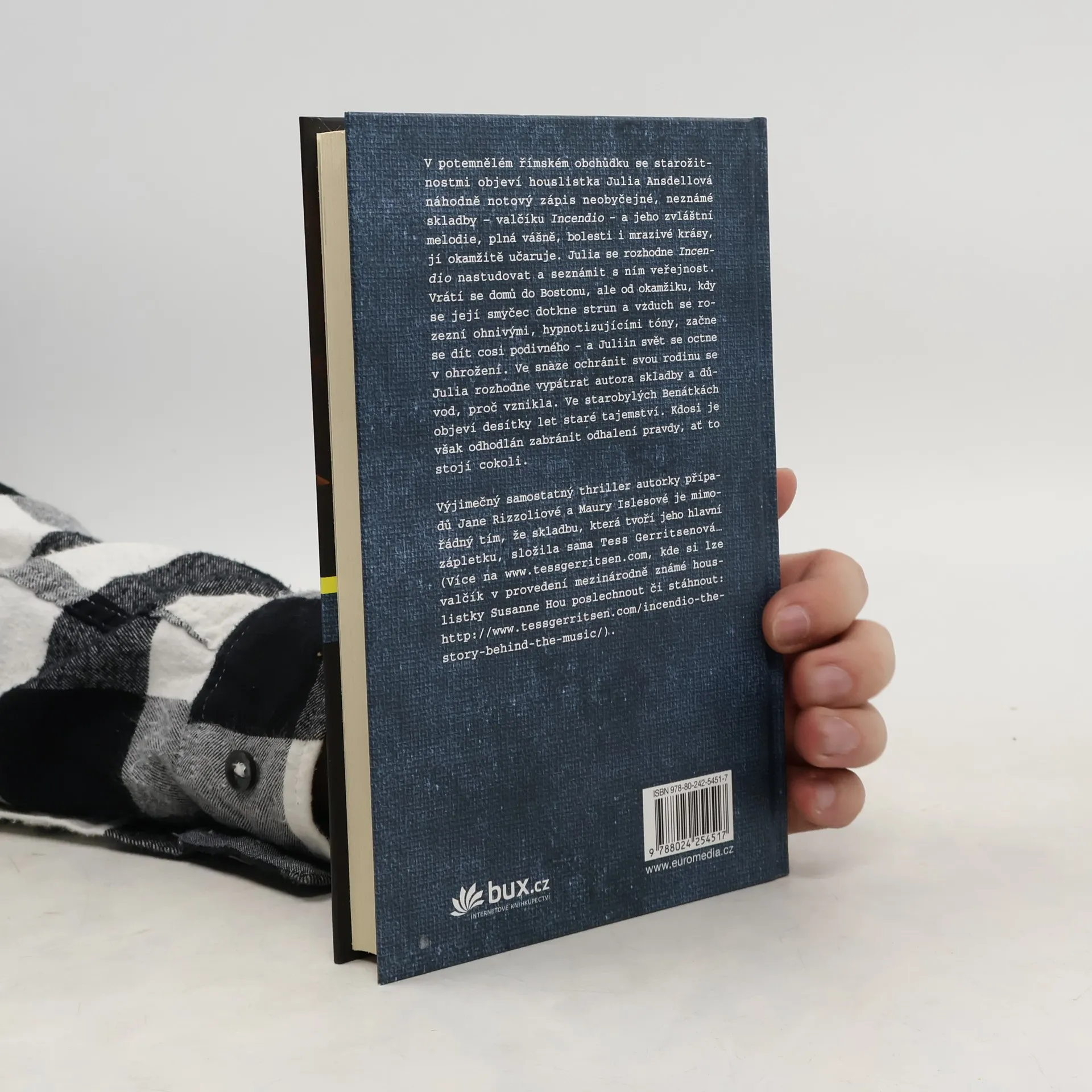 V potemnělém římském obchůdku se starožitnostmi objeví houslistka Julia Ansdellová náhodně notový zápis neobyčejné, neznámé skladby – valčíku Incendio – a jeho zvláštní melodie, plná vášně, bolesti i mrazivé krásy, jí okamžitě učaruje. Julia se rozhodne Incendio nastudovat a seznámit s ním veřejnost. Vrátí se domů do Bostonu, ale od okamžiku, kdy se její smyčec dotkne strun a vzduch se rozezní ohnivými, hypnotizujícími tóny, začne se dít cosi podivného – a Juliin svět se octne v ohrožení. Ve snaze ochránit svou rodinu se Julia rozhodne vypátrat autora skladby a důvod, proč vznikla. Ve starobylých Benátkách objeví desítky let staré tajemství. Kdosi je však odhodlán zabránit odhalení pravdy, ať to stojí cokoli. Výjimečný samostatný thriller autorky případů Jane Rizzoliové a Maury Islesové, mimořádný tím, že houslovou skladbu, která tvoří jeho hlavní zápletku, složila sama Tess Gerritsenová…