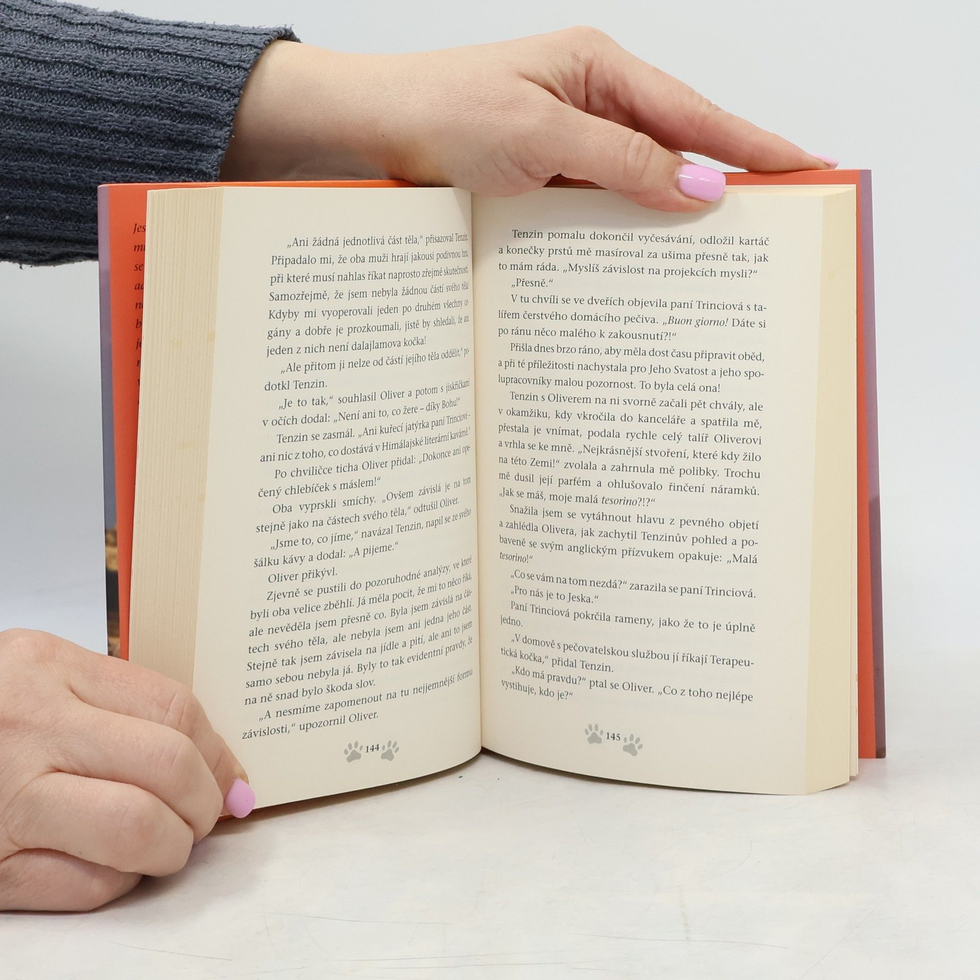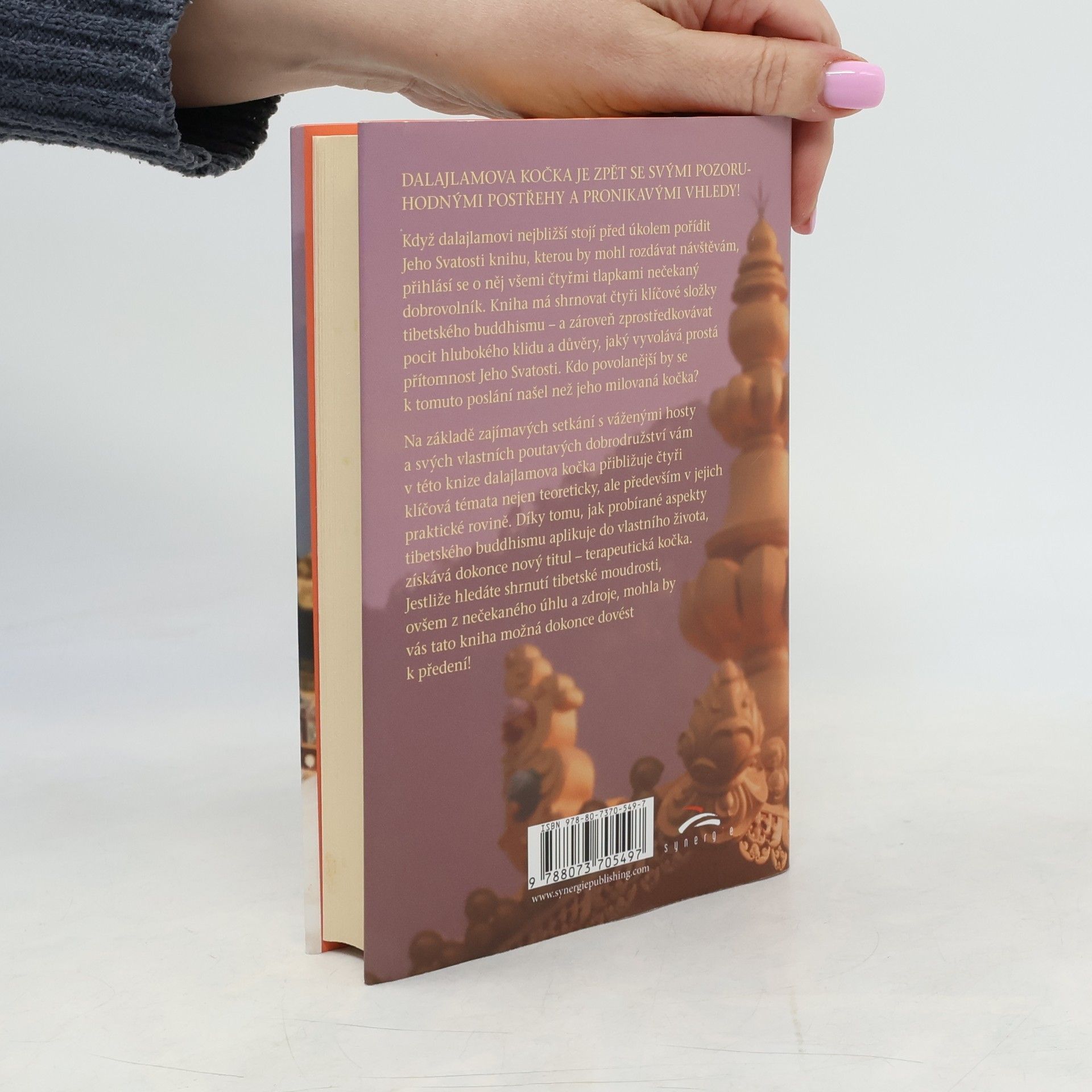 Dalajlamova kočka je zpět se svými pozoruhodnými postřehy a pronikavými vhledy! Když dalajlamovi nejbližší stojí před úkolem pořídit Jeho Svatosti knihu, kterou by mohl rozdávat návštěvám, přihlásí se o něj všemi čtyřmi tlapkami nečekaný dobrovolník. Kniha má shrnovat čtyři klíčové složky tibetského buddhismu – a zároveň zprostředkovávat pocit hlubokého klidu a důvěry, jaký vyvolává prostá přítomnost Jeho Svatosti. Kdo povolanější by se k tomuto poslání našel než jeho milovaná kočka? Na základě zajímavých setkání s váženými hosty a svých vlastních poutavých dobrodružství vám v této knize dalajlamova kočka přibližuje čtyři klíčová témata nejen teoreticky, ale především v jejich praktické rovině. Díky tomu, jak probírané aspekty tibetského buddhismu aplikuje do vlastního života, získává dokonce nový titul – terapeutická kočka. Jestliže hledáte shrnutí tibetské moudrosti, ovšem z nečekaného úhlu a zdroje, mohla by vás tato kniha možná dokonce dovést k předení!