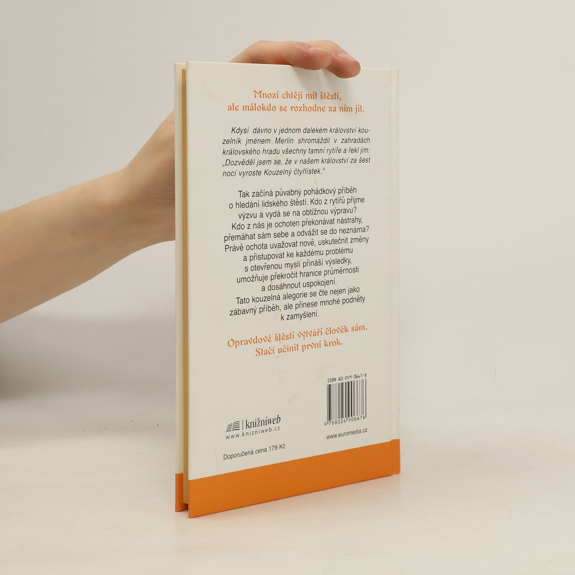 Mnozí chtějí mít štěstí, ale málokdo se rozhodne za ním jít. "Kdysi dávno v jednom dalekém království kouzelník jménem Merlin shromáždil v zahradách královského hradu všechny tamní rytíře a řekl jim: Dozvěděl jsem se, že v našem království za šest nocí vyroste Kouzelný čtyřlístek." Tak začíná půvabný pohádkový příběh o hledání lidského štěstí. Kdo z rytířů přijme výzvu a vydá se na obtížnou výpravu? Kdo z nás je ochoten překonávat nástrahy, přemáhat sám sebe a odvážit se do neznáma? Právě ochota uvažovat nově, uskutečnit změny a přistupovat ke každému problému s otevřenou myslí přináší výsledky, umožňuje překročit hranice průměrnosti a dosáhnout uspokojení. Tato kouzelná alegorie se čte nejen jako zábavný příběh, ale přinese mnohé podněty k zamyšlení. Opravdové štěstí vytváří člověk sám. Stačí učinit první krok.