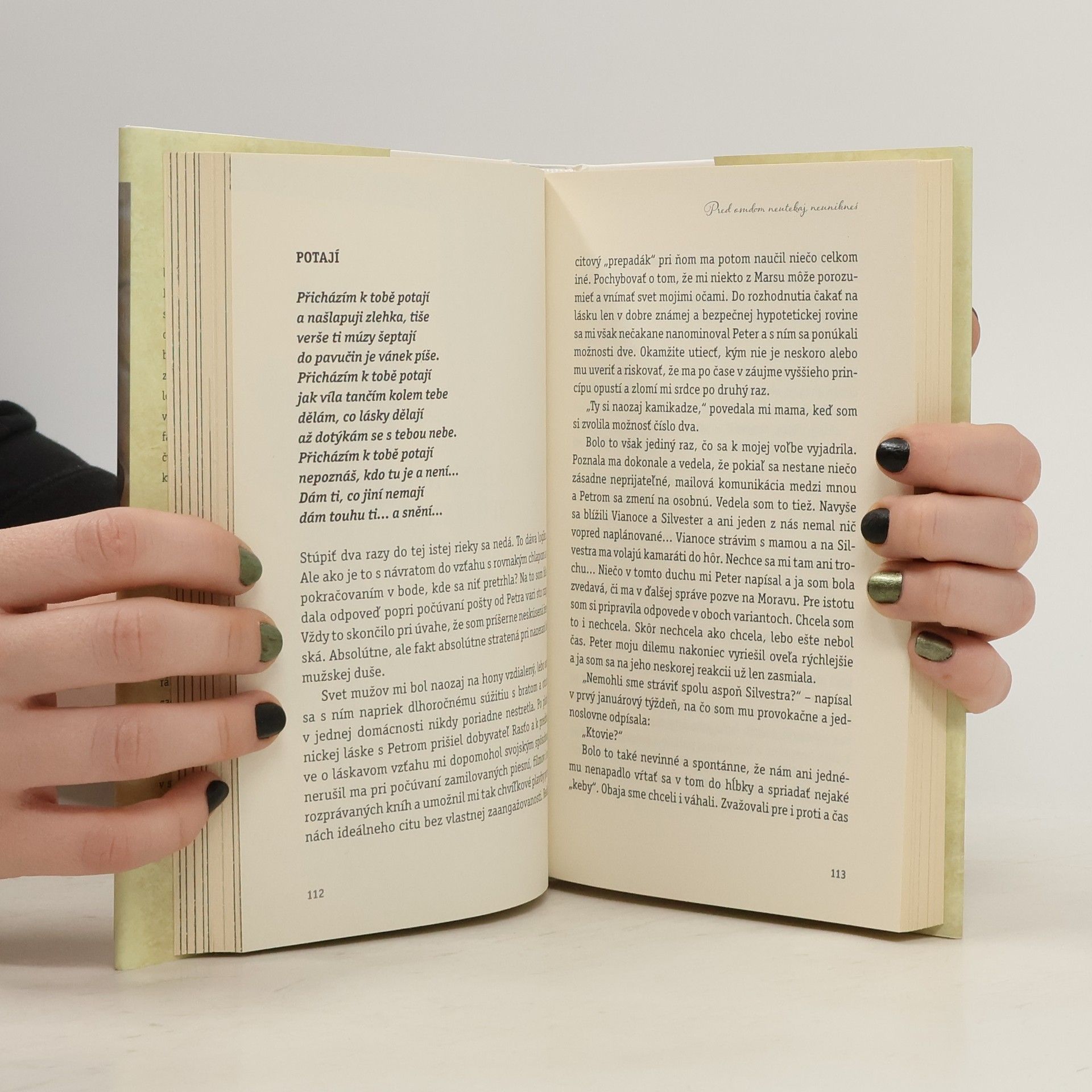 Keď sa Marianna jedného dňa ocitne v tme, ešte netuší, že jej strata zraku bude trvalá. Pri zmysloch a v nádeji, že sa zas vráti jej predošlý život, ju drží láska v srdci a vytrvalý, majetnícky priateľ poruke. Novú výzvu bez podpory toho, ktorého ľúbi a po boku s tým, ktorý ju nechápe, však musí nakoniec uchopiť a pokoriť navzdory citovému vydieraniu a so zatiahnutou oponou pred očami sama. Nenápadne sprevádzaná obetavou mamou, vedená talentom a túžbou po slobode, sa rozhodne zahodiť minulosť a byť šťastná. Či sa jej tento zámer podarí, kto sa jej nečakane ozve a ako minulosť predsa len nečakane vojde aj do jej budúcnosti, čítajte v novom skutočnom románe Svetlo je aj za oponou.