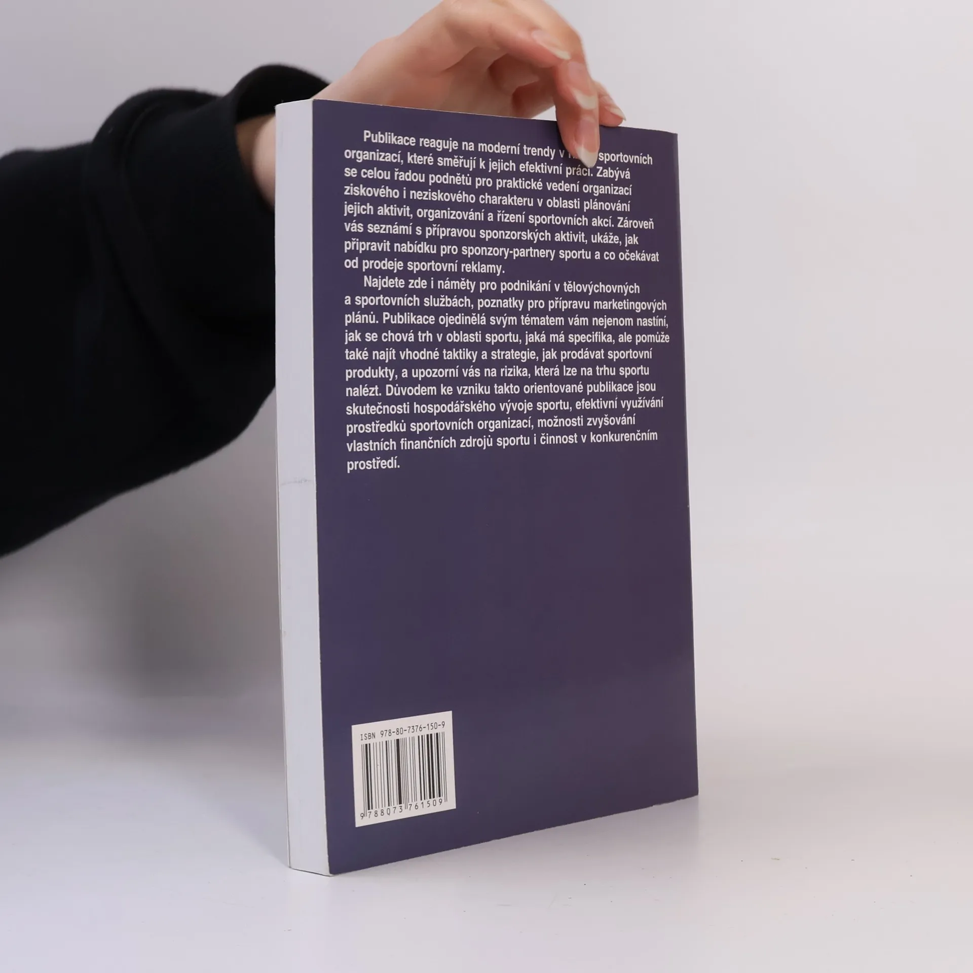 Publikace reaguje na moderní trendy v řízení sportovních organizací, které směřují k jejich efektivní práci. Zabývá se celou řadou podnětů pro praktické vedení organizací ziskového i neziskového charakteru v oblasti plánování jejich aktivit, ukáže, jak připravit nabídku pro sponzory-partnery a co očekávat od prodeje sportovní reklamy. Najdete zde i náměty pro podnikání v tělovýchovných a sportovních službách, poznatky pro přípravu marketingových plánů. Publikace ojedinělá svým tématem vám nejenom nastíní, jak se chová trh v oblasti sportu, jaká má specifika , ale pomůže také najít vhodné taktiky a strategie, jak prodávat sportovní produkty, a upozorní vás na rizika, která lze na trhu sportu nalézt.