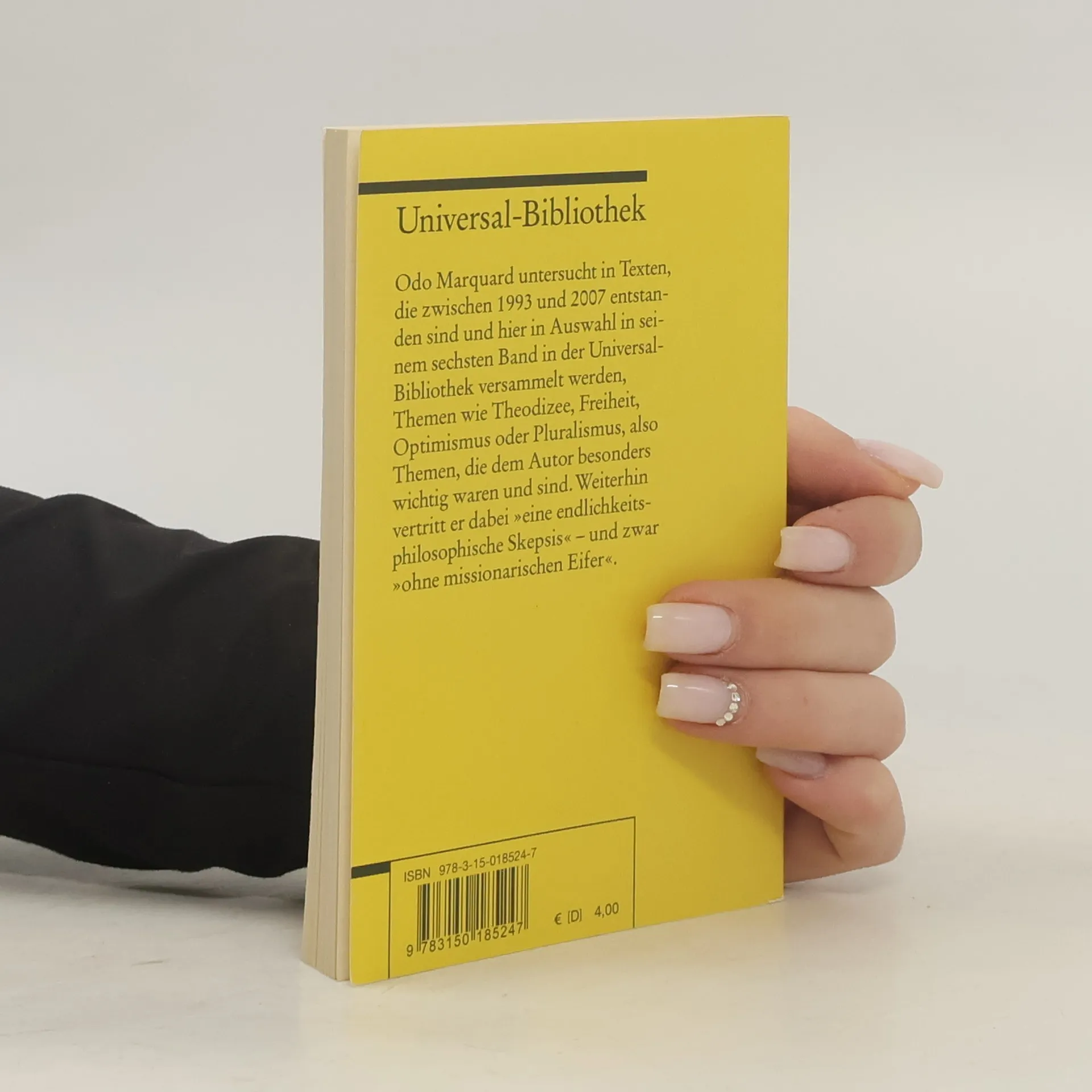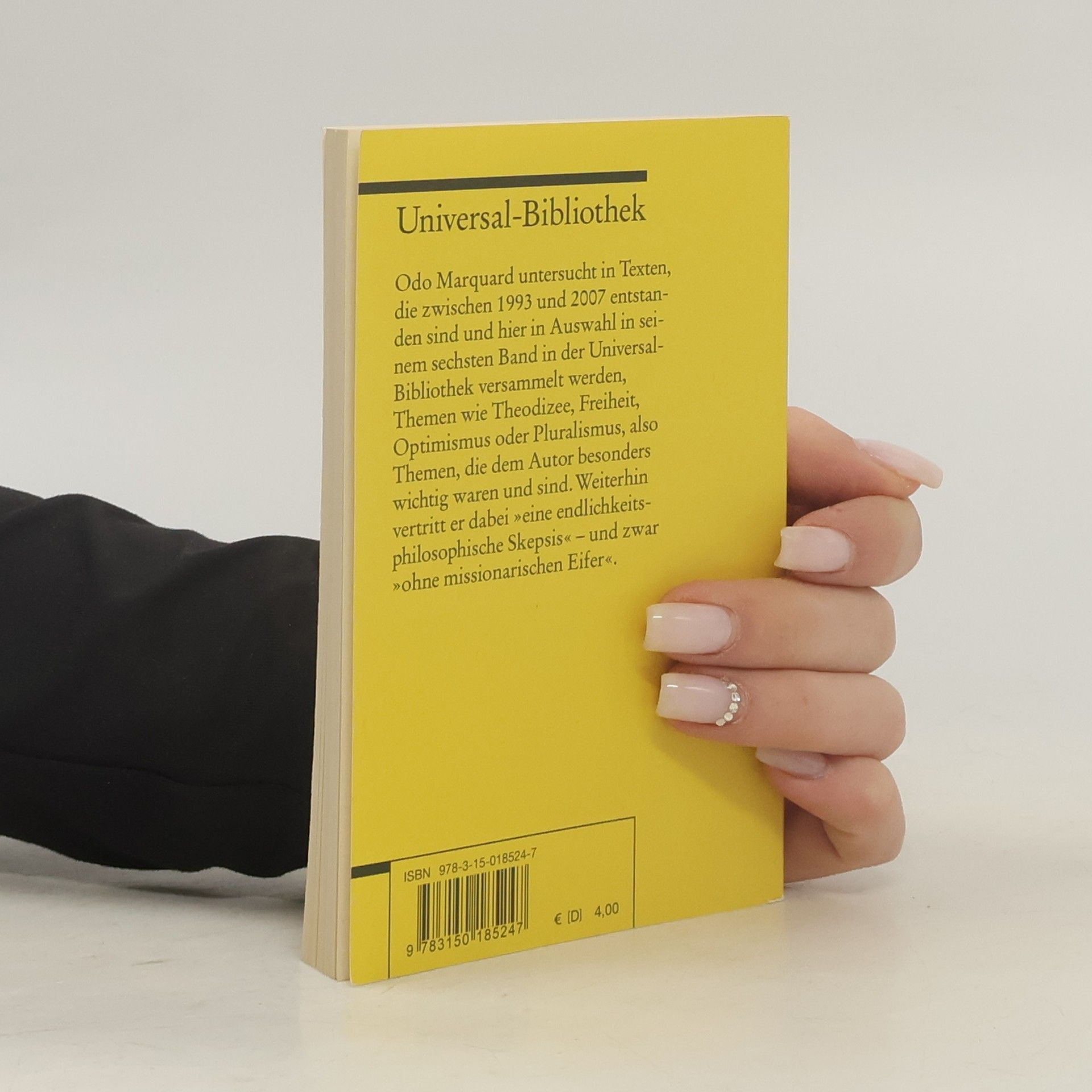Odo Marquard untersucht in Texten, die zwischen 1993 und 2007 entstanden sind und hier in Auswahl in seinem sechsten Band in der Universal-Bibliothek versammelt werden, Themen wie Theodizee, Freiheit, Optimismus oder Pluralismus - Themen also, die dem Autor besonders wichtig waren und sind. Weiterhin vertritt er dabei „eine endlichkeitsphilosophische Skepsis“ - und zwar „ohne missionarischen Eifer“.