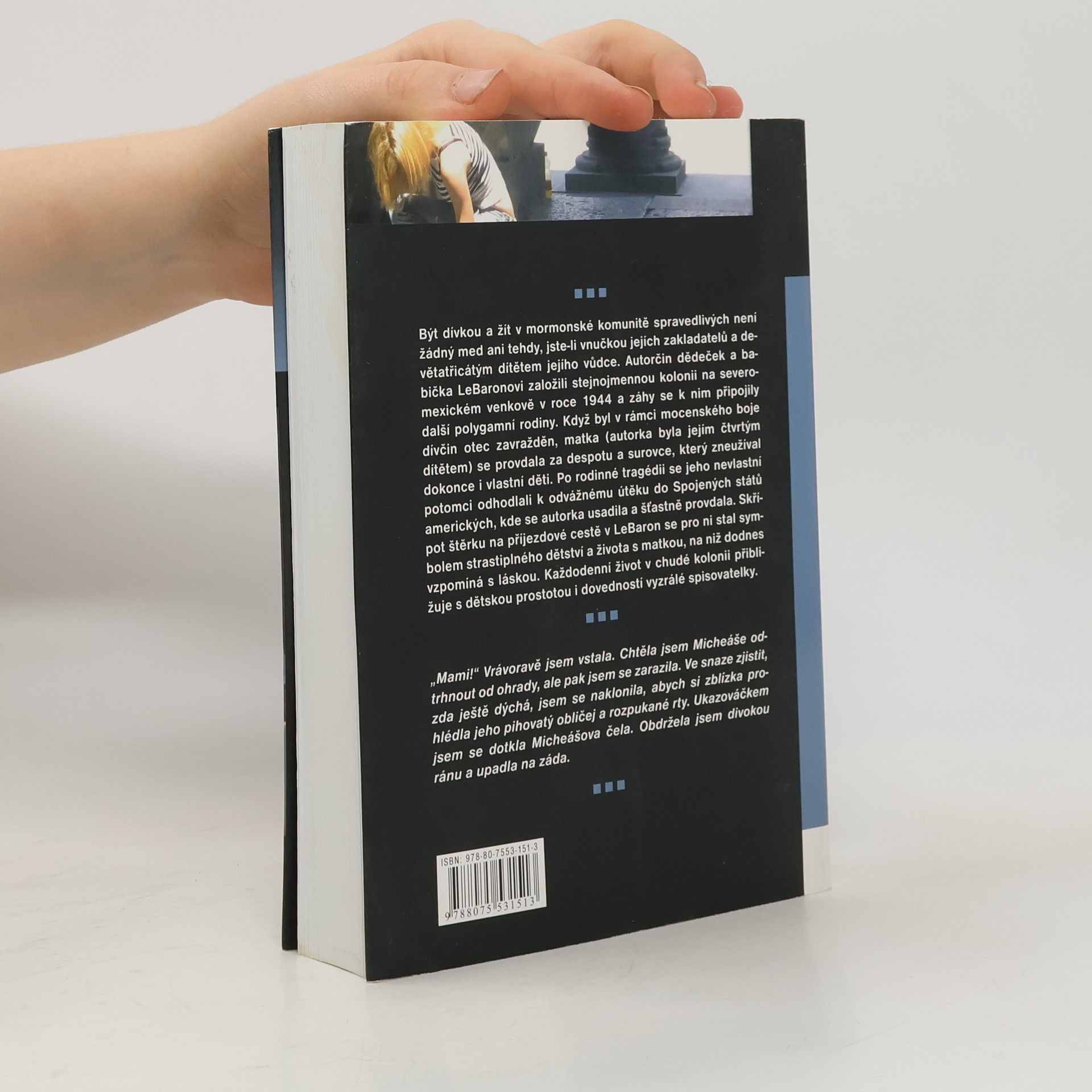 Být dívkou a žít v mormonské komunitě spravedlivých není žádný med ani tehdy, jste-li vnučkou jejích zakladatelů a devětatřicátým dítětem jejího vůdce. Autorčin dědeček a babička LeBaronovi založili stejnojmennou kolonii na severomexickém venkově v roce 1944 a záhy se k nim připojily další polygamní rodiny. Když byl v rámci mocenského boje dívčin otec zavražděn, matka (autorka byla jejím čtvrtým dítětem) se provdala za despotu a surovce, který zneužíval dokonce i vlastní děti. Po rodinné tragédii se jeho nevlastní potomci odhodlali k odvážnému útěku do Spojených států amerických, kde se autorka usadila a šťastně provdala. Skřípot štěrku na příjezdové cestě v LeBaron se pro ni stal symbolem strastiplného dětství a života s matkou, na niž dodnes vzpomíná s láskou. Každodenní život v chudé kolonii přibližuje s dětskou prostotou i dovedností vyzrálé spisovatelky.