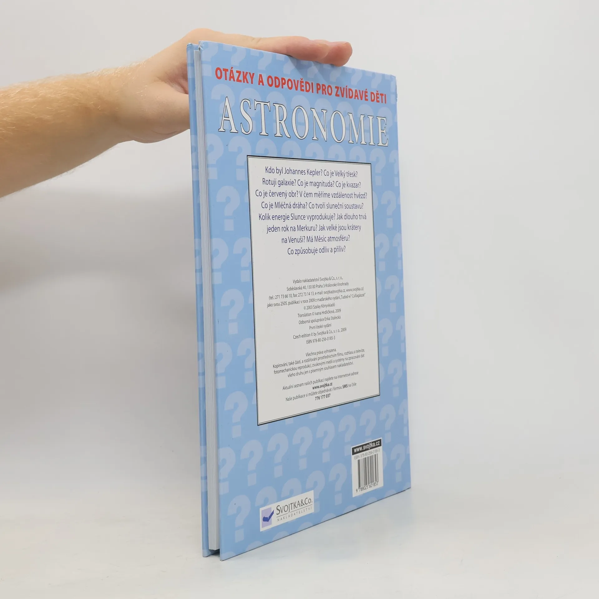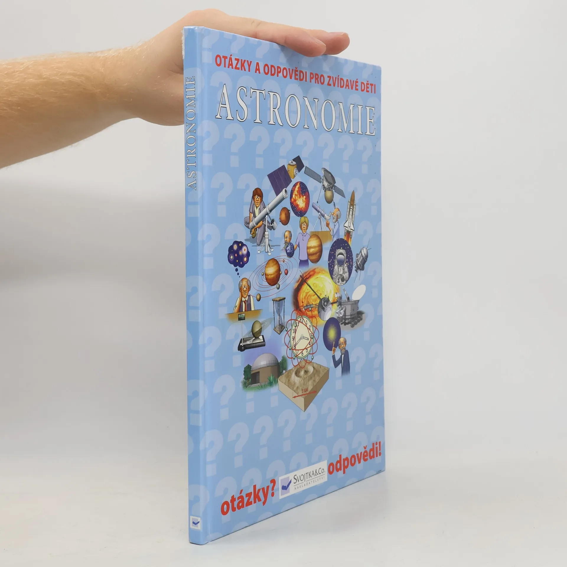 Kdo byl Johannes Kepler? Co je Velký třesk? Rotují galaxie? Co je to magnituda? Co je kvasar? Co je červený obr? V čem měříme vzdálenost hvězd? Co je Mléčná dráha? Co tvoří sluneční soustavu? Kolik energie Slunce vyprodukuje? Jak dlouho trvá jeden rok na Merkuru? Jak velké jsou krátery na Venuši? Má Měsíc atmosféru? Co způsobuje odliv a příliv? V této knížce, která je doplněna názornými barevnými ilustracemi, najdou vaše zvídavé děti odpovědi nejen na tyto, ale i mnoho dalších otázek týkajících se astronomie.