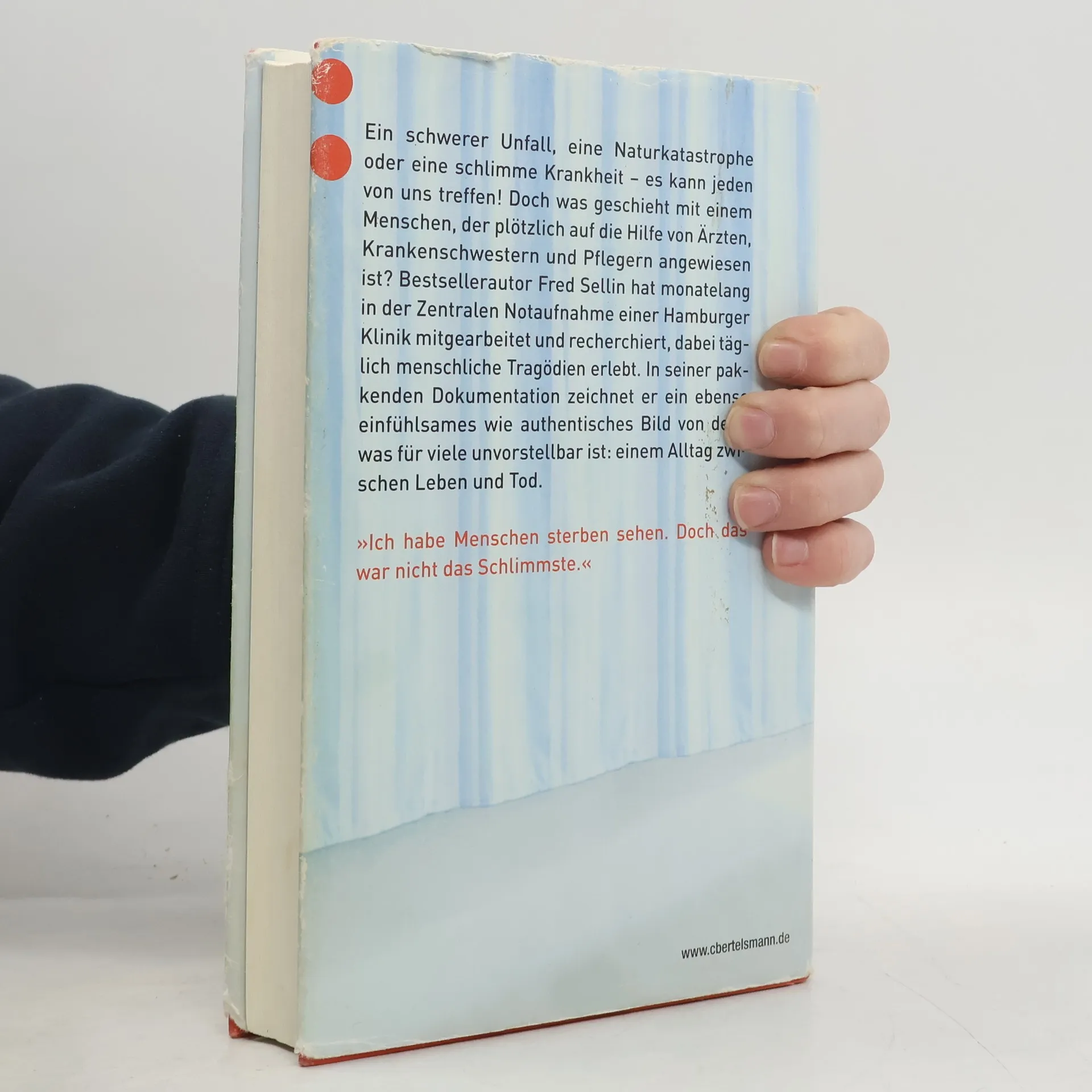 Tatsachenbericht, Selbstversuch und gesellschaftskritischer Report in einem Was diese Menschen leisten, kann nicht hoch genug eingeschätzt werden. Und doch lässt es die Gesellschaft zu, dass sie sich verschleißen, oft unterbezahlt und wenig geachtet werden. Dass da etwas falsch läuft, ist offensichtlich. Die Schnittstelle von Leben und Tod ist Alltag in der Notaufnahme. Verzweiflung und Freude, Angst und Hoffnung liegen oft nur eine Zimmertür auseinander. Fred Sellin hat Rettungssanitäter, Ärzte und Krankenschwestern der Klinik Nord in Hamburg über Monate begleitet. Er war dabei, wenn sie mit Erfolg um Unfallopfer kämpften, wenn sie sich dem Tod geschlagen geben mussten. Er hat in erschöpfte Gesichter gesehen, intensive Interviews geführt und zu begreifen versucht, wie man mit den Bildern und der schier übermenschlichen Verantwortung lebt. All das verdichtet zu sieben Tagen Emotionen und Schicksal. Sellins Momentaufnahme geht unter die Haut, auch weil jeder von uns jederzeit eine 'Notaufnahme' werden kann. Zeichnet ein ebenso einfühlsames wie authentisches Bild aus der Perspektive der Betroffenen (Pfleger, Ärzte, Patienten, Angehörige).