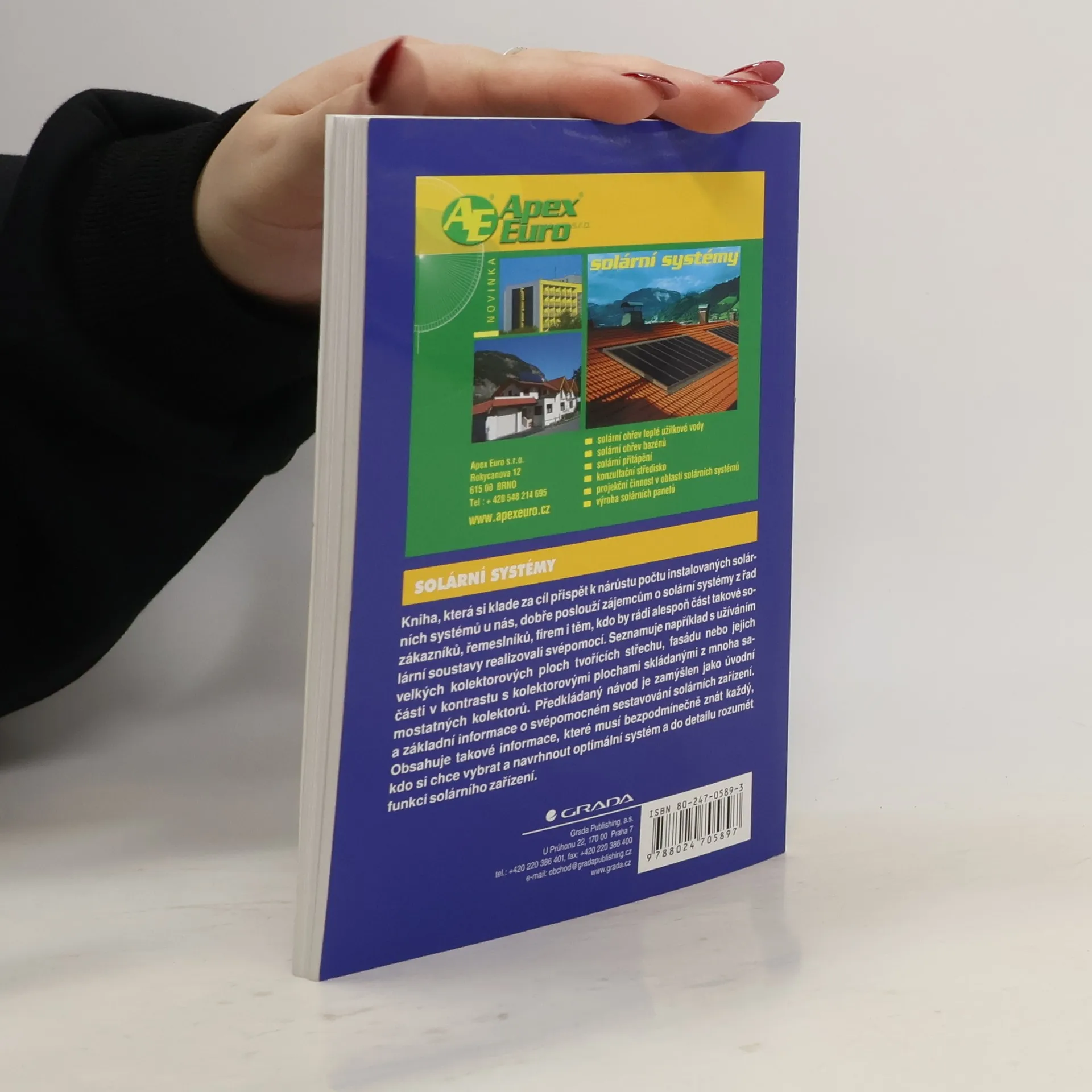 Kniha poslouží zájemcům o solární systémy pro ohřev vody z řad zákazníků, řemeslníků, i těm, kdo by rádi alespoň část takové soustavy realizovali svépomocí. Předkládaný návod je zamyšlen jako úvodní a základní informace o svépomocném sestavování těchto zařízení. Obsahuje informace, potřebné pro výběr a návrh optimálního systému a pro porozumění funkce zařízení solárního ohřevu vody. Přeloženo ze čtvrtého vydání osvědčené rakouské brožury. Úpravy a doplnění Jan Hollan a Ekologický institut Veronika.