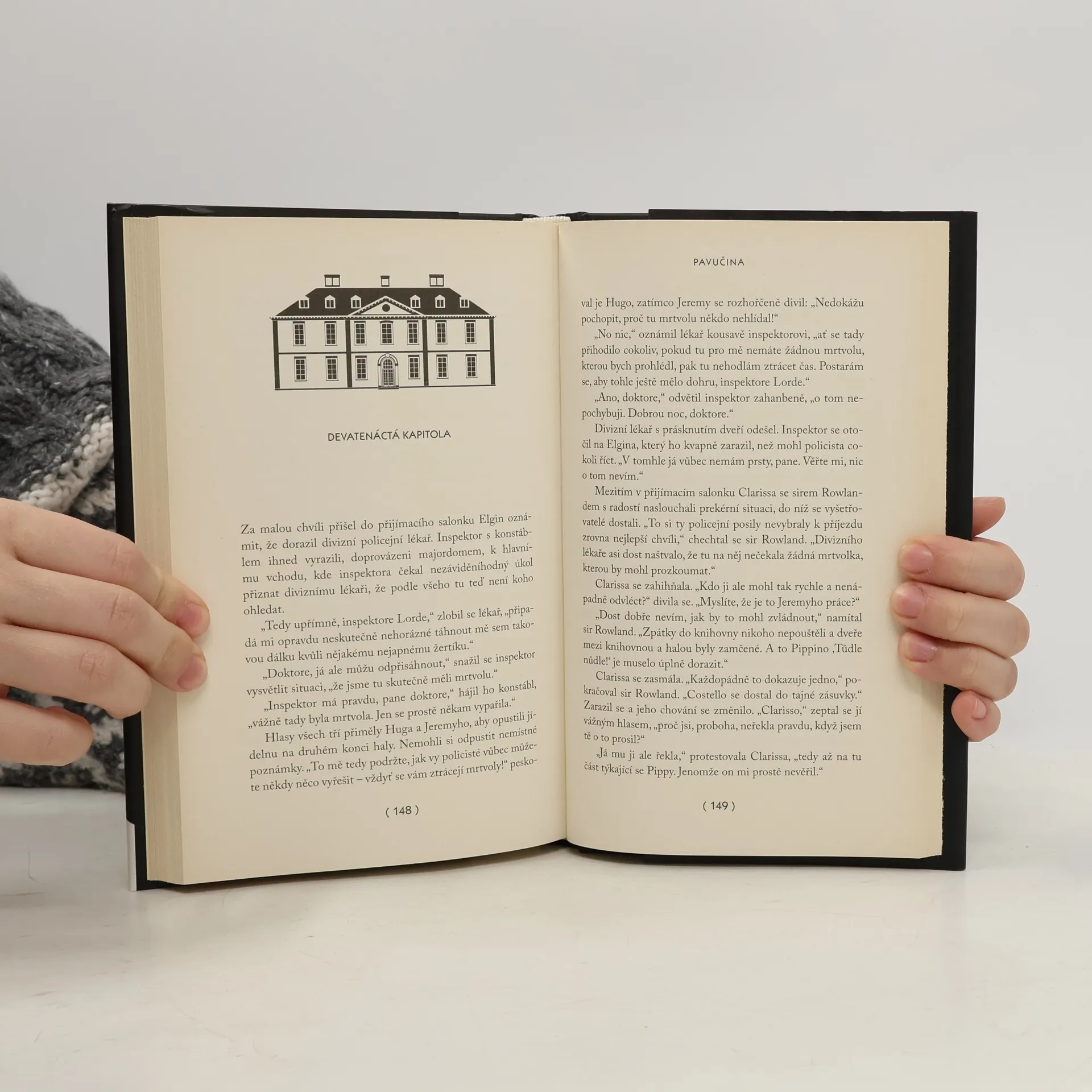 Pavučina, detektivní komedie Agathy Christie, byla poprvé uvedena v roce 1954, po veleúspěšných hrách Past na myši a Svědkyně obžaloby (české vydání všech tří najdete v souboru Detektivní hry, Knižní klub, 2012). O téměř 50 let později vytvořil Charles Osborne její novelizaci, určenou všem milovníkům autorčiných napínavých a vtipných příběhů. Clarissa Hilsham-Brownová miluje zábavu, legrácky a taky vzrušující představy. Co kdyby se například jednoho dne vzbudila a našla v domě mrtvolu? Jenže sny se občas plní… a tak jednoho deštivého březnového odpoledne v salonu svého venkovského sídla skutečně objeví bezduché tělo. Ovšem v tu nejnevhodnější dobu – právě sem míří Clarissin manžel, pracovník ministerstva zahraničí, s významným politikem. Hrozí skandál a Clarisse nezbývá než mrtvolu co nejdřív odstranit. Navíc to vypadá, že vraždil někdo, kdo je Clarisse obzvlášť blízký a milý. Co teď? Ještě že se Clarisse podaří přemluvit tři přítomné hosty, aby jí s tímhle „problémem“ pomohli. Vzápětí se však ohlásí policie. A ukryté tělo záhy mizí…
