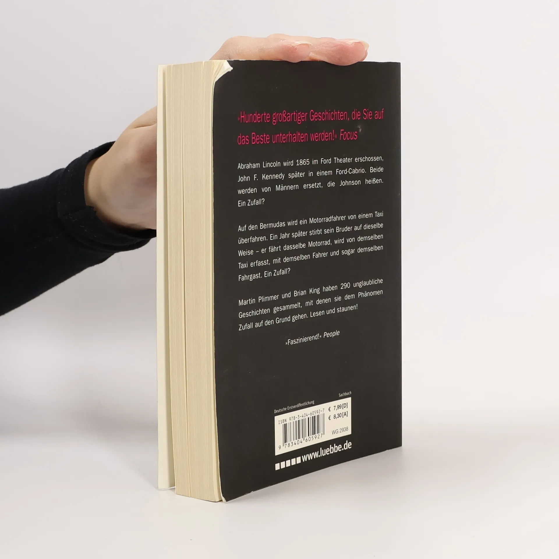 Abraham Lincoln wird 1865 im Ford Theater erschossen, John F. Kennedy später in einem Ford-Cabrio. Beide werden von Männern ersetzt, die Johnson heißen. Ein Zufall? Auf den Bermudas wird ein Motorradfahrer von einem Taxi überfahren. Ein Jahr später stirbt der Bruder des Mannes auf dieselbe Weise ═ er fährt dasselbe Motorrad, wird von demselben Taxi erfasst, mit demselben Fahrer und sogar demselben Fahrgast. Ein Zufall? Martin Plimmer und Brian King haben 290 unglaubliche Geschichten gesammelt, mit denen sie dem Phänomen Zufall auf den Grund gehen. Lesen und staunen!