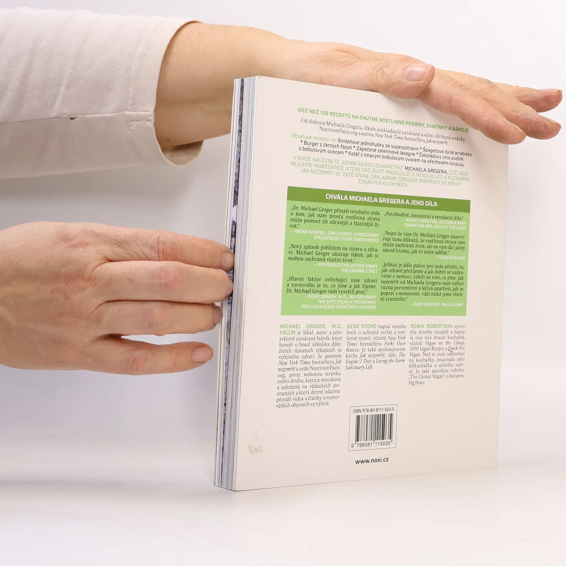 V knize naleznete „denní silnou dvanáctku“ Michaela Gregera, což jsou nejlepší ingredience, které váš život prodlouží o několik let, a kuchařka Jak nezemřít se jistě stane základním zdrojem inspirace ve všech zdravých kuchyních. MICHAEL GREGER, M.D., FACLM je lékař, autor a celosvětově uznávaný řečník, který hovoří o hned několika důležitých tématech týkajících se veřejného zdraví. Je autorem New York Times bestselleru Jak nezemřít a vede NutritionFacts. org, první webovou stránku svého druhu, která je nezisková a založená na vědeckých poznatcích a která denně zdarma přináší videa a články o nejnovějších objevech ve výživě. GENE STONE napsal mnoho knih o ochraně zvířat a rostlinné stravě, včetně New York Times bestselleru Forks Over Knives. Je také spoluautorem knihy Jak nezemřít, The Engine 2 Diet a Living the Farm Sanctuary Life. ROBIN ROBERTSON vytvořila mnoho receptů a napsala více než dvacet kuchařek, včetně Vegan on the Cheap, 1000 Vegan Recipes a Quick Fix Vegan. Než se stala odbornicí na kuchařky, pracovala jako šéfkuchařka a učitelka vaření. Je také autorkou rubriky „The Global Vegan“ v časopise VegNews.