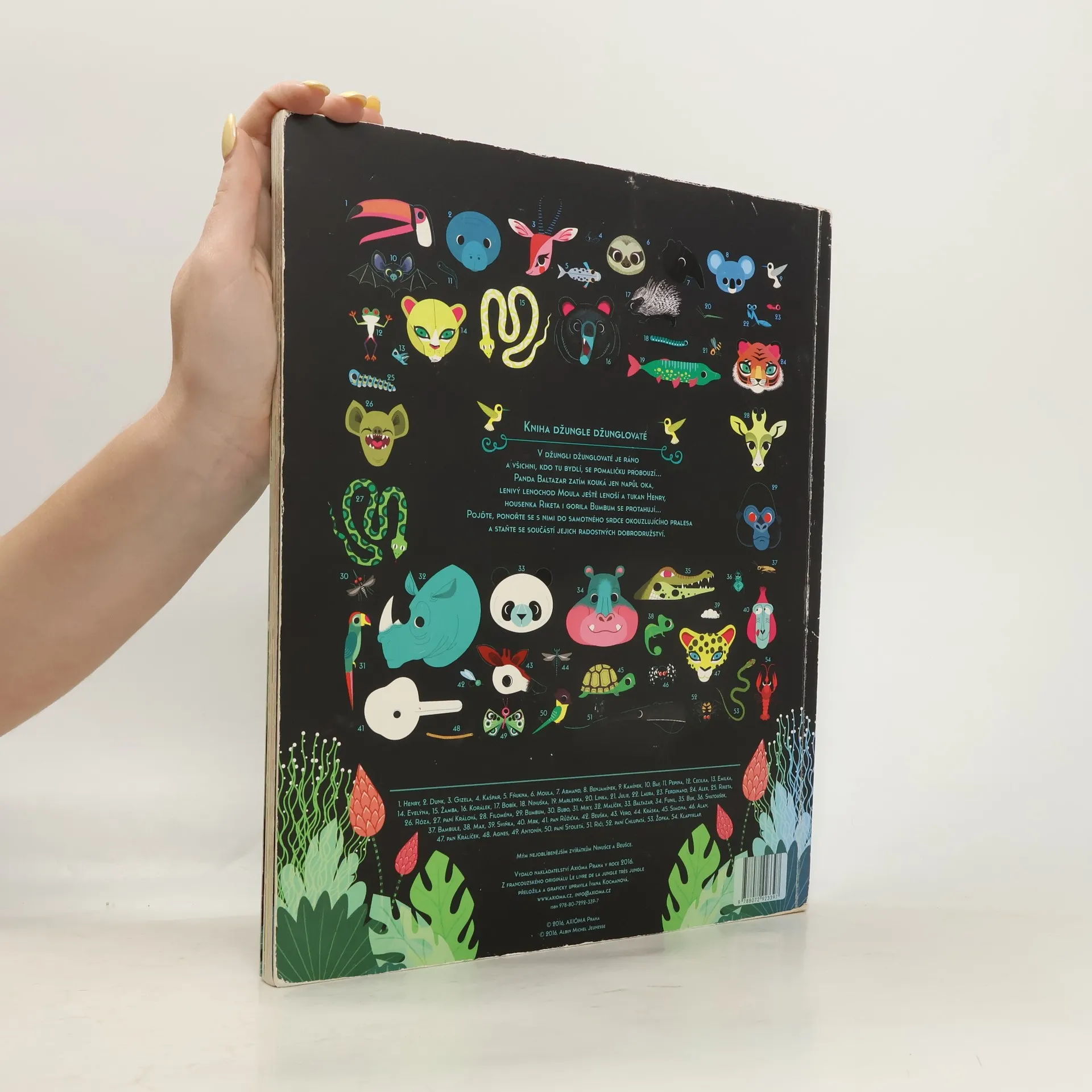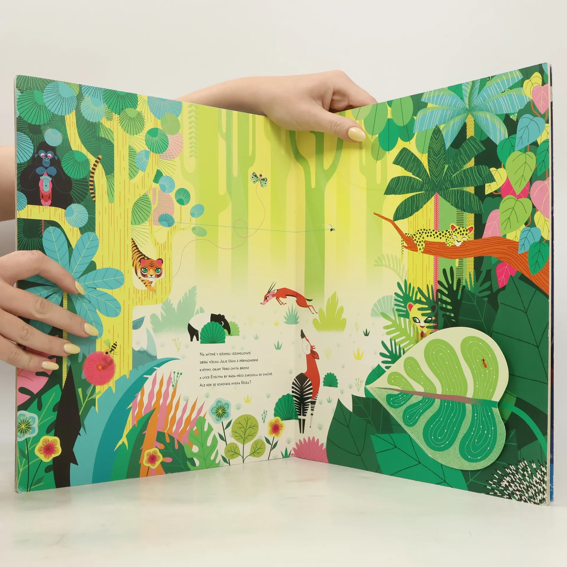 V džungli džunglovaté je ráno a všichni, kdo tu bydlí, se pomalu probouzí… Panda Baltazar zatím kouká jen napůl oka, lenivý lenochod Moula ještě lenoší a tukan Henry, housenka Riketa i gorila Bumbum se protahují… Pojďte, ponořte se do samotného srdce okouzlujícího pralesa a staňte se součástí jejich radostných dobrodružství. Hledejte a pozorujte více než 55 exotických zvířat, která se zabydlela v této půvabné knížce a ponořte se tak ještě hlouběji do džungle džunglovaté.