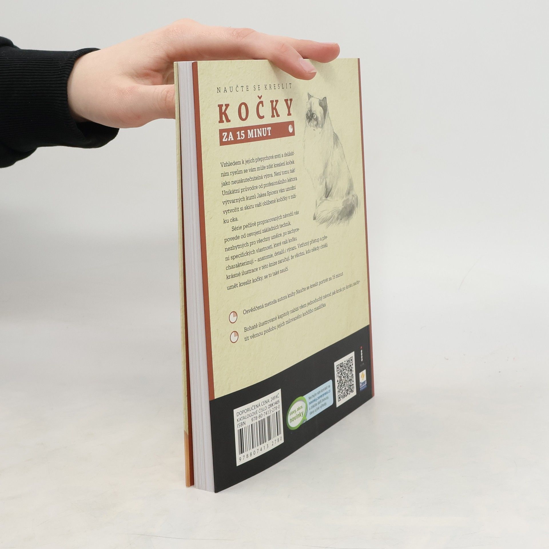 Zvládněte kresbu koček díky jedinečnému návodu od profesionálního kreslíře Jakea Spicera! Chtěli byste se naučit kreslit kočky, ale nevíte jak začít? Kreslíte a potřebujete vypilovat své výtvory k dokonalosti? Nebo vás kreslení prostě jen baví a hledáte stále nové způsoby a metody? Jednoduchá, ale obsahově bohatá kniha od Jakea Spicera vám zajisté vyjde vstříc. V knize Naučte se kreslit kočky za 15 minut najdete jednoduchý návod jak krok po kroku zvládnout kresbu tohoto oblíbeného domácího mazlíčka. Naučíte se vše od základní skici využívající jednoduchých tvarů, přes problematiku kostry a svalů, až po vykreslení detailů, jakými jsou znaky srsti nebo výraz a postoj vyjadřující stáří a náladu kočky.
