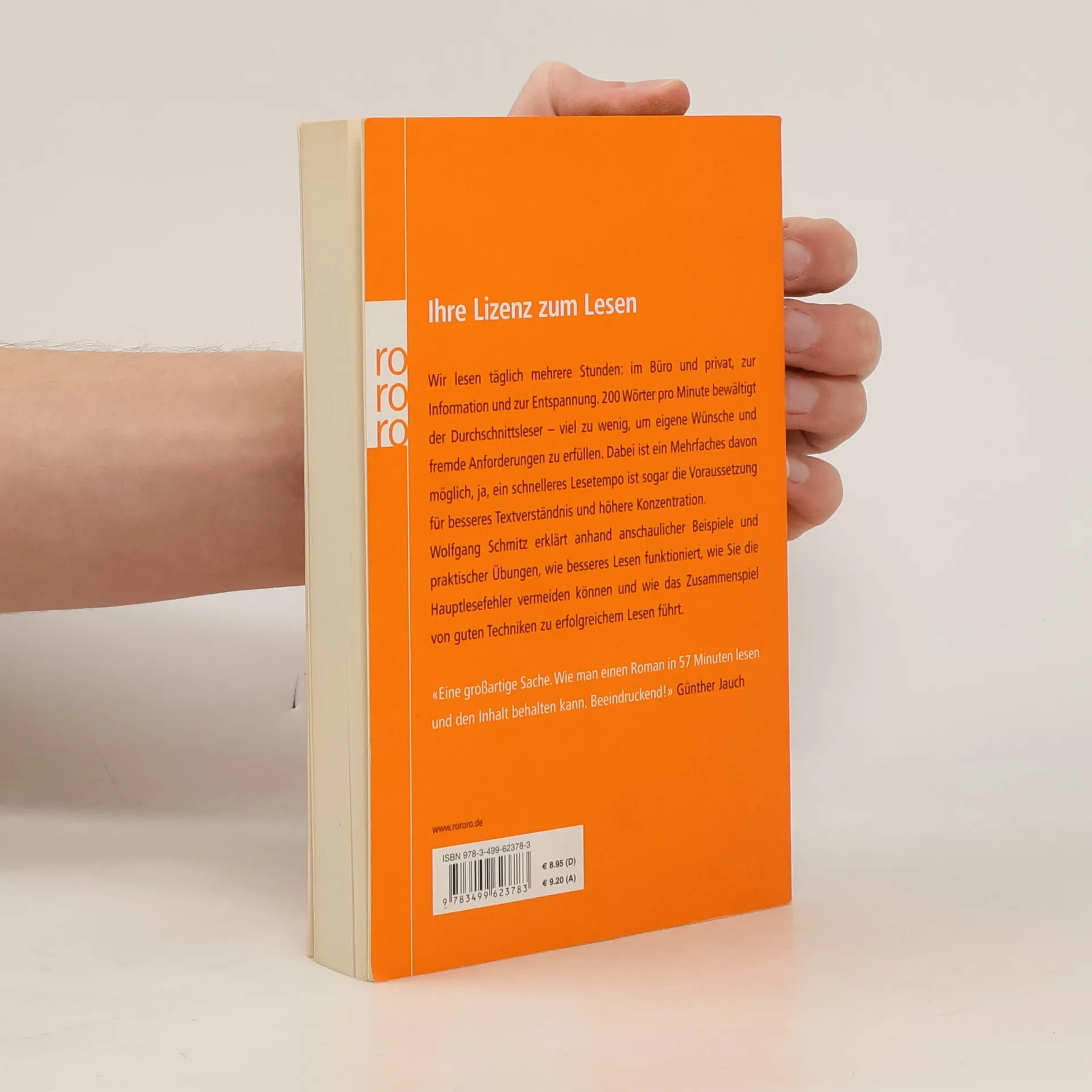 Ihre Lizenz zum LesenWir lesen täglich mehrere Stunden: im Büro und privat, zur Information und zur Entspannung. 200 Wörter pro Minute bewältigt der Durchschnittsleser - viel zu wenig, um eigene Wünsche und fremde Anforderungen zu erfüllen. Dabei ist ein Mehrfaches davon möglich, ja, ein schnelleres Lesetempo ist sogar die Voraussetzung für besseres Textverständnis und höhere Konzentration. Wolfgang Schmitz erklärt anhand anschaulicher Beispiele und praktischer Übungen, wie besseres Lesen funktioniert, wie Sie die Hauptlesefehler vermeiden können und wie das Zusammenspiel von guten Techniken zu erfolgreichem Lesen führt.„Eine großartige Sache. Wie man einen Roman in 57 Minuten lesen und den Inhalt behalten kann. Beeindruckend!“ (Günther Jauch)