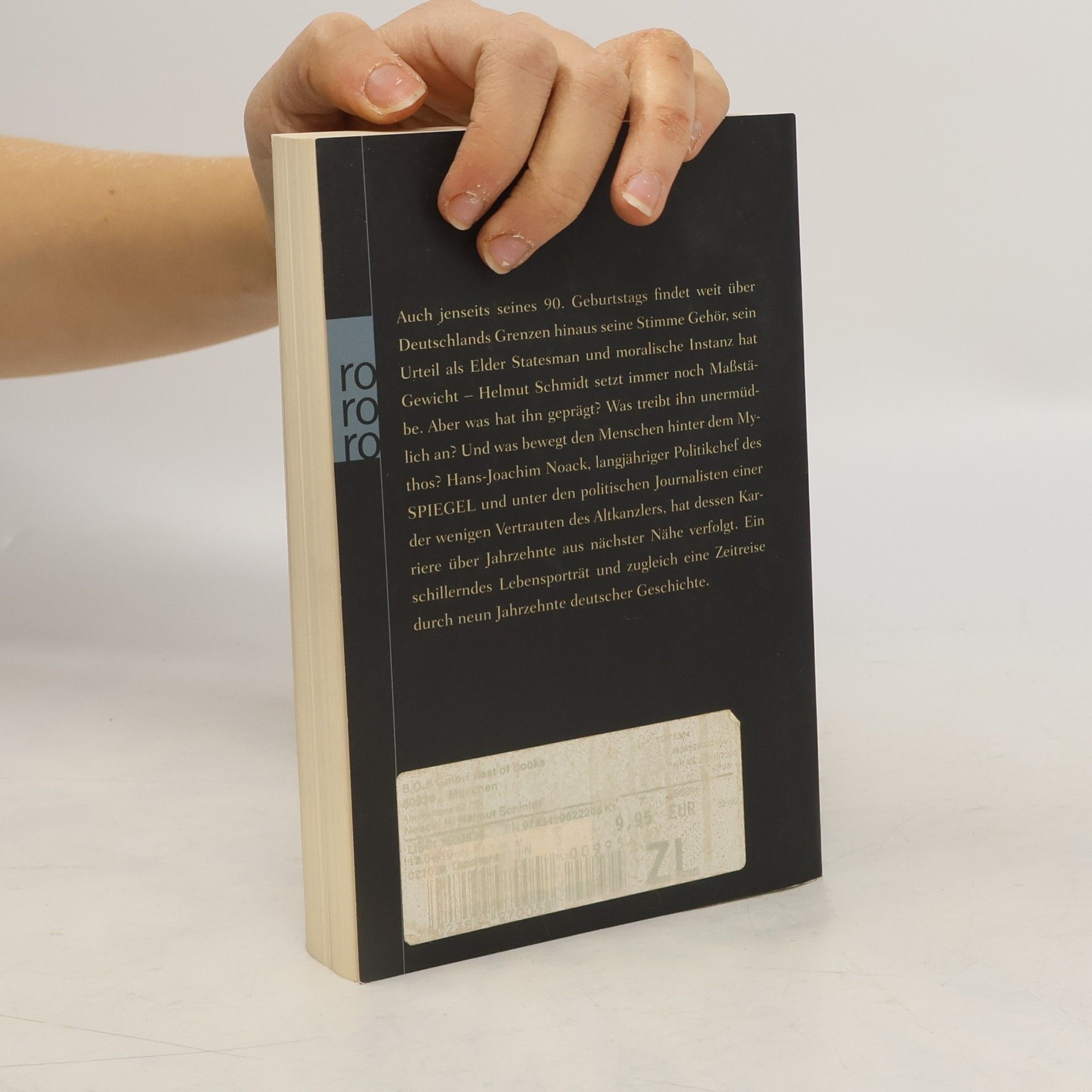 Dieser Titel ist zur Zeit als Hardcover-Sonderausgabe mit ISBN 978-3-87134-840-2 lieferbar. Seine Stimme fand weit über Deutschlands Grenzen hinaus Gehör, sein Urteil als Elder Statesman und moralische Instanz hatte Gewicht. Helmut Schmidt hat Maßstäbe gesetzt wie kaum ein anderer deutscher Politiker der Nachkriegszeit. Aber was hat ihn geprägt? Was trieb ihn unermüdlich an, bis weit ins hohe Alter? Und was bewegte den Menschen hinter dem Mythos? Hans-Joachim Noack, langjähriger Politikchef des SPIEGEL und unter den politischen Journalisten einer der wenigen Vertrauten des Altkanzlers, hat dessen Karriere über Jahrzehnte aus nächster Nähe verfolgt. Ein schillerndes Lebensporträt und zugleich eine Zeitreise durch fast ein Jahrhundert deutscher Geschichte. «Helmut Schmidt wird uns allen als ein Mensch in Erinnerung bleiben, der in seltener Einheit ein Mann der Tat, des klaren Gedankens und des offenen Wortes war.» Joachim Gauck