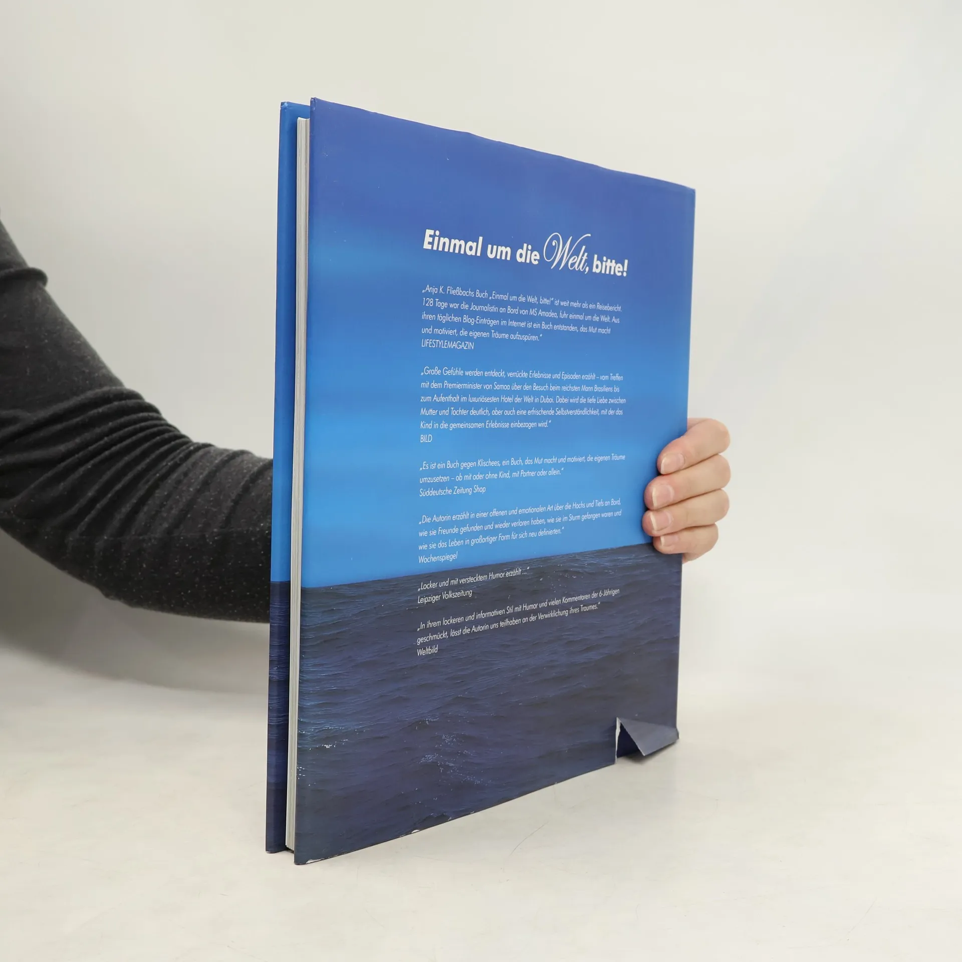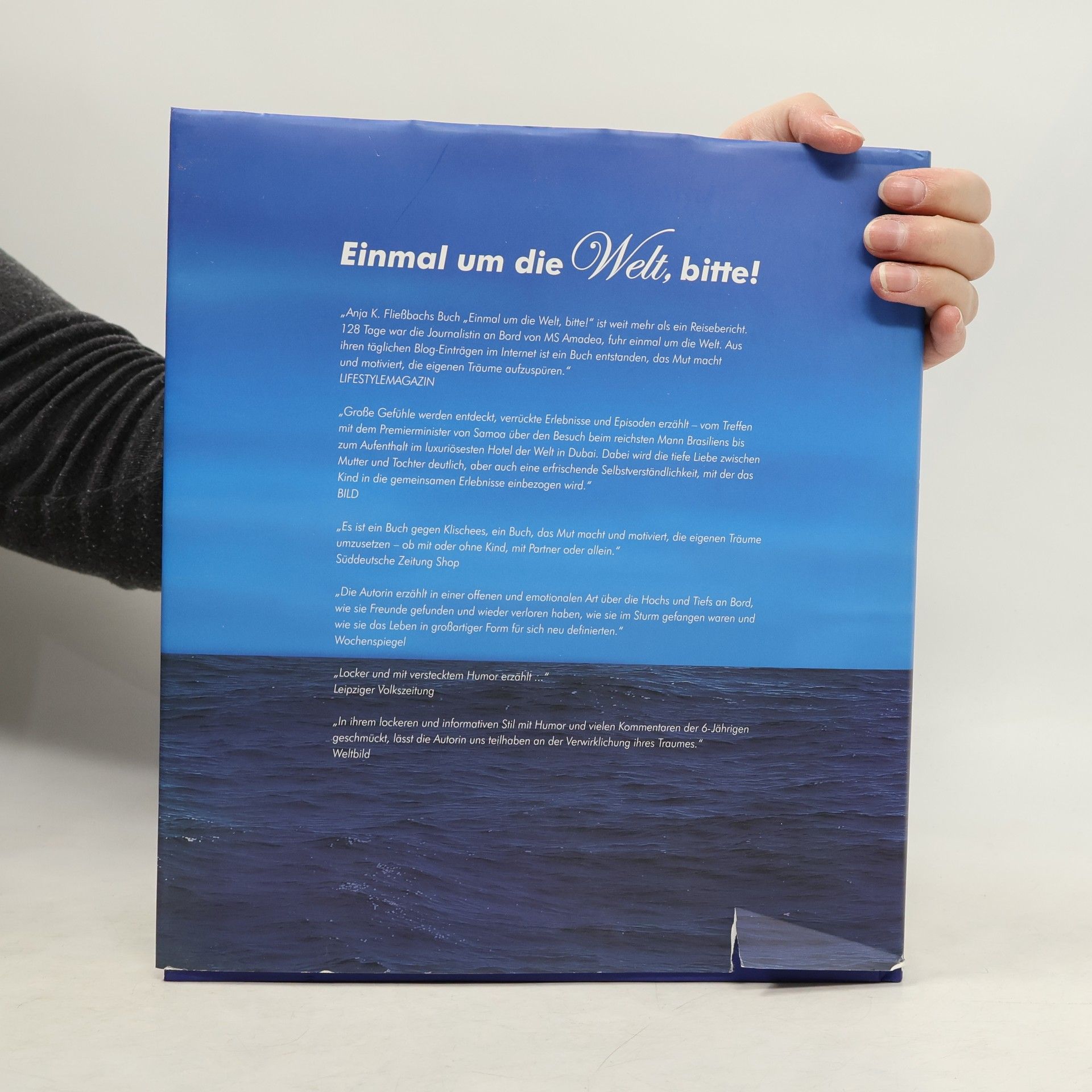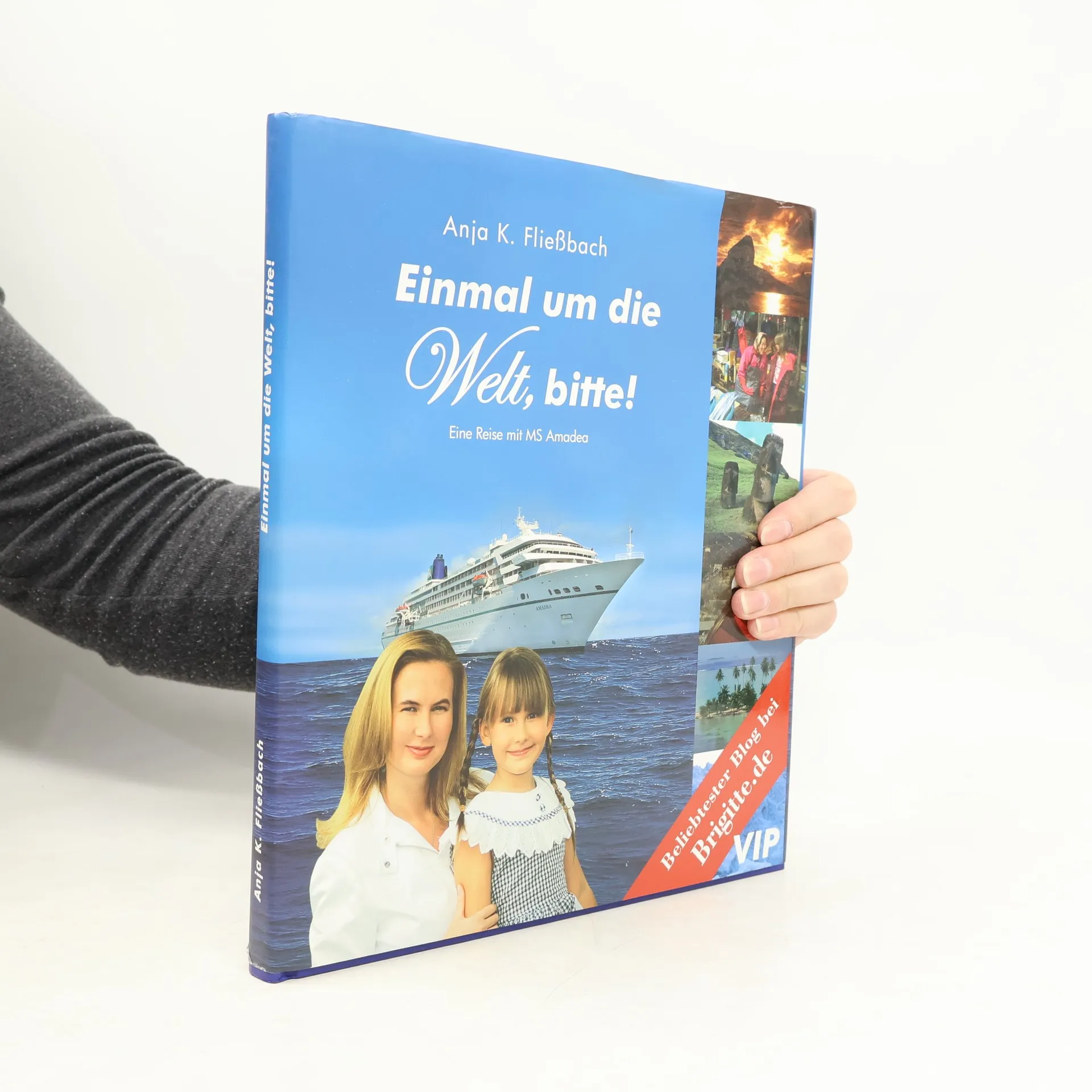 In „Einmal um die Welt, bitte!“ erzählt Anja K. Fließbach wie sie mit ihrer 6-jährigen Tochter Louisa in 128 Tagen auf einem Kreuzfahrtschiff um die Wwelt fuhr - 74 Häfen, 100 Länder. In ihrem lockeren und informativen Stil, mit verstecktem Humor und vielen Kommentaren der 6-jährigen geschmückt, lässt die Autorin uns teilhaben an der Verwirklichung ihres Traums. Sie erzählt in einer offenen und emotionalen Art über Hochs und Tiefs an Bord, wie sie Freunde gefunden und wieder verloren haben, wie sie im Sturm gefangen waren und wie sie das Leben in großartiger Form für sich neu definierten. Es ist ein Buch gegen Klischees, ein Buch, das Mut macht und motiviert, die eigenen Träume aufzuspüren und umzusetzen - ob mit oder ohne Kind, mit Partner oder allein