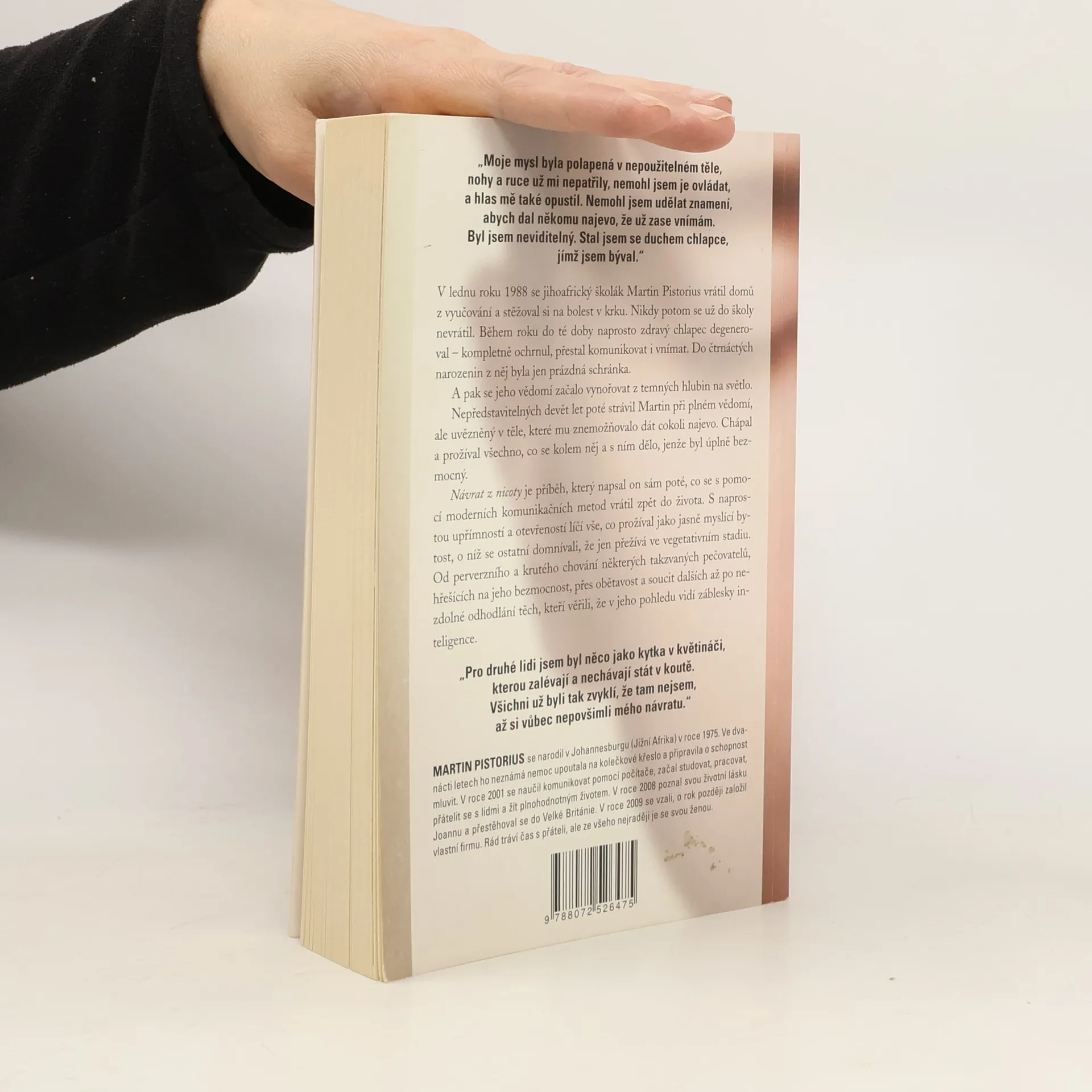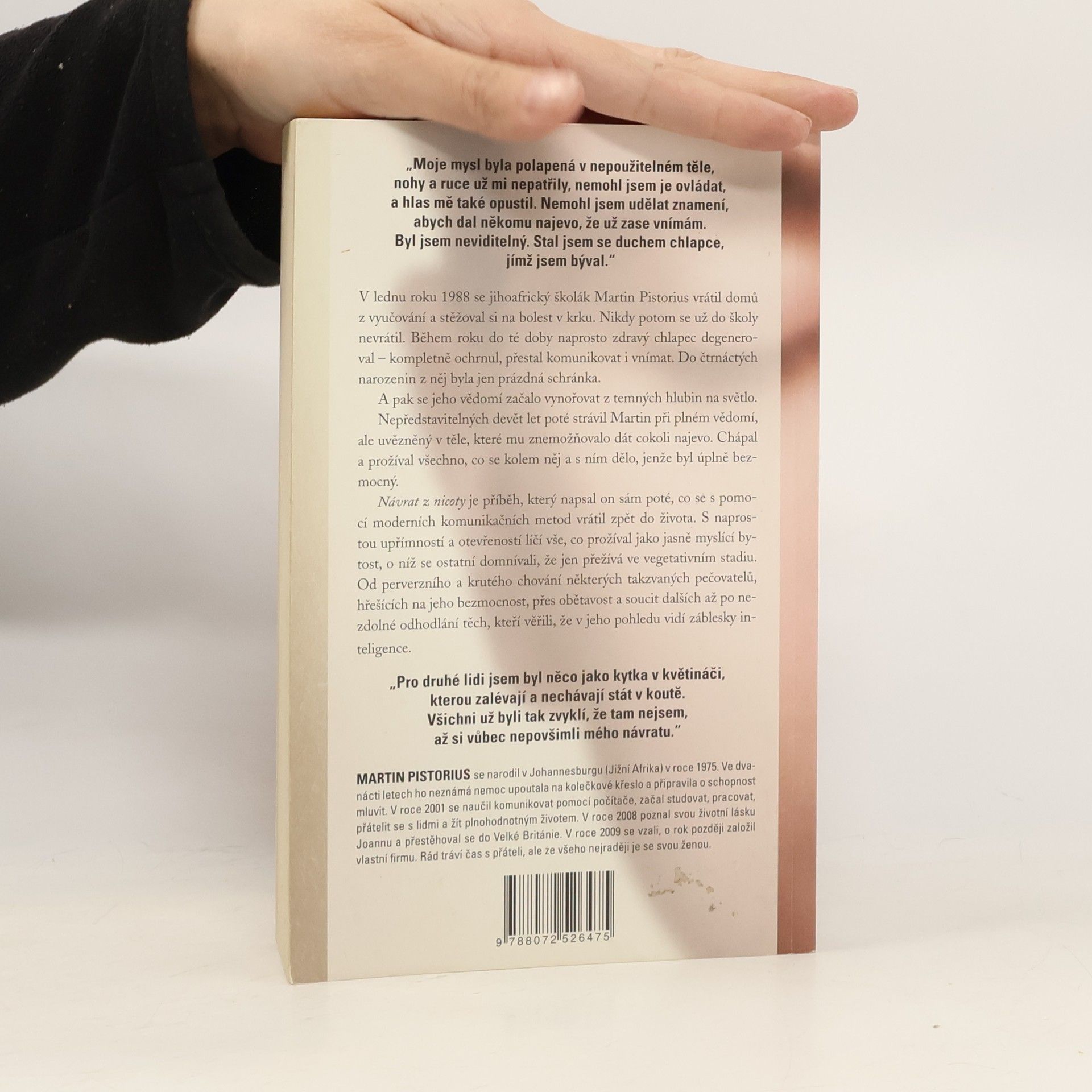 Strhující vítězství chlapce, jenž se stal vězněm vlastního těla Deset let žil ve vegetativním stavu a jen on sám věděl, že je při plném vědomí. Nyní vypráví svůj neuvěřitelný, úžasný a zároveň otřesný příběh, který se stal světovým bestsellerem. V lednu roku 1988 se jihoafrický školák Martin Pistorius vrátil domů z vyučování a stěžoval si na bolest v krku. Nikdy potom se už do školy nevrátil. Během roku dosud naprosto zdravý chlapec degeneroval – kompletně ochrnul, přestal komunikovat i vnímat. Do čtrnáctých narozenin z něj byla jen prázdná schránka. Nepředstavitelných deset let poté strávil při plném vědomí, ale uvězněný v těle, které mu znemožňovalo dát cokoli najevo. Chápal a prožíval všechno, co se kolem něj a s ním dělo, jenže byl úplně bezmocný, pokud šlo o komunikaci. Návrat z nicoty je příběh, který napsal sám Martin poté, kdy se s pomocí moderních komunikačních metod vrátil zpět do života. S naprostou upřímností a otevřeností líčí vše, co prožíval jako jasně myslící bytost, o níž se ostatní domnívali, že jen přežívá ve vegetativním stadiu. Od perverzního a krutého chování některých takzvaných pečovatelů, hřešících na jeho bezmocnost, přes obětavost a soucit dalších až po nezdolné odhodlání těch, kteří věřili, že v jeho pohledu vidí záblesky inteligence.