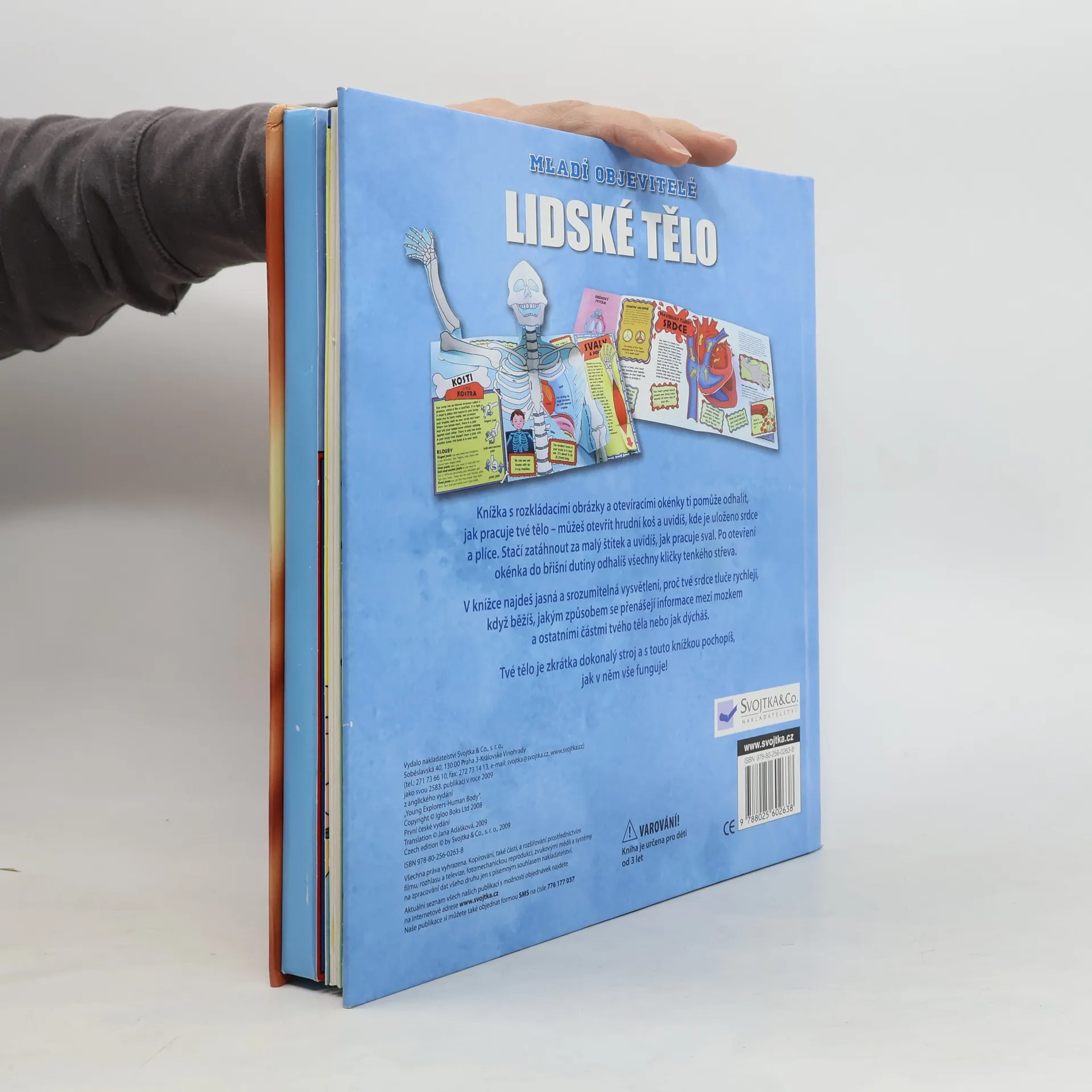 Naše tělo je úžasný „stroj" – dívej se a nauč se něco tom, jak funguje! V knížce najdeš mnoho rozkládacích a otvíracích okének se zajímavými informacemi, které se týkají stavby a fungování lidského těla. Ale pozor, nesmíš se polekat – ani panoramatické kostry! Knížka je určena všem malým začínajícím „doktorům či badatelům“, kteří se chtějí hravou formou a za pomoci srozumitelného textu a jednoduchých názorných obrázků dozvědět vše o lidském těle: kostře, kloubech, svalech, smyslech, mozku, nervovém systému, srdci, krevním oběhu, trávení, až po způsob dodávání energie či „vylučování odpadu“ z těla. A ještě něco navíc, chceš si sáhnout na „opravdové“ srdce? Na titulní straně najdeš jeho zajímavou maketu.