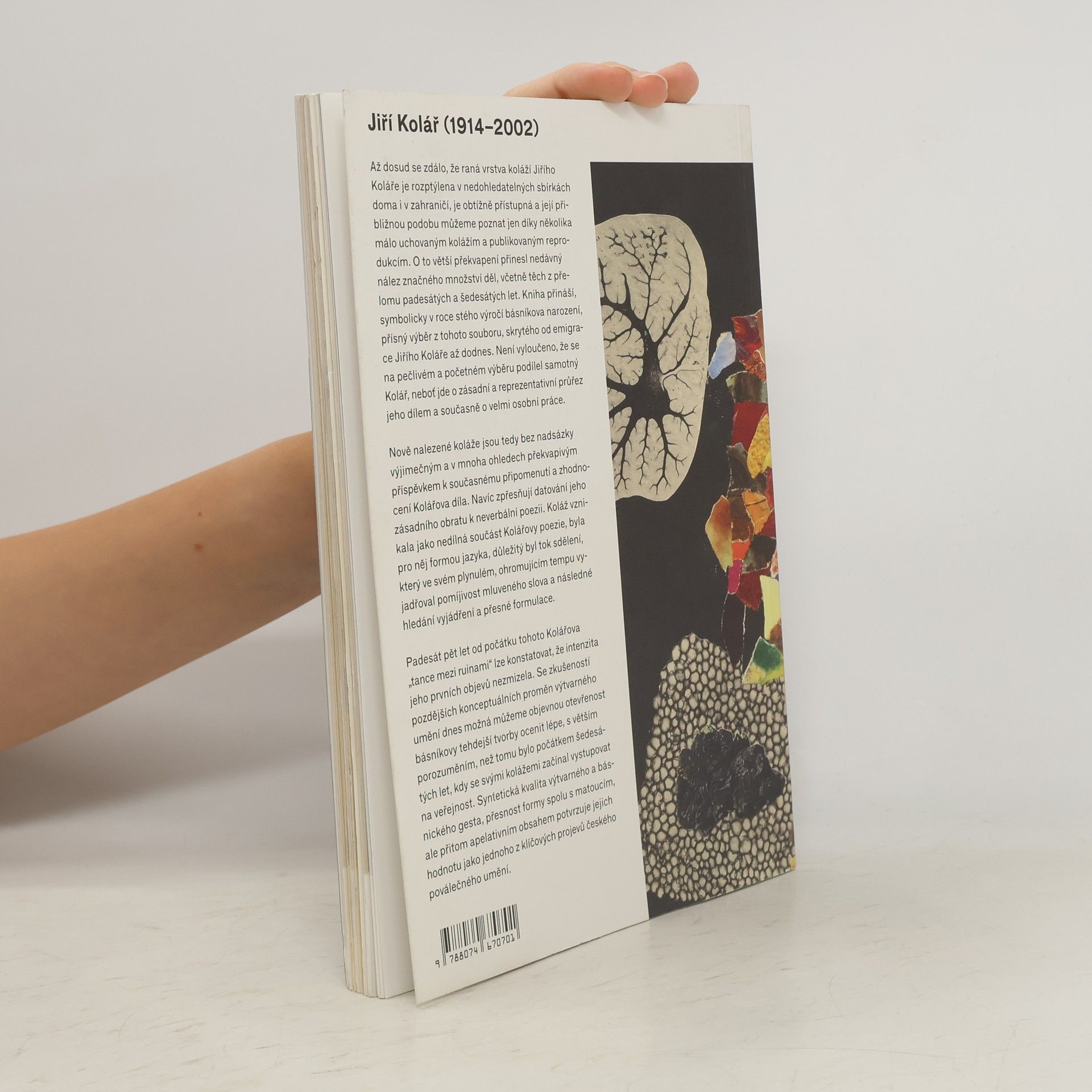 Až dosud se zdálo, že raná vrstva koláží Jiřího Koláře (1914-2002) je rozptýlena v nedohledatelných sbírkách doma i v zahraničí, je obtížně přístupná a její přibližnou podobu můžeme poznat jen díky několika málo uchovaným kolážím a publikovaným reprodukcím. O to větší překvapení přinesl nedávný nález značného množství děl, včetně těch z přelomu padesátých a šedesátých let. Kniha přináší, symbolicky v roce stého výročí básníkova narození, přísný výběr z tohoto souboru, skrytého od emigrace Jiřího Koláře až dodnes.